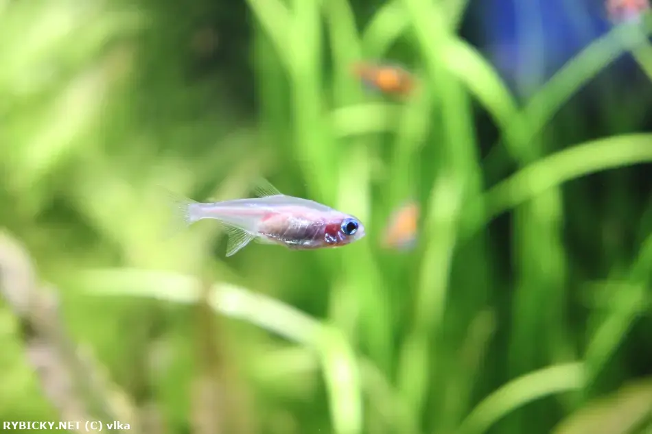 | Charakteristika: | Přes střed těla se táhne výrazný červený pruh, horní část těla je zlatá, spodní stříbrná. Je velmi choulostivá na vodní parametry, není to rybka určená pro chov začátečníkům. Miluje měkkou, mírně kyselou vodu, nejlépe filtrovanou přes rašelinu. Pozor na množství dusitanů ve vodě. Miluje hustě osázená akvária, která nesmí být příliš osvětlena. V žádném případě nesmí být vypuštěna do čerstvě založených nádrží. |