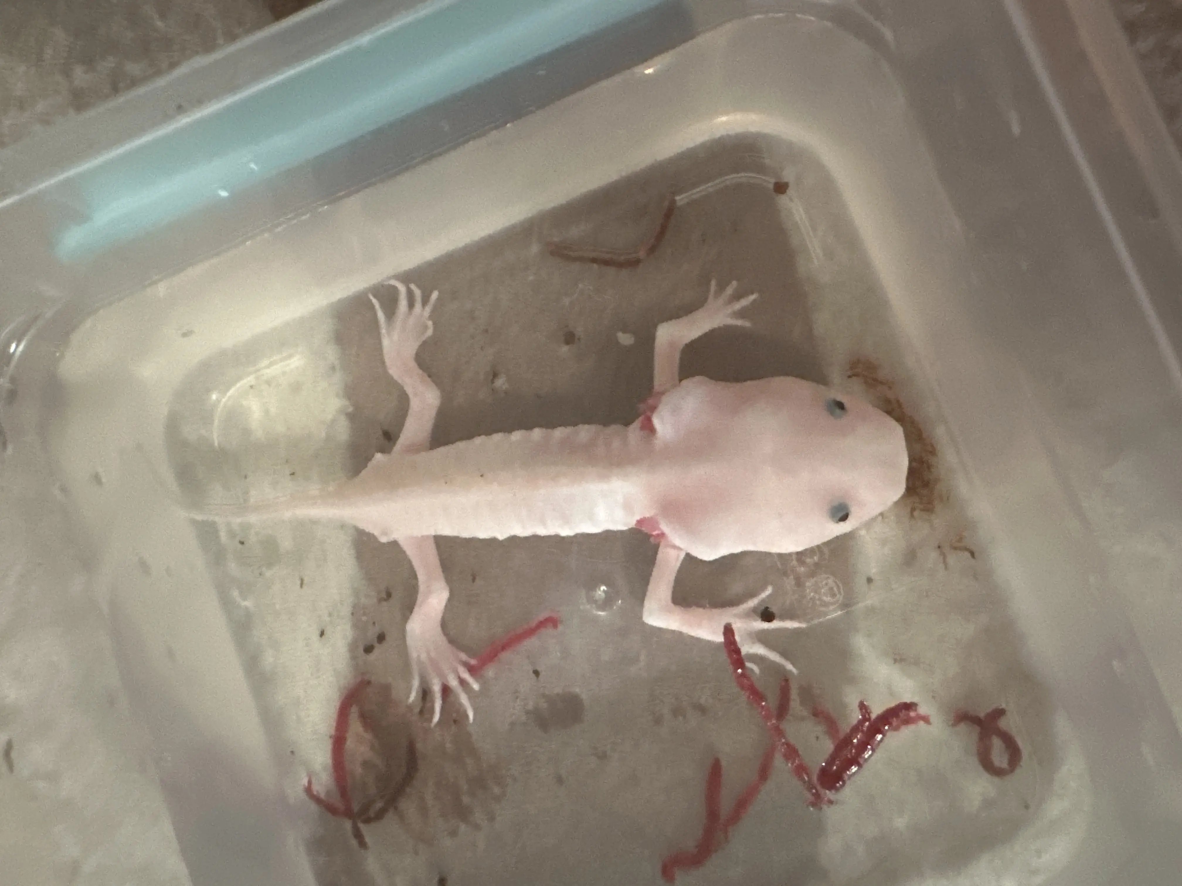 Můj axolotl je strašně hubený. Původně jedl žížaly, ty pak začal odmítat. Přešla jsem tedy na patentky. To si dal i 3 ty malé kostičky. Ale od včerejška odmítá i je. Přendala jsem ho do samostatného boxu a dala na krytý balkon s okny, aby tam měl tak akorát teplotu. Vodu jsem mu dala z filtrační konvice a odpoledne mu zkusila dát i nitěnky. Ovšem do úst si je vzal ale vyplivl je. Nechce jíst. Mam o něj hrozny strach, že pojde.