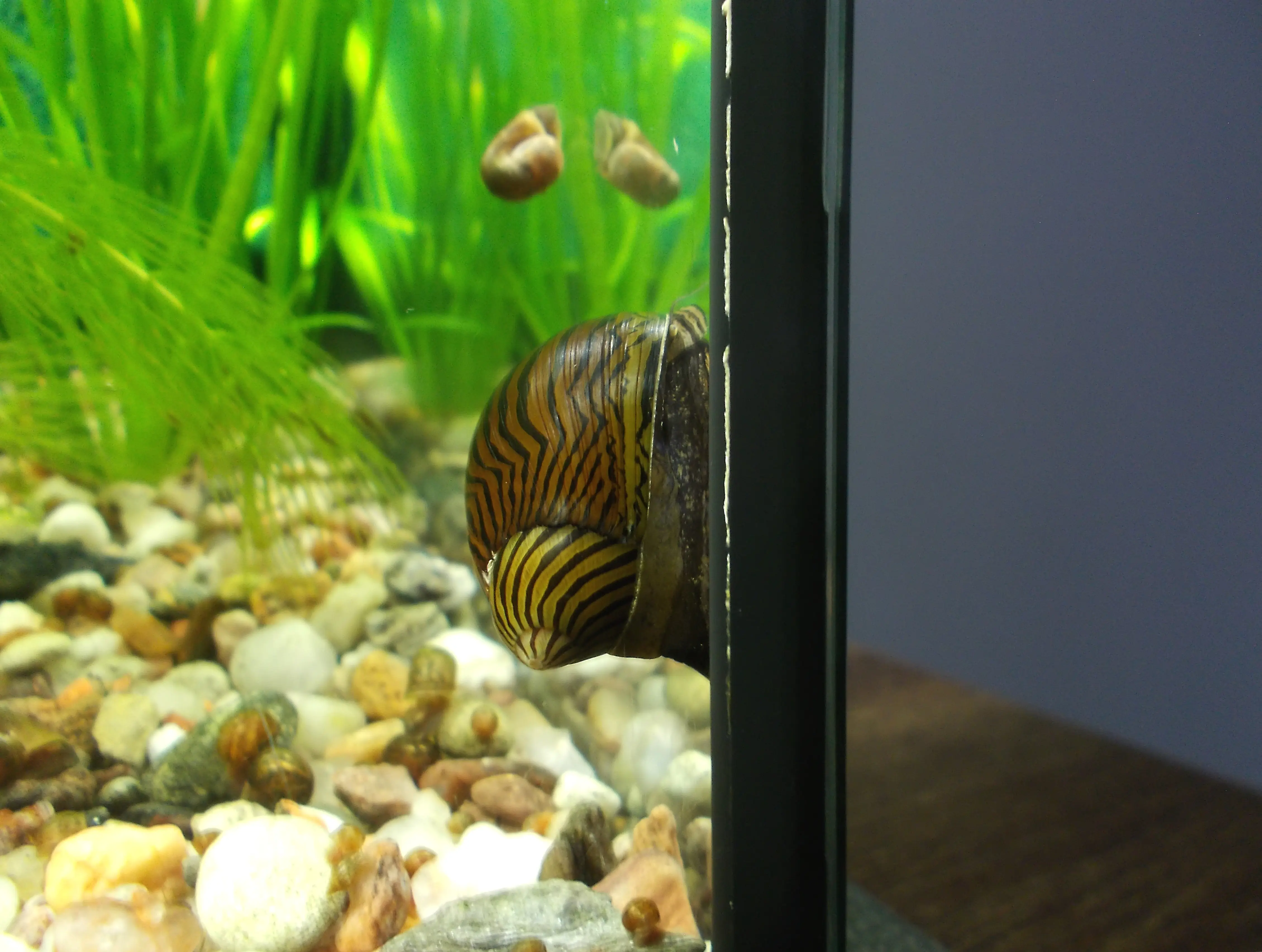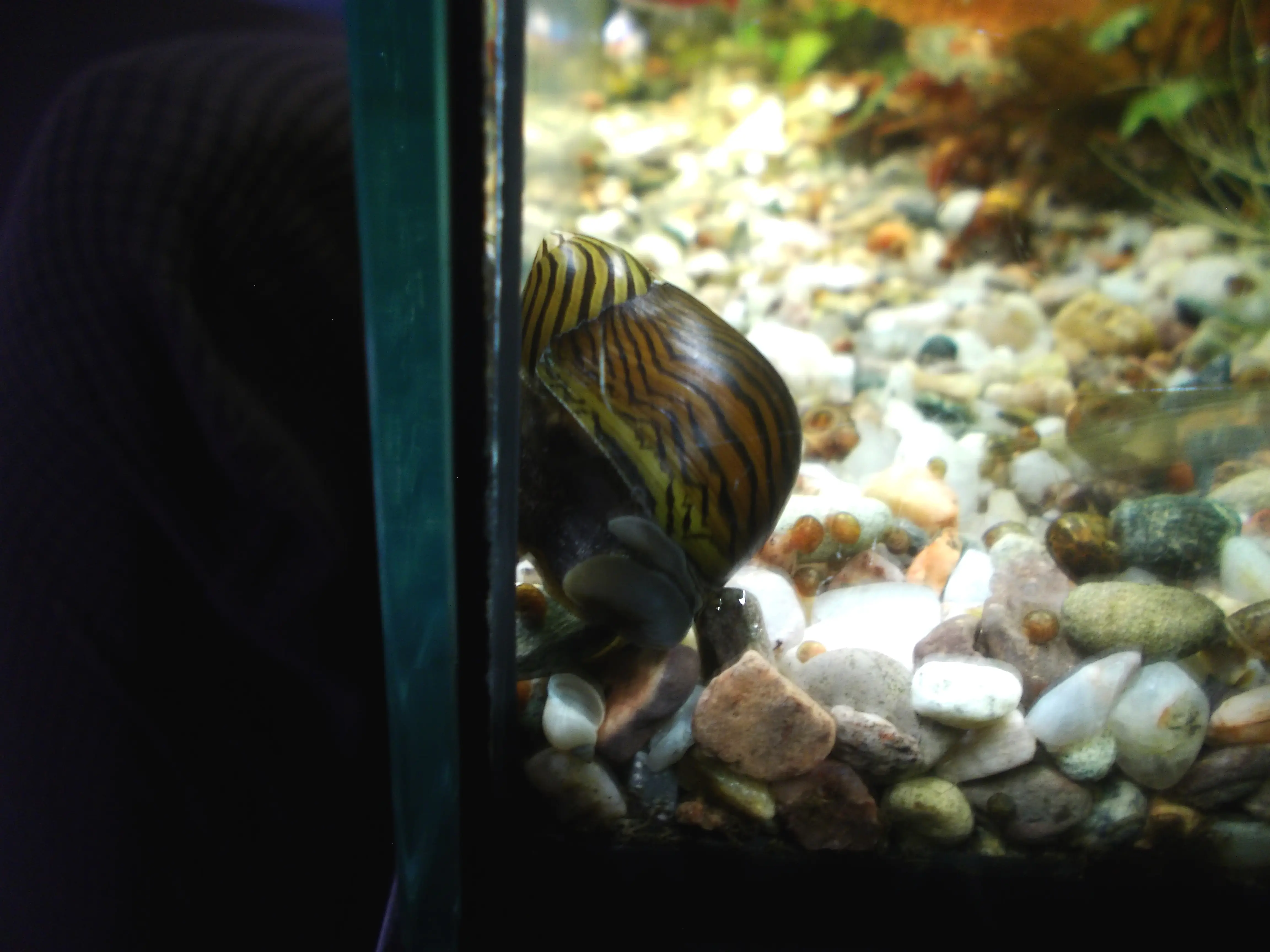 Nikdy jsem svoji ,,zebru,, neviděl baštit, takže asi žere ty řasy. Ale ta vajíčka, která klade ve velkém, to je síla. Nejdou ničím sundat...