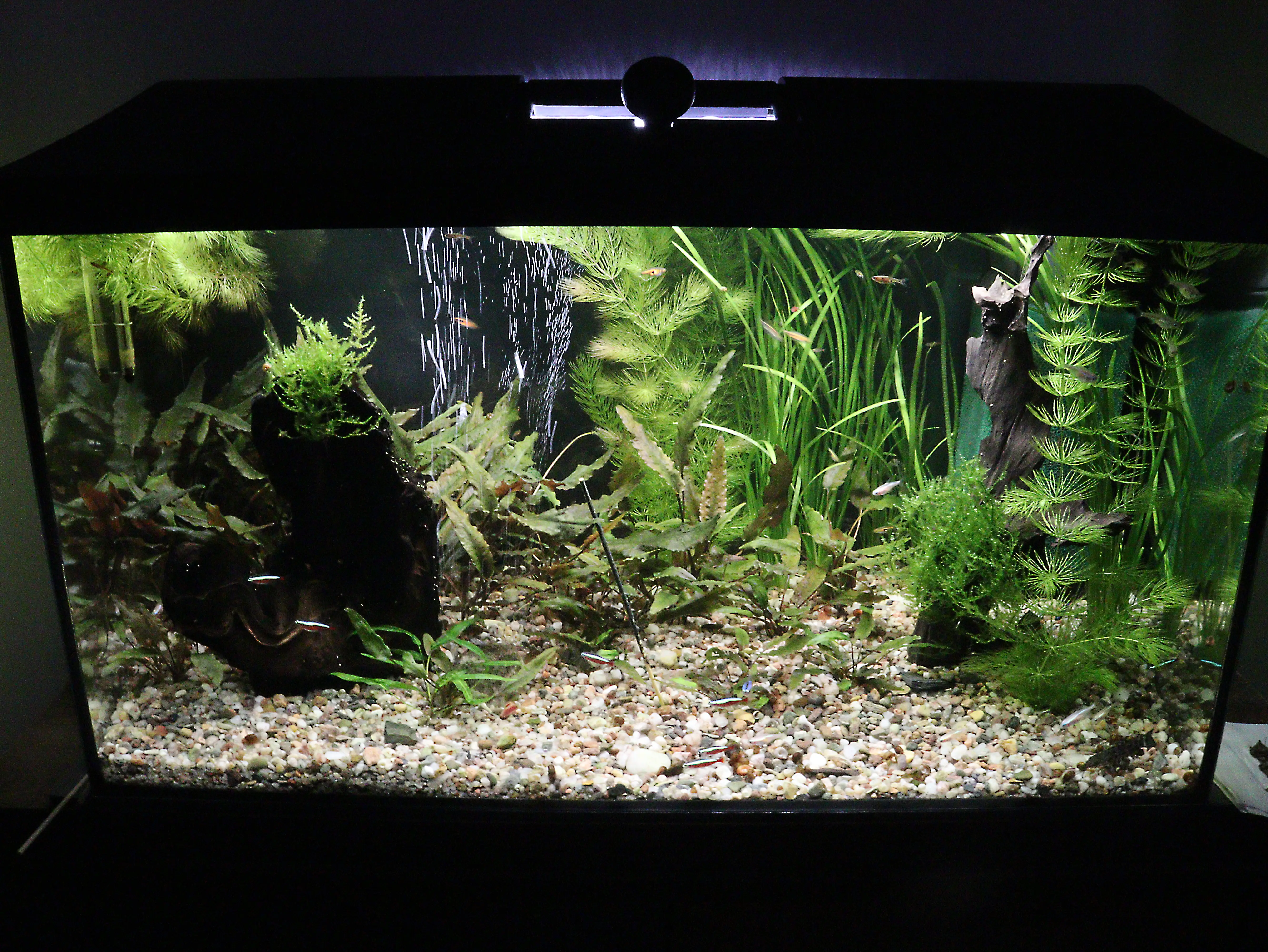 Mám v něm 15 neonek modrých, 1 starého přeživšího otíka, několik červených krevetek, kraba mekong, 1x ampulárku, 1x malou tylomelánii a 2x clithona...
