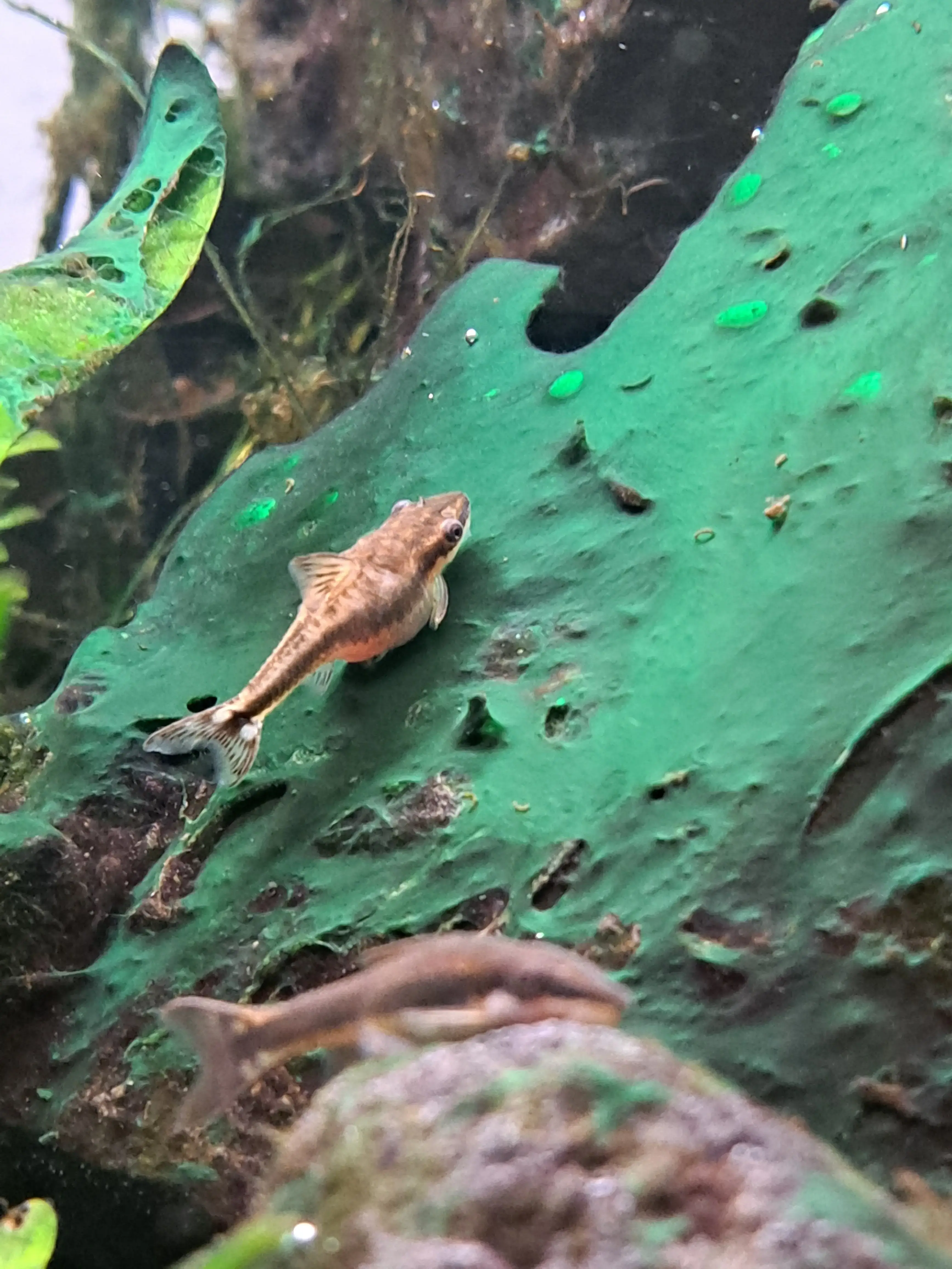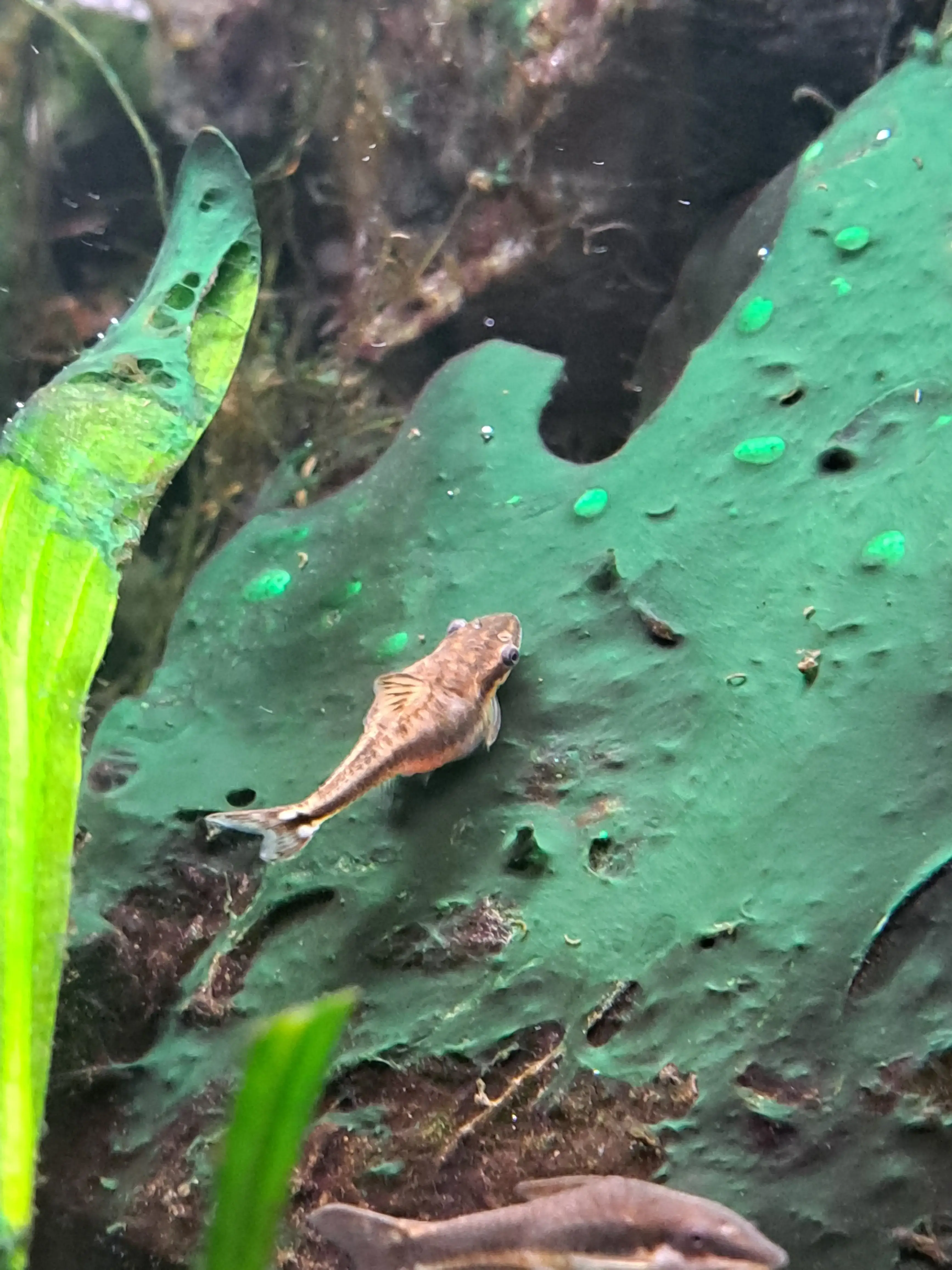 Mam krunýřovce tečkovaného (Hypostomus punctatus). Mam dva kousky a jediný čim se liší je velikost,tvar hlavy a malinkatý detaily na ploutvích..Všude sem jen slyšel že tyto ryby se v zajetí nerozmnožují nebo jen s pomocí hormonů..Mam 2 nebo 3 roky,tak se domnívam že by mohli být pohlavně dospělý, ten větší má něco přes 30 cm ten menší má tak o 5 cm míň..Jelikož sem jich dřív měl víc a a viděl jsem jak vypadaj jejich vzájemné souboje,tak si troufám tvrdit že to co se mi teď děje v akvárku jsou námluvy,protože ten větší neustále dolejzá za tim menšim. Neni to nic agresivního a ten menší vždycky jen vklidu chce odplavat a ten větší zase v klidu plave za nim..