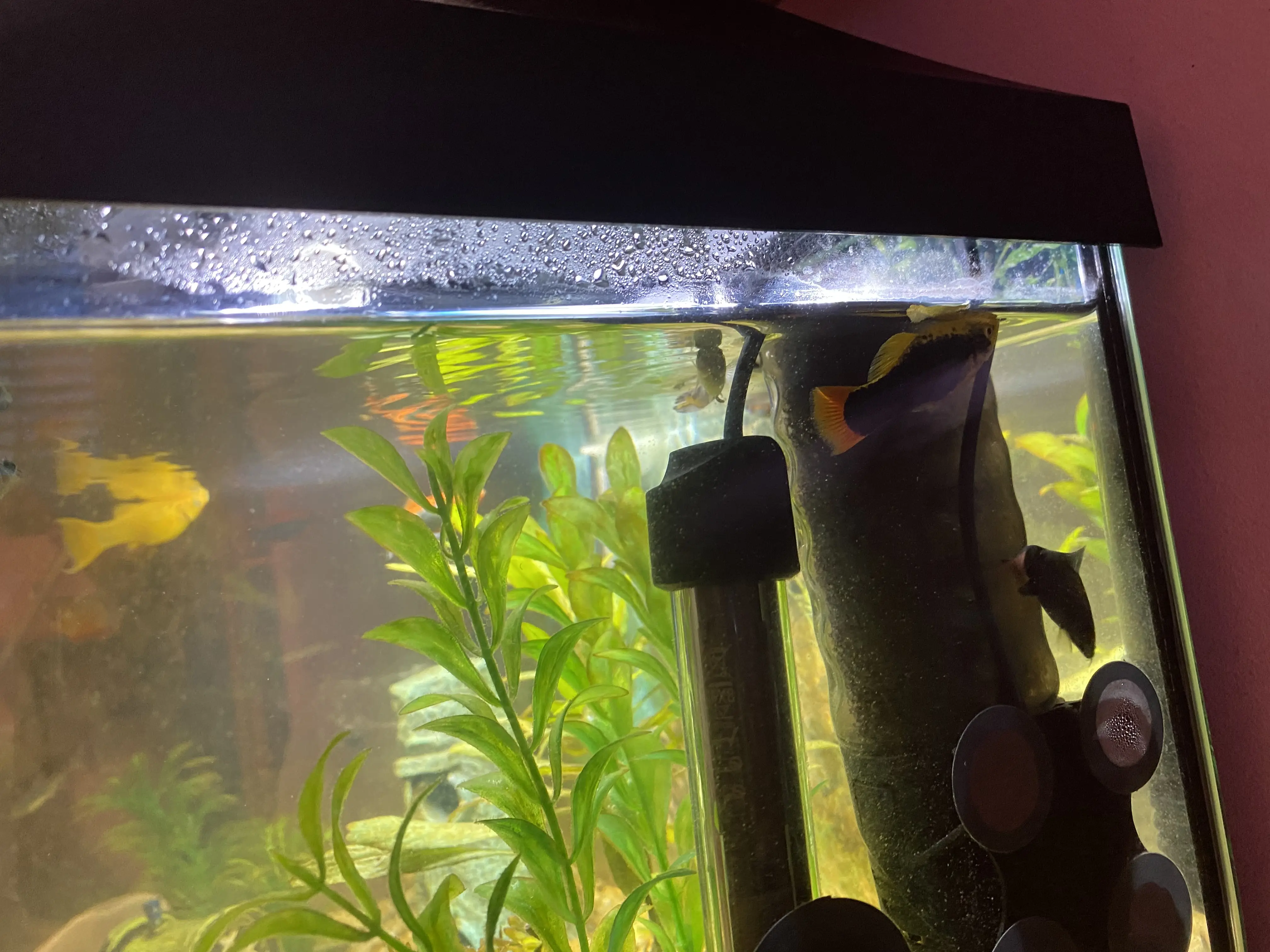 Dala som do akvária vzduchový kameň a rybky už nie su pri hladine, vyzerá to tak, že to pomohlo.