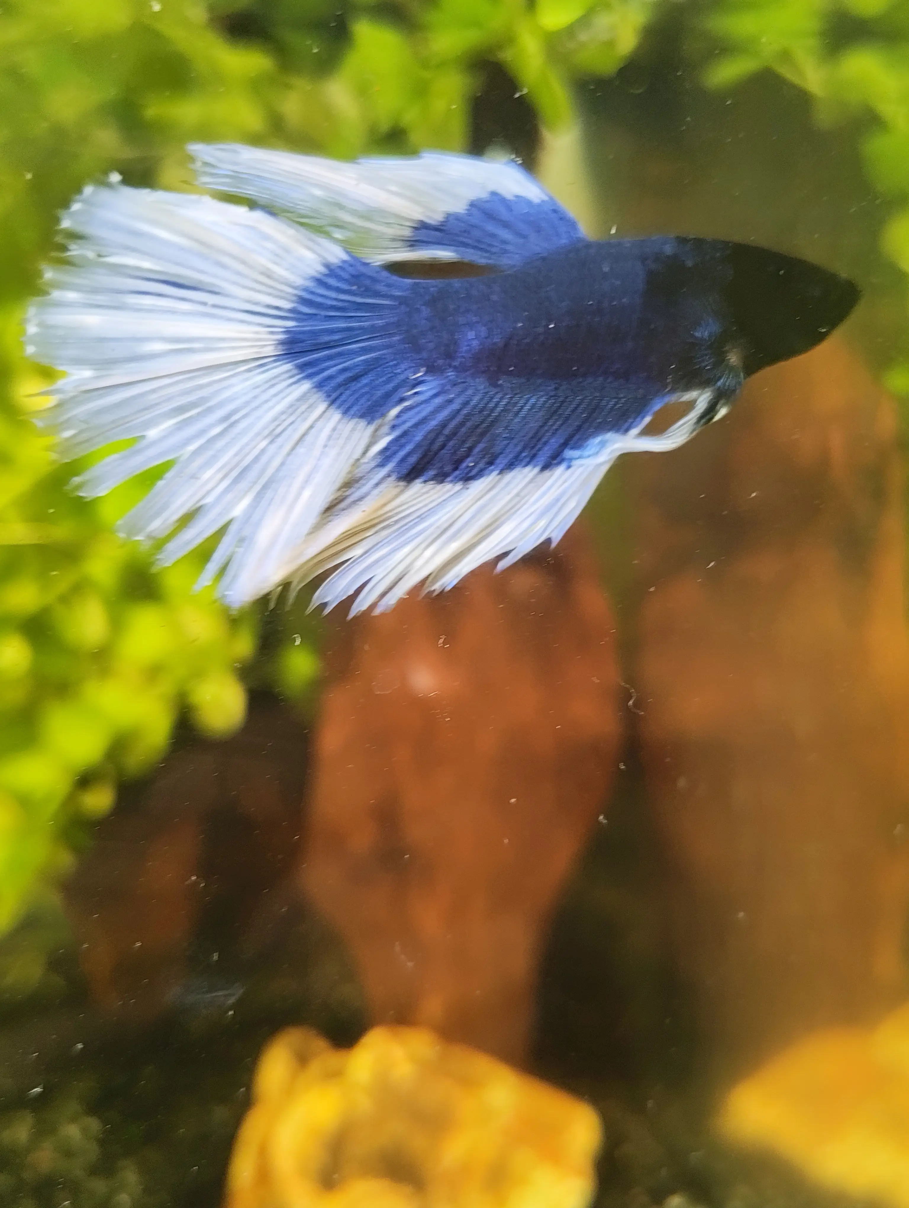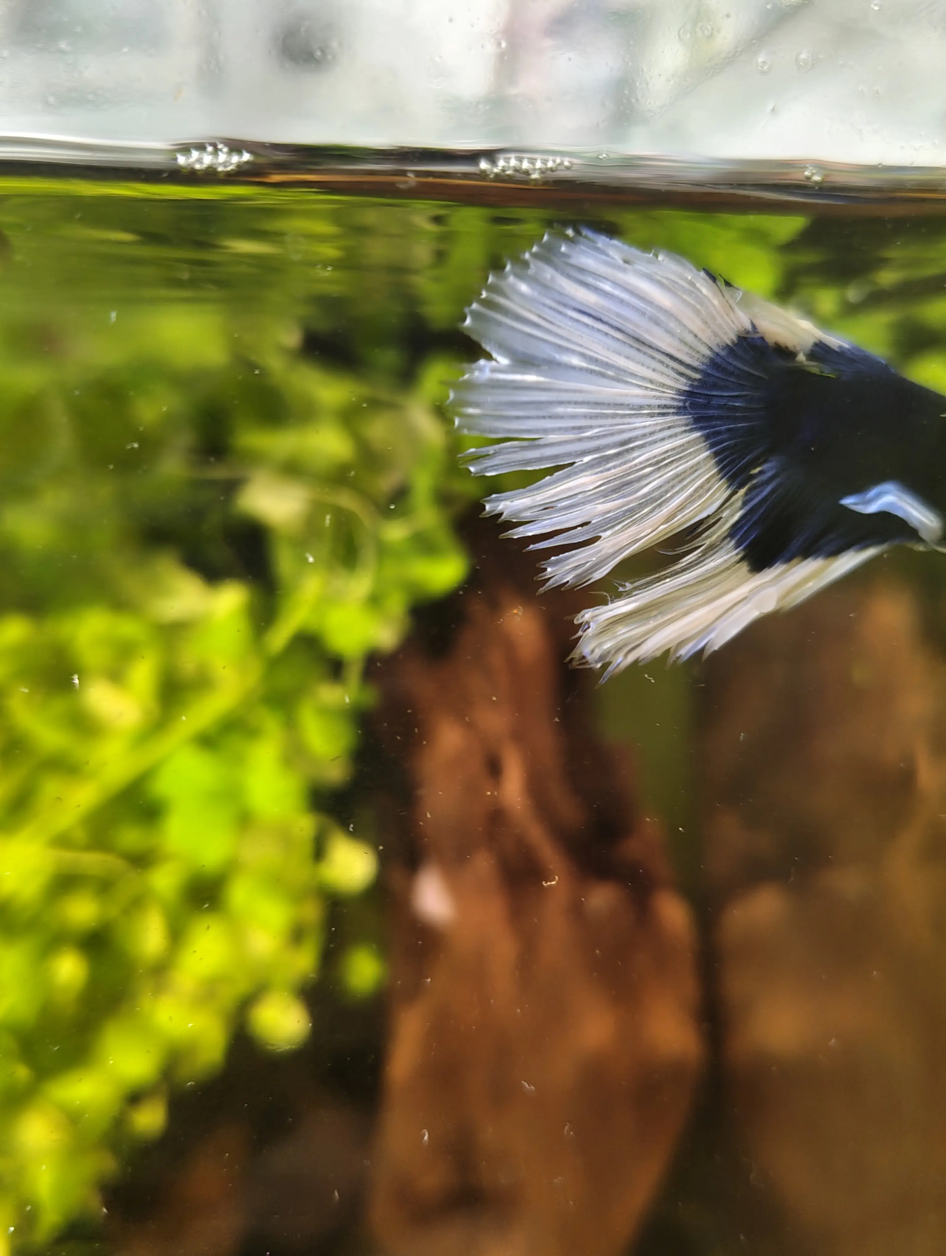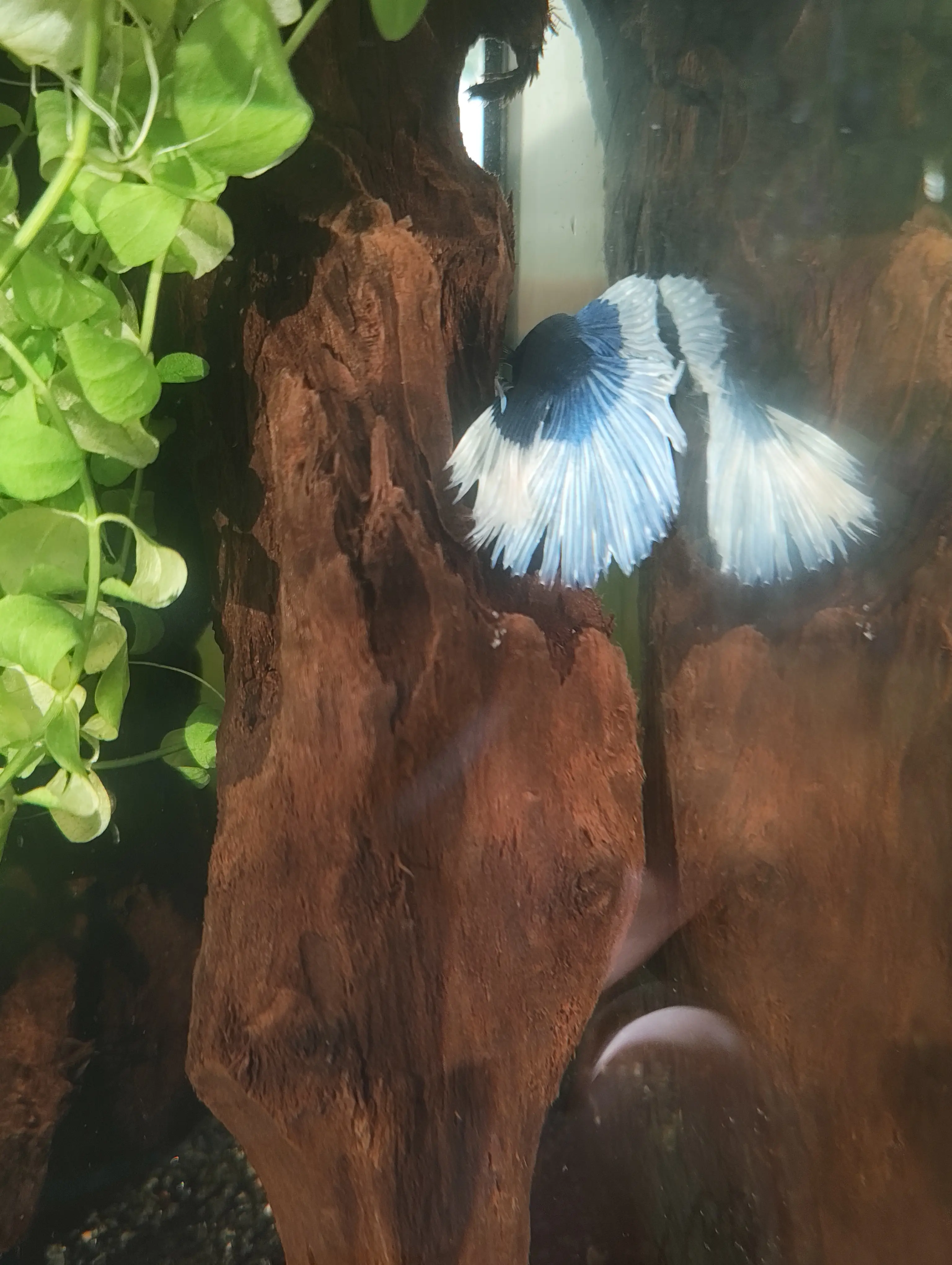 Beťák začal mít dírečku v ocasní ploutvi a postupně se mu během několika dní začaly dost třepit (viz foto ze dne pořízení a dnes). Do toho má tmavý flek na hřbetě. Působí unaveně, už tolik neplave. Dnes hodně odpočíval na filtru.