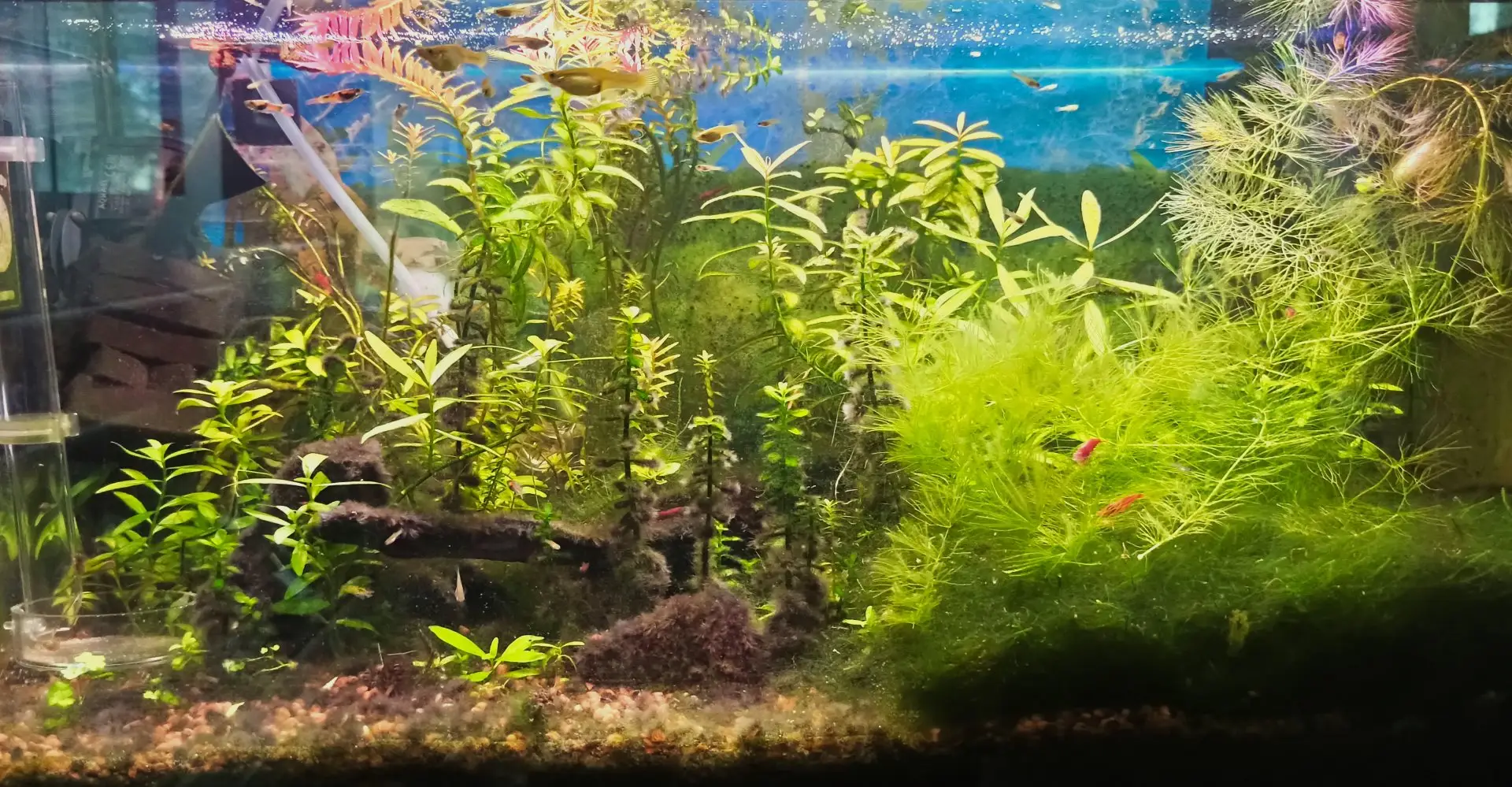 | 5 10.2025 | Včera jsem poprvé pozoroval čtyři mladé krevetky, které při velikosti zhruba poloviční oproti dospělým opustily úkryt, pásly se na jávském mechu a egerii a prozkouávaly i další místa v akváriu. Doteď jsem zahlédl vždy max jednu, jak prolézá mechem, nebo ji objevil v kýbli po výměně vody. |