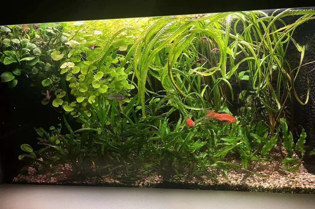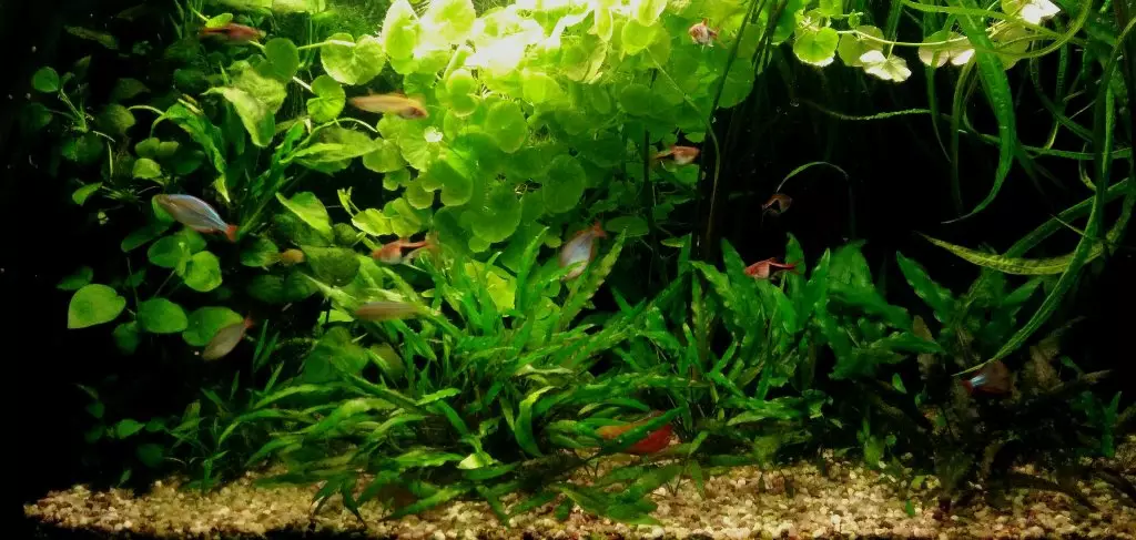 Byla jsem vyzvána, ať to tady zaktualizuju..Hm, není moc co psát, rybky spokojeně plavou, kytky spokojeně rostou (teda ty, kterým se u mne líbí), už nemám další ambice zkoušet nové a nové druhy (low tech je v tomhle dost limitující). Akvárko je zarostlé, přestože hnojím maličko, konečně tam nikdo nikoho nehoní, různé druhy ryb se víceméně kamarádí (rybí polívka je oblíbená formace), stařečci dále stárnou a mlaďoši rostou. Čistím nanejvýš jednou za měsíc a zřejmě to stačí. Že by konečně rovnováha? Jen to nezakřiknout ;-)
