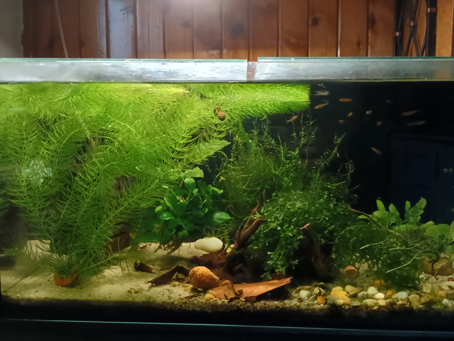 vyndat růžkatec i anubias a chytila jsem je spíš tak jakože omylem. Pak údržba, vrácení kytek a přesun 16ti pancéřníčků, co prošli krásně karanténou, třech minikrevetek, co využili čas na to aby vyrostli, a nakrmeno nalíhnutou artemkou. Takže ode dneška nádrž pouze krevety, pancéřníčci a mikro razborky |