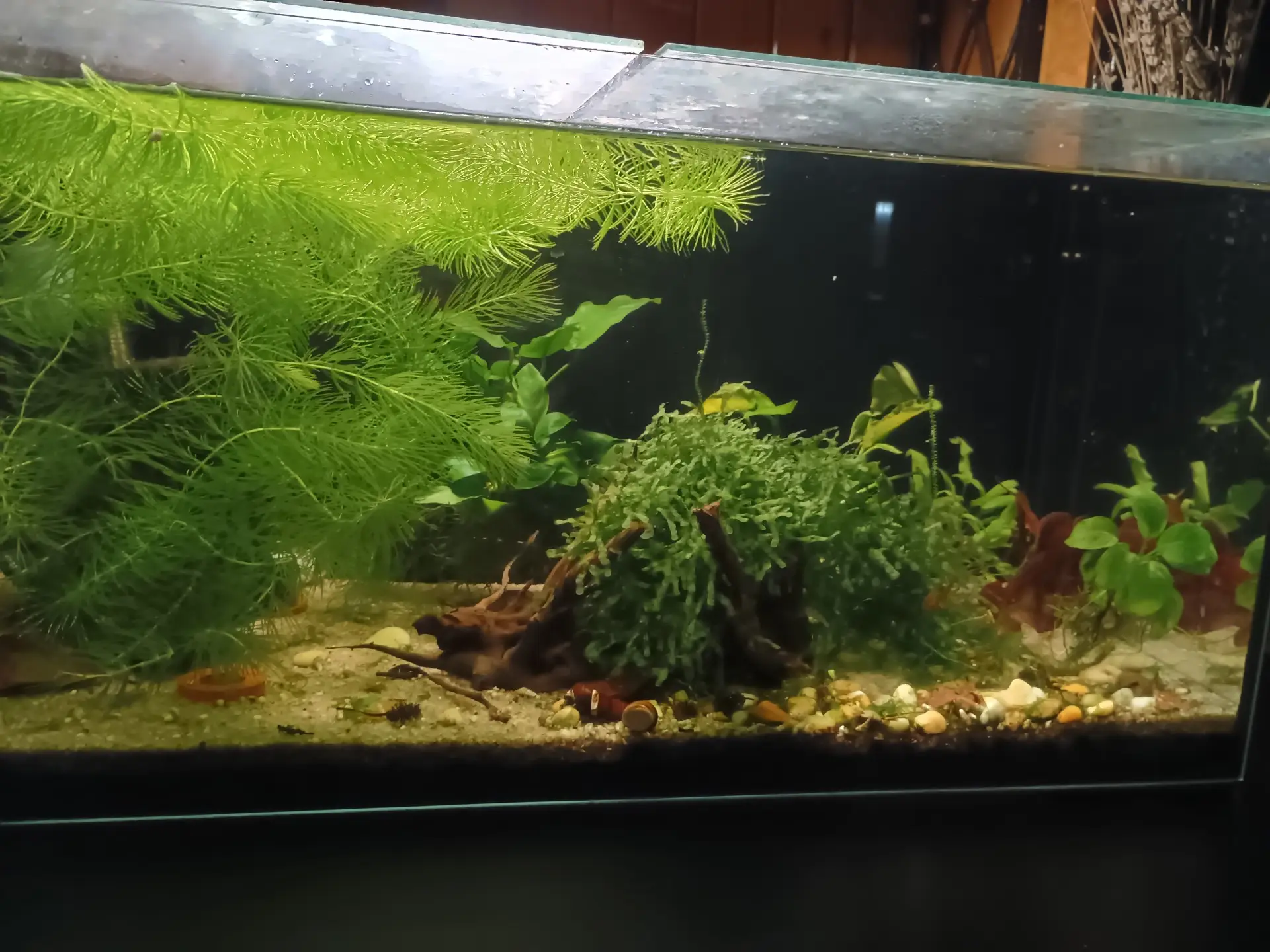 | 1 1.2026 | Zadní měch chytá řasu, tak jsem ho celý vyndala a místo něj dala jeden menší anubias a tu hnědovku, co se docela hezky chytla v akva Louže |