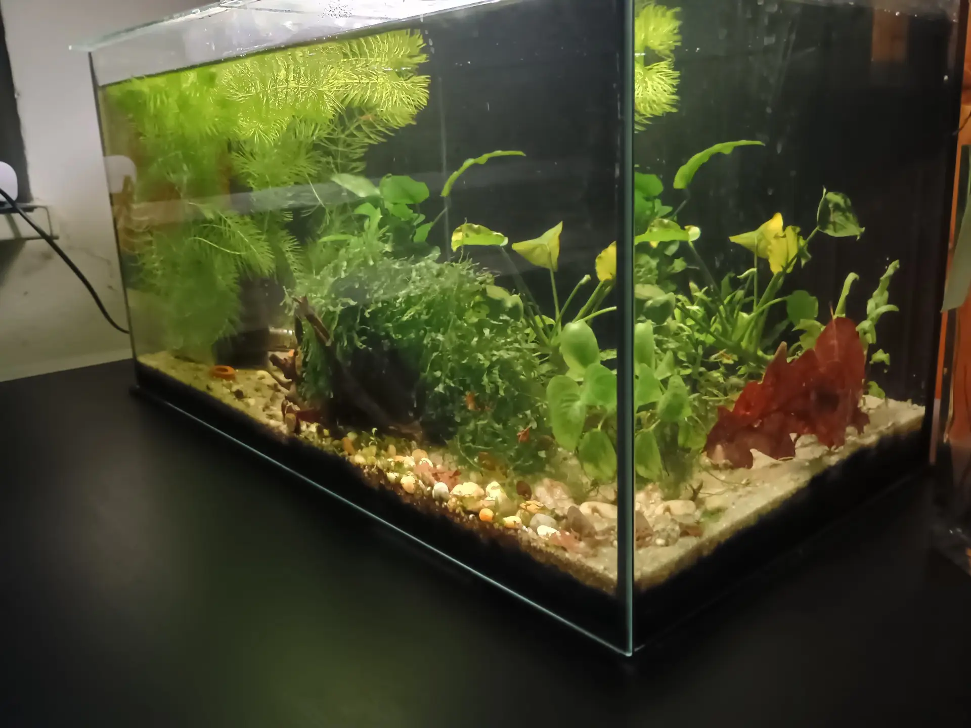 vyndat růžkatec i anubias a chytila jsem je spíš tak jakože omylem. Pak údržba, vrácení kytek a přesun 16ti pancéřníčků, co prošli krásně karanténou, třech minikrevetek, co využili čas na to aby vyrostli, a nakrmeno nalíhnutou artemkou. Takže ode dneška nádrž pouze krevety, pancéřníčci a mikro razborky |