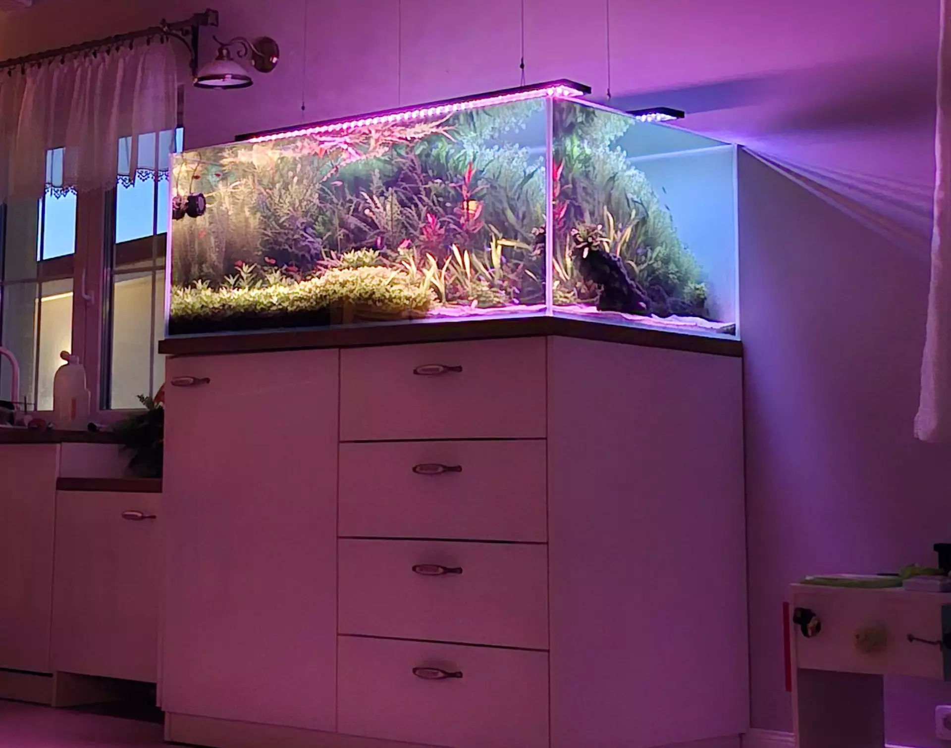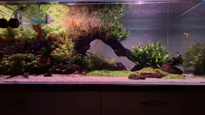 Údržba: 1x za 2 týdny. Výměna cca 30% vody, protrhání a zastřižení kytek, očištění skel a Eheim skimeru. Pod akva mám odpad i přívod vody, takže rychlá akce. A když mě chytne blbá, tak zastřihnutí kompletně celé parvulky.