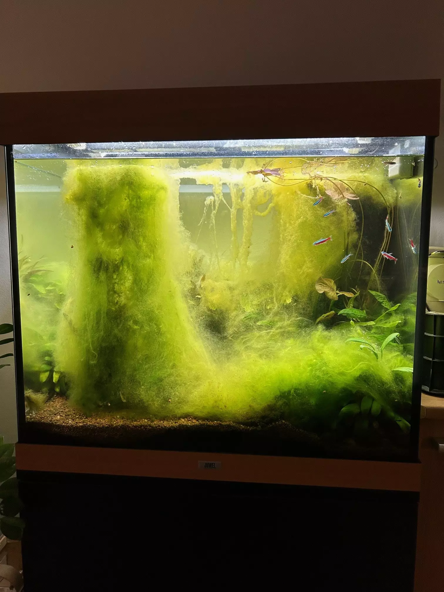 Odkaleni, cisteni vody, ocista filtracnich naplani, vymena Biopad za vatu, vymena vody 8x konve po 8l. Stav ryb: ancik, cca 15neonek. rasokoule 2x. vyhozeni spousty kytek a zelene rasy