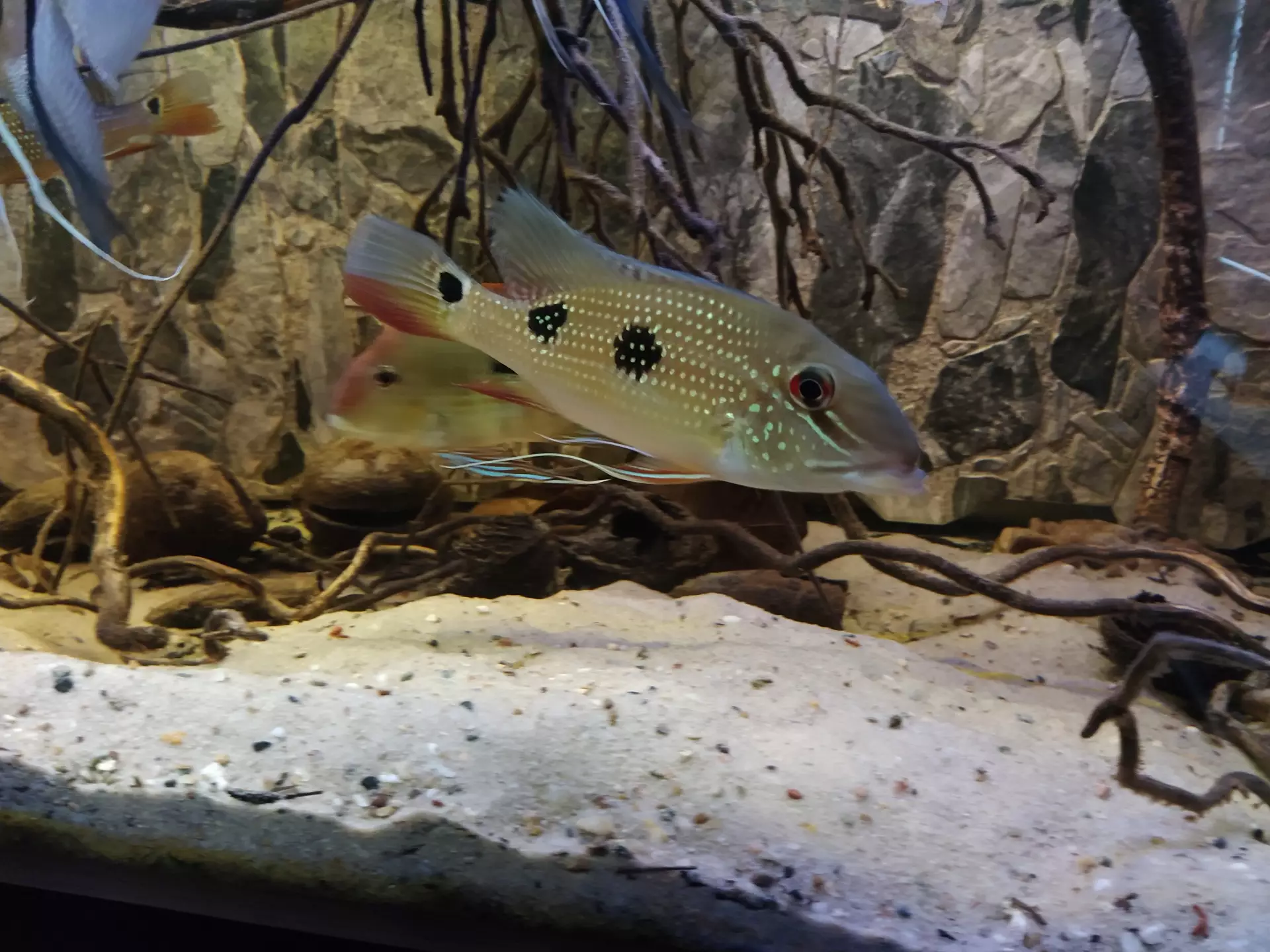 | 10 12.2018 | Takže kluci: Geoohagus(satanoperca) Deamon Je to malá čudla, jedna tečka na těle, proužkovaný červeno-bílý ocásek. Trocha perleti na těle. |