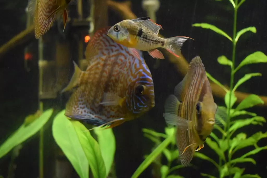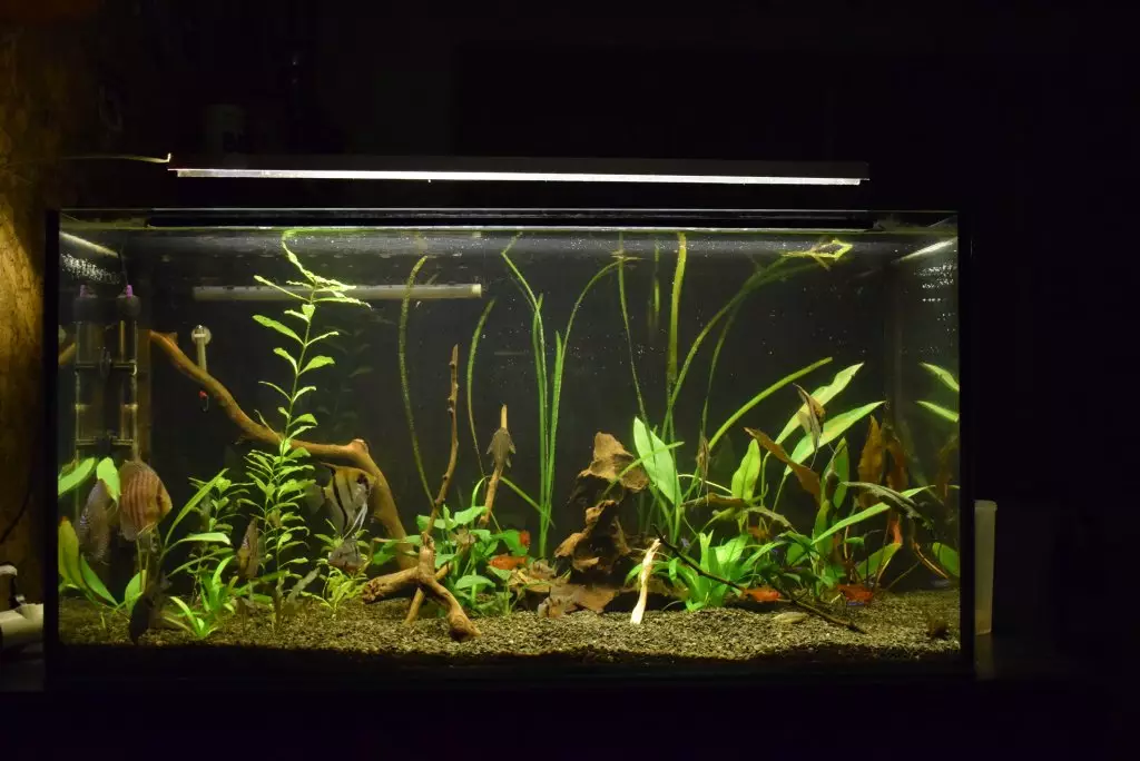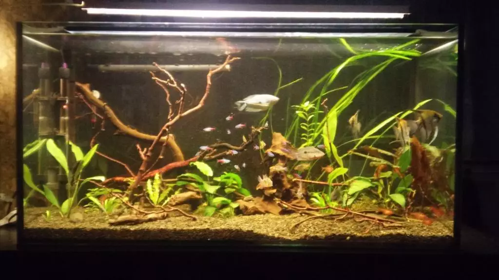 Popis: Původně bylo akvárium založeno jako společenské, postupem času se ho snažím přiblížit osádkou a vzhledem Blackwater. Přidal jsme kořeny a větve, rostliny jsou stále směsí biotopů. Skladba ryb je až na čichavce Jižní Amerika. Uvažuji o výměně dna za písčité a doplnění plovoucích rostlin. Rád bych časem pořídil nějaké Perleťovky.
