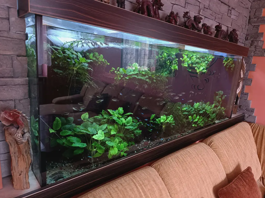 Poznámka: Akvárium žije, pokud možno, "divokým stylem". Žádné stříhání rostlin ani odstraňování starých listů z rostlin, žádné "honění" ryb k vytření. Rostliny jsou "přirozeně" zařasené pro šneky, přísavku thajskou a ostatní rybky(když dostanou, někdy i třídenní, hladovku). Odpadlé staré listy posbírám při údržbě (1x za čtyři týdny)z jednoho místa pod předfiltrem, nebo mezi údržbami od skimmeru.