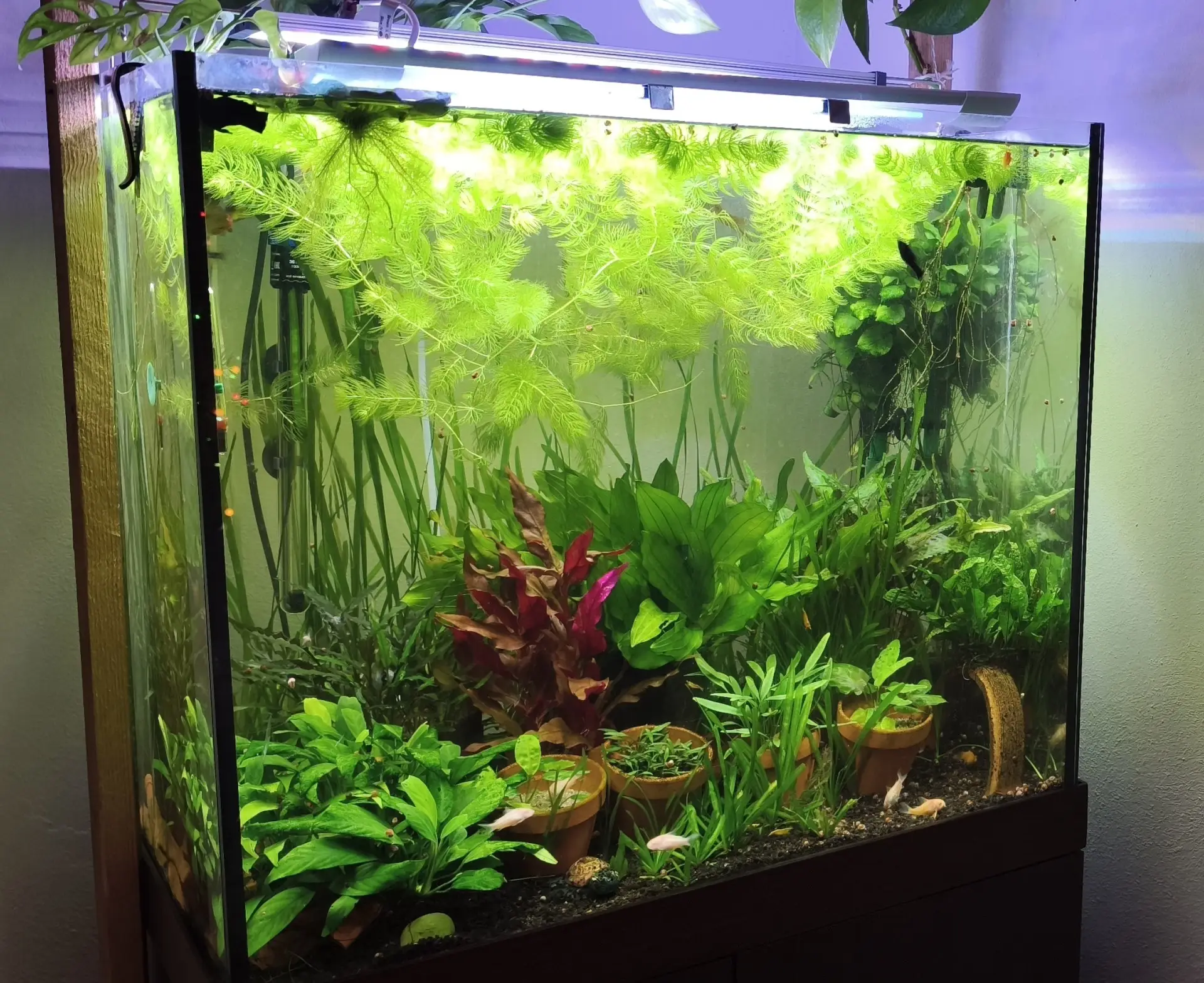 akvária tkvie vo vode. Treba mäkkú vodu a veľmi veľa problémom sa človek vyhne. A áno. V malých kvetináčoch mení rastlinky a skúškam. |