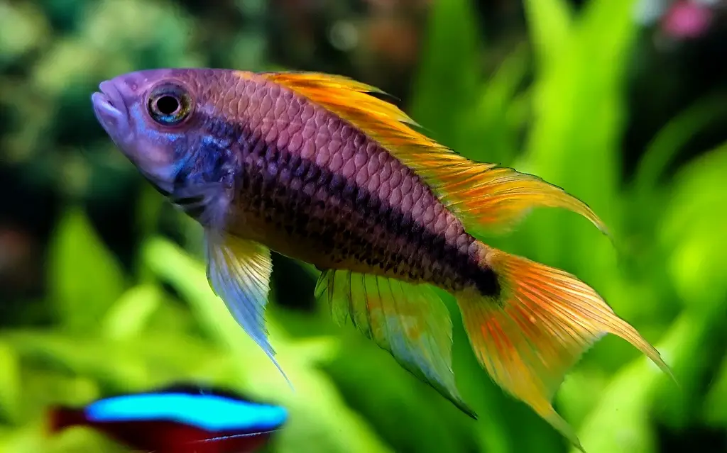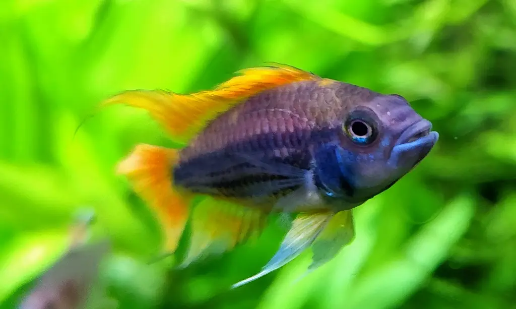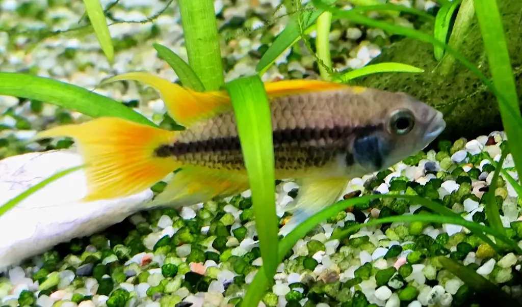 Krmení: vločky Tetramin a Tetrarubin; mražené buchanky, perloočky, patentky, koretry; živé patentky, koretry, nítěnky, grindal, aluworms, tablety Spirulina, tablety Tetramin