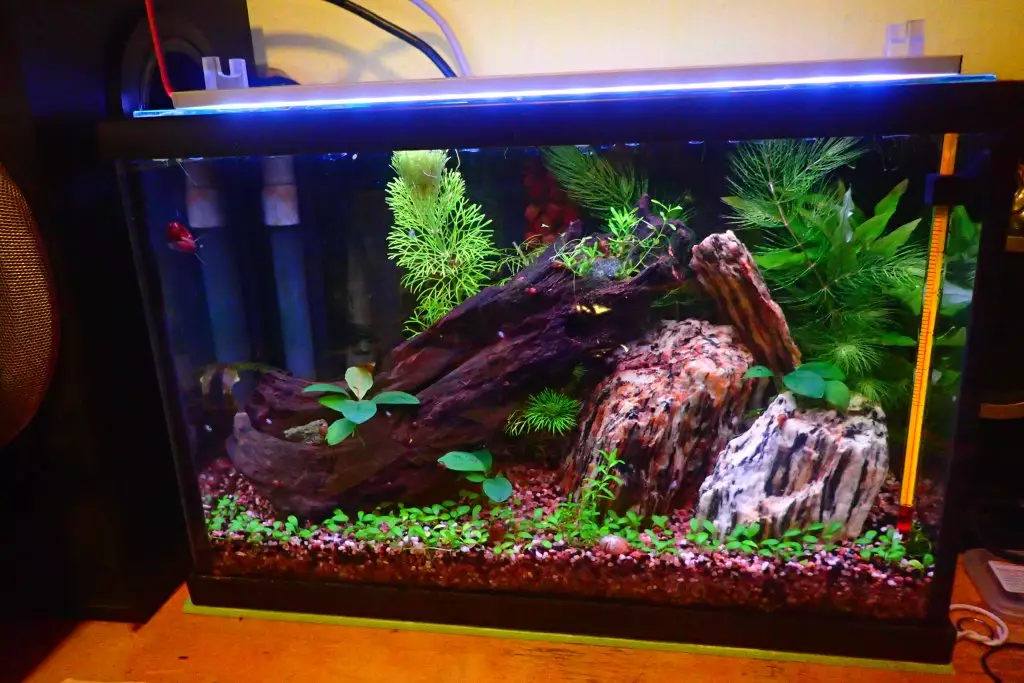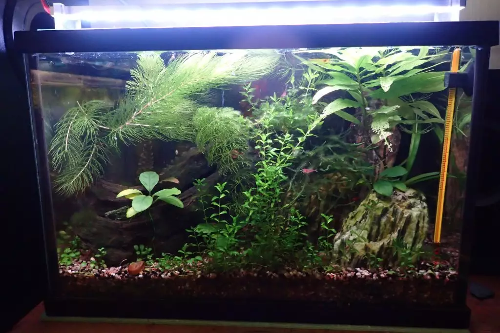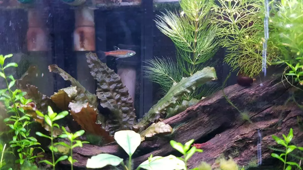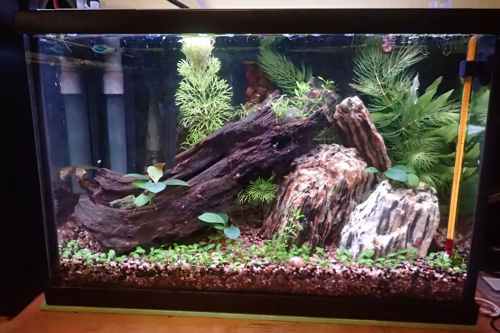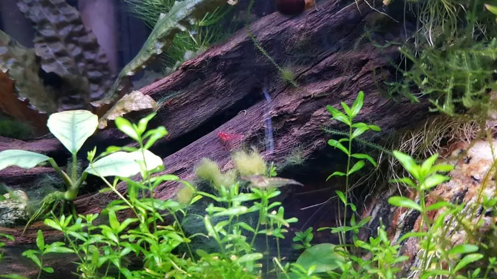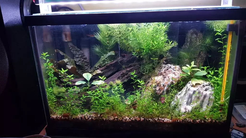 | 16 1.2020 | Tak nějaký čas jsem to tu zanedbával, akvárko mezitím zvládlo zarůst a už odchovalo kdovíkolikátou generaci krevetek. Na kmeni se drží chomáčky nějaké tuhé zelené řasy, ale je stabilní a pěkně vypadá, takže není důvod jí řešit. |