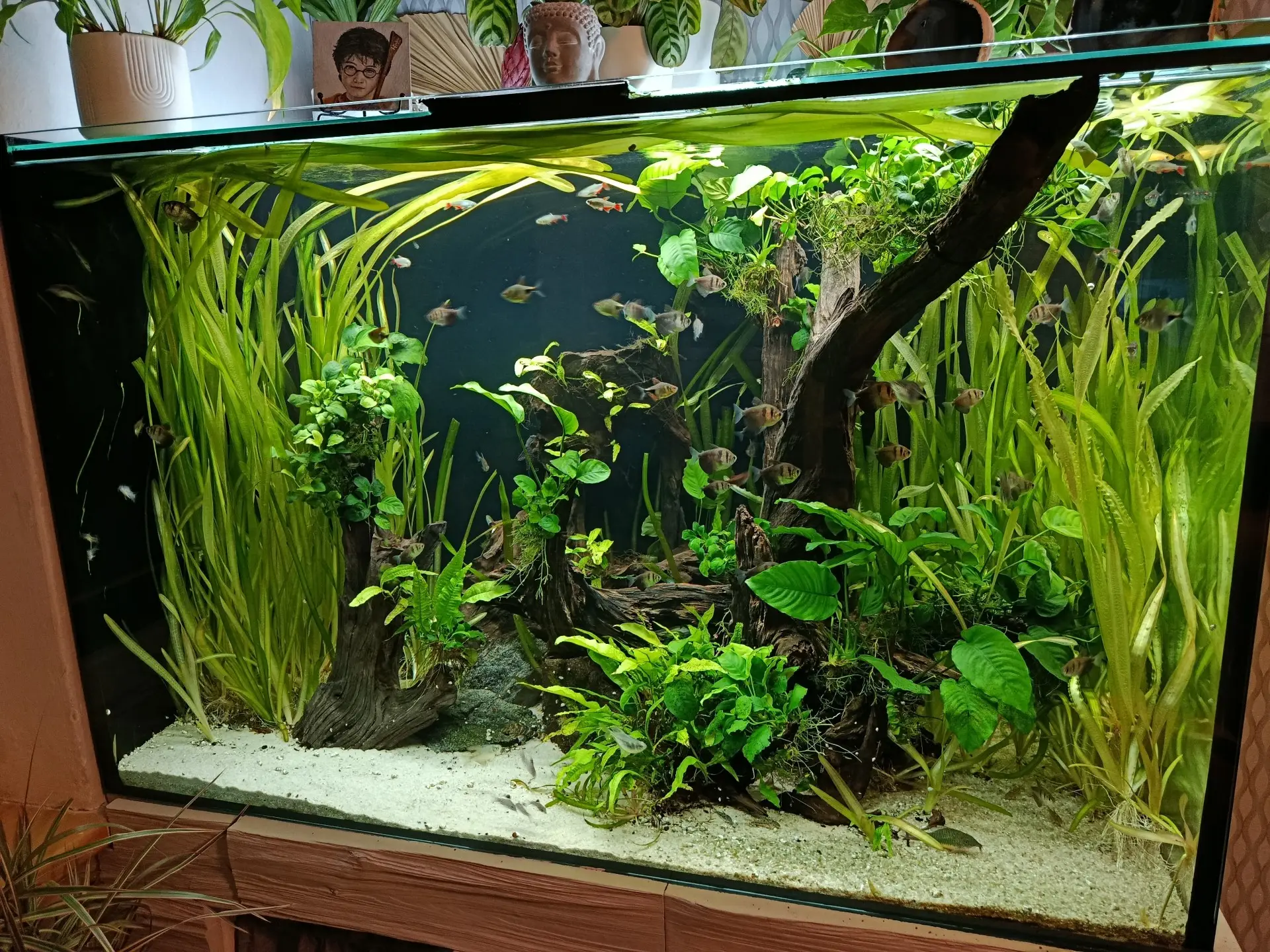Popis: Prvně založeno pro skaláry, nyní jsou zde jiné ryby jako sumci, tetry a další. Nejvíce se mi líbí ryby z JA. Akvárium prospívá i bez užití chemie a hnojiv. Jediné co mám v záloze jsou léčiva pro ryby (Esha).