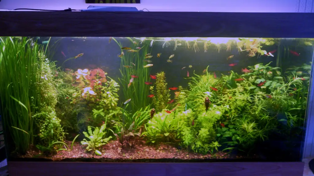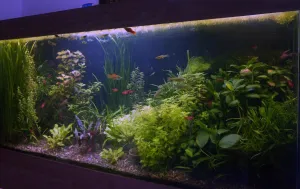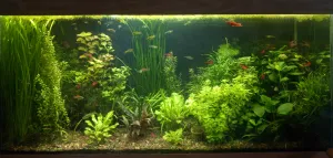 Popis: Sladkovodní akvárium s vodou rostlinkami a rybičkami--