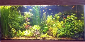 Popis: Sladkovodní akvárium s vodou rostlinkami a rybičkami--