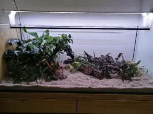 Před necelými třemi měsíci znovu založení. Rostliny i dekorace zůstaly. Přibyly jen kameny dragon stone a pár rostlin. S pokorou se vracím k drobným rybám. Rájovci vyžrali vše živé a rostlinám to vůbec neprospívalo. Delší dobu jsem chtěl vyměnit štěrk za jemnější. Momentálně mám frakci 0,8-1,5mm. Nádrž stále funguje bez filtrace a topení.