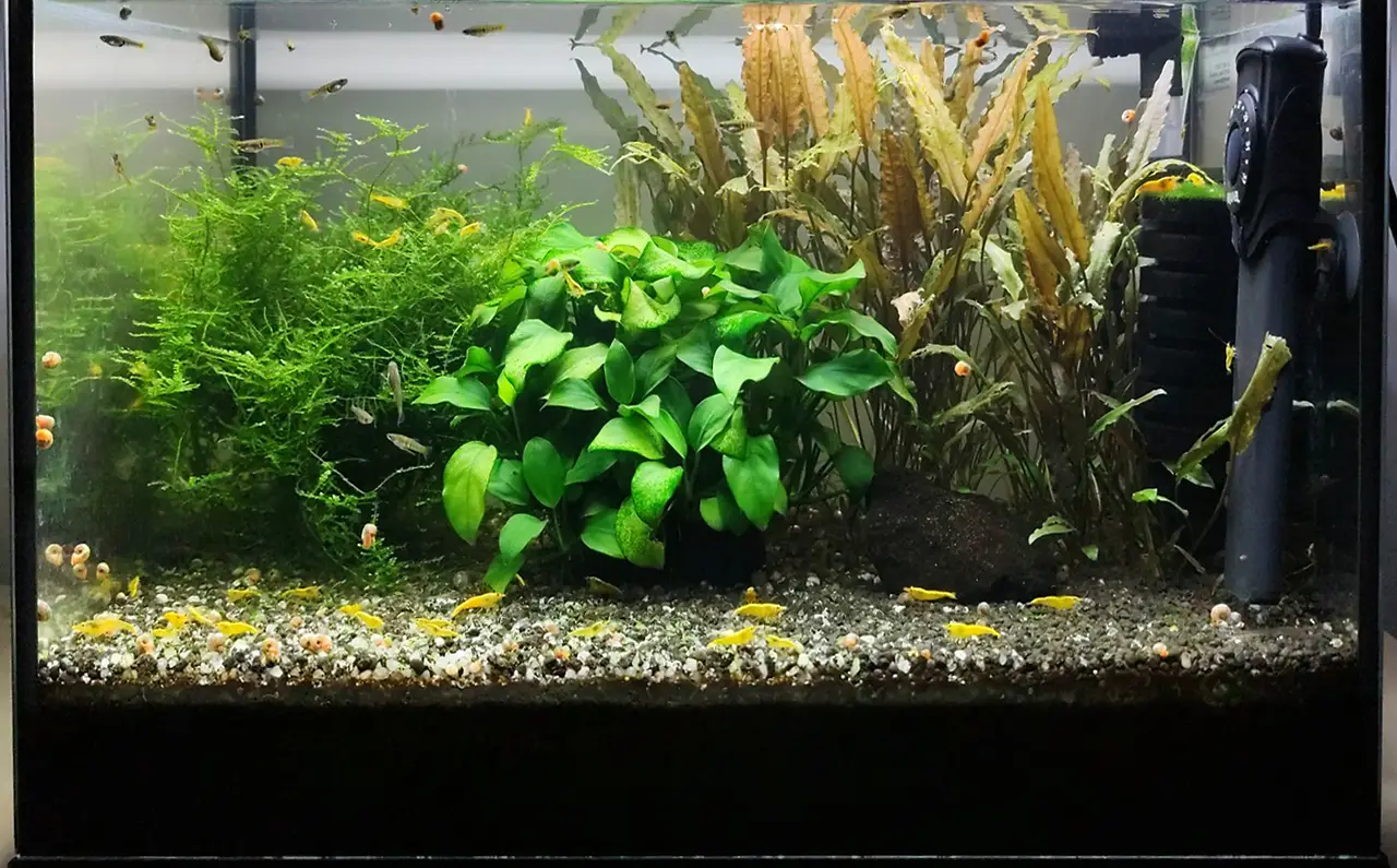 Krevetky při krmení pokryjí dno u předního skla, až celé zežloutne. Minulý rok