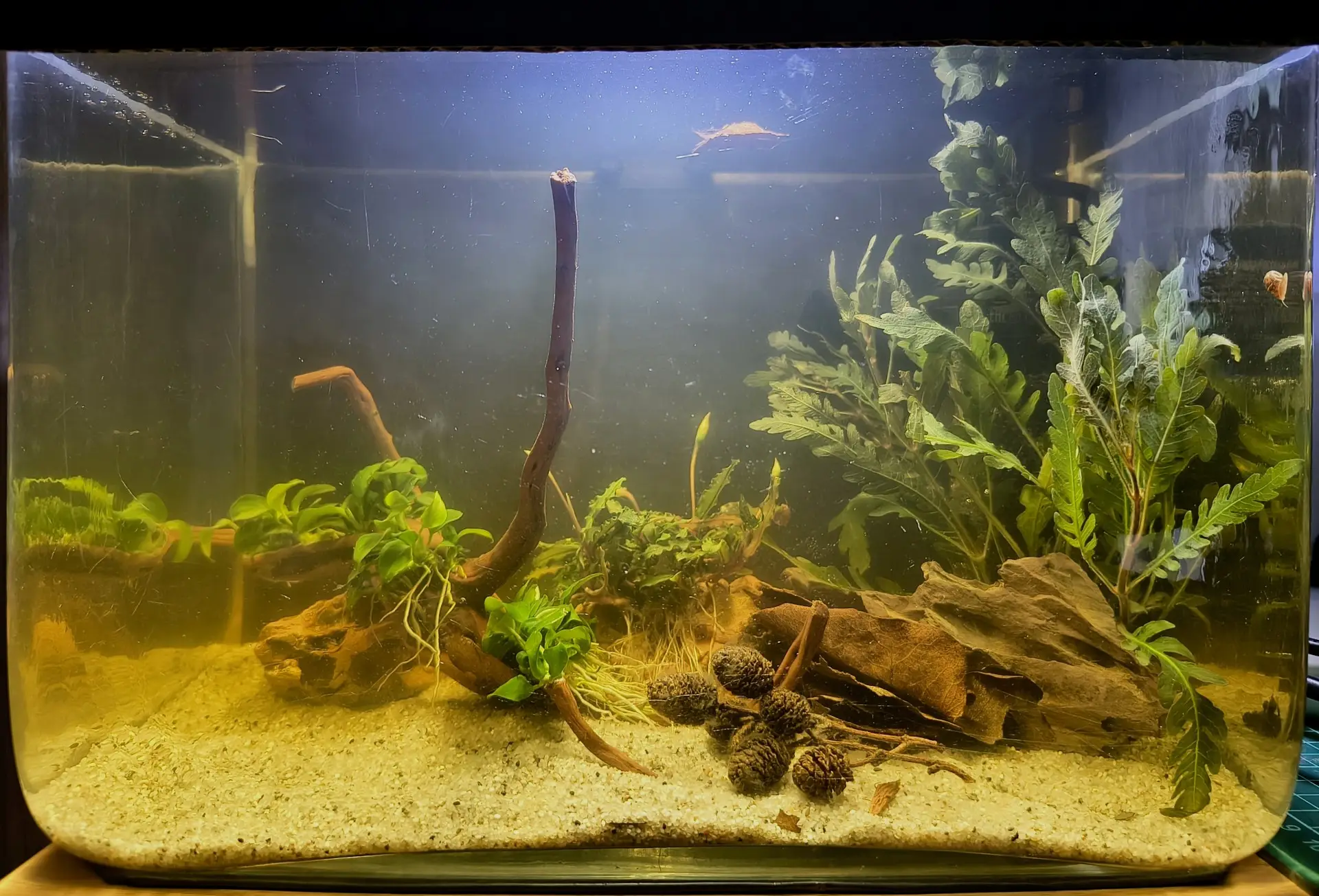 | 15 1.2026 | Vyměněn filtr, konečně jsem spokojená Pinnatifida asi definitivně v pánu, zbývají poslední kolínka a nové listy nikde A přidáno mikrosorko a jedna bucka - tolik k nákupu rychlerostoucích rostlin. Prostě se nepoučím. Ale co jsem přidala růžkatec, dvojnásobně poporostl, se sinice už neobjevila. Tak uvidím. Vypadá to nadějně. Všechny rostliny jsou připevněny na dekoracích a jsou mobilní. Do dna nic sázet nechci. Je ho tam málo a je tam vlastně jenom, aby nebylo holé dno, a bylo to co nejvíc čistitelné. Na to že to měla být dočasná nádrž se s tím nějak moc piplám |