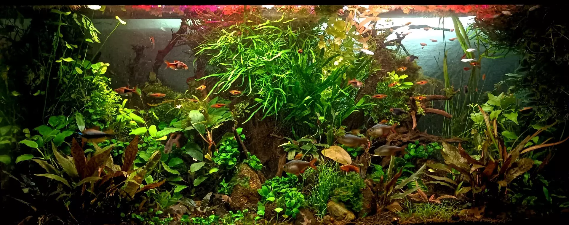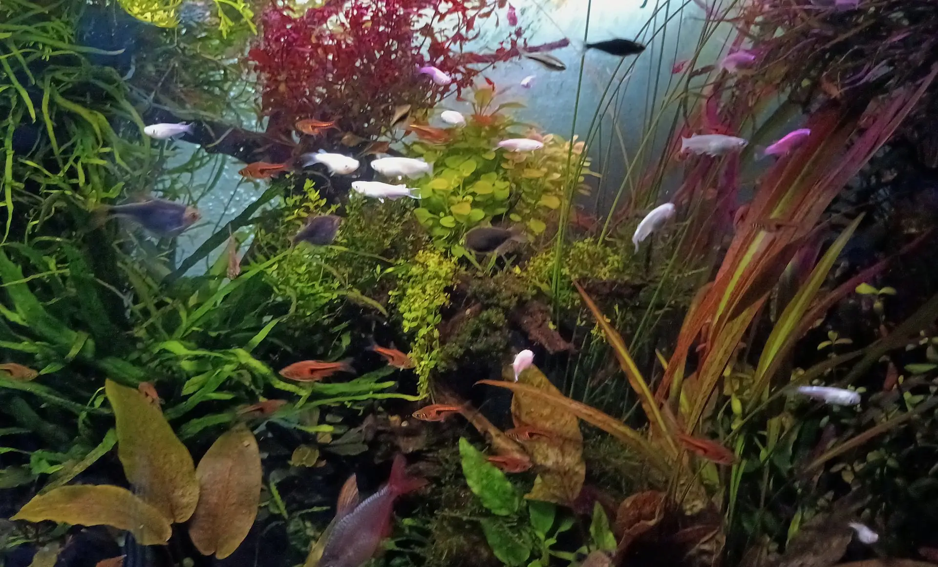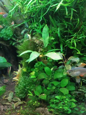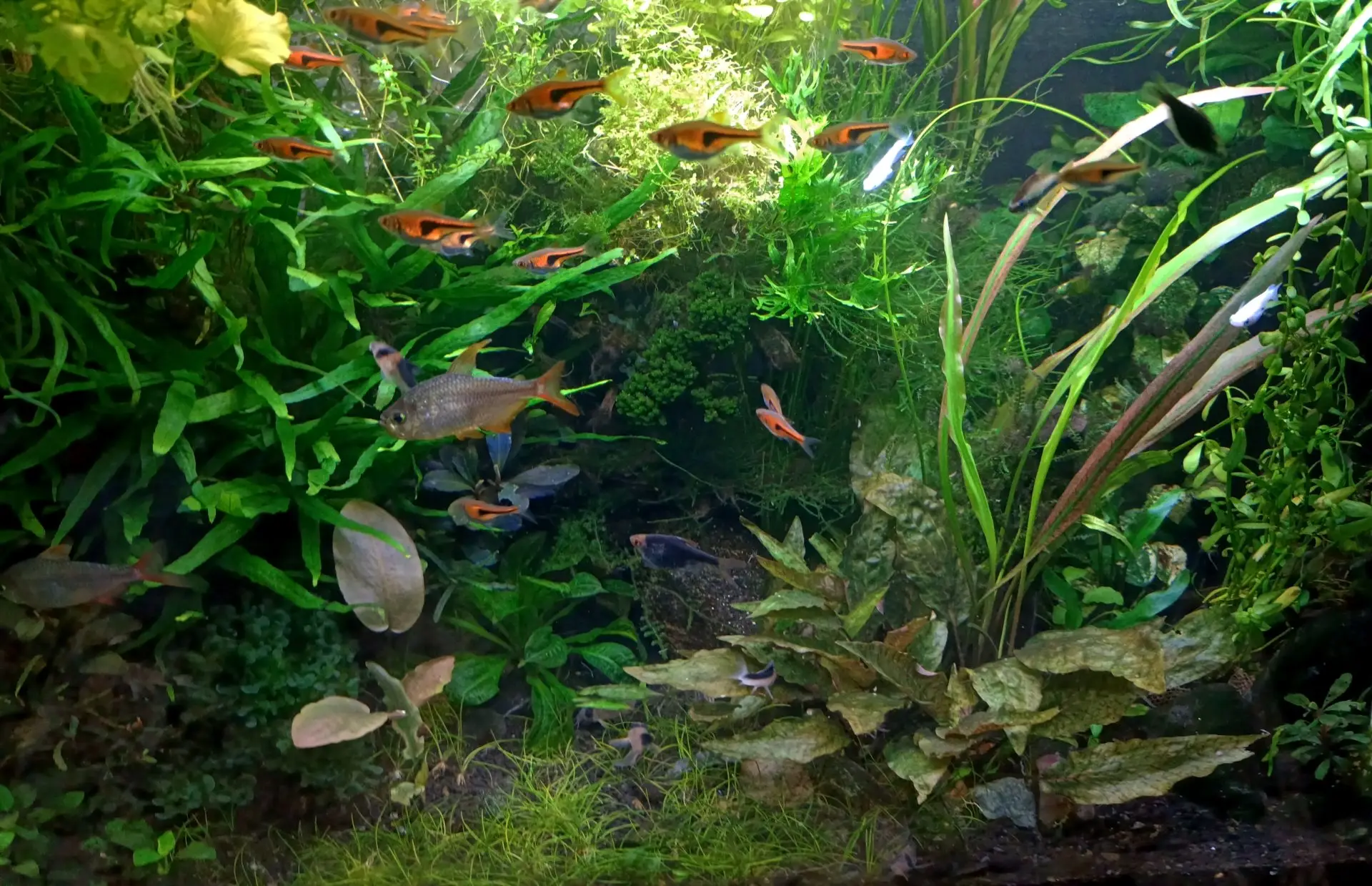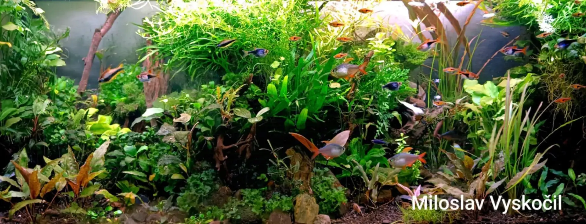 Hezky zarostlé akvárium s pestrou skladbou vhodně se doplňujících rostlin palec