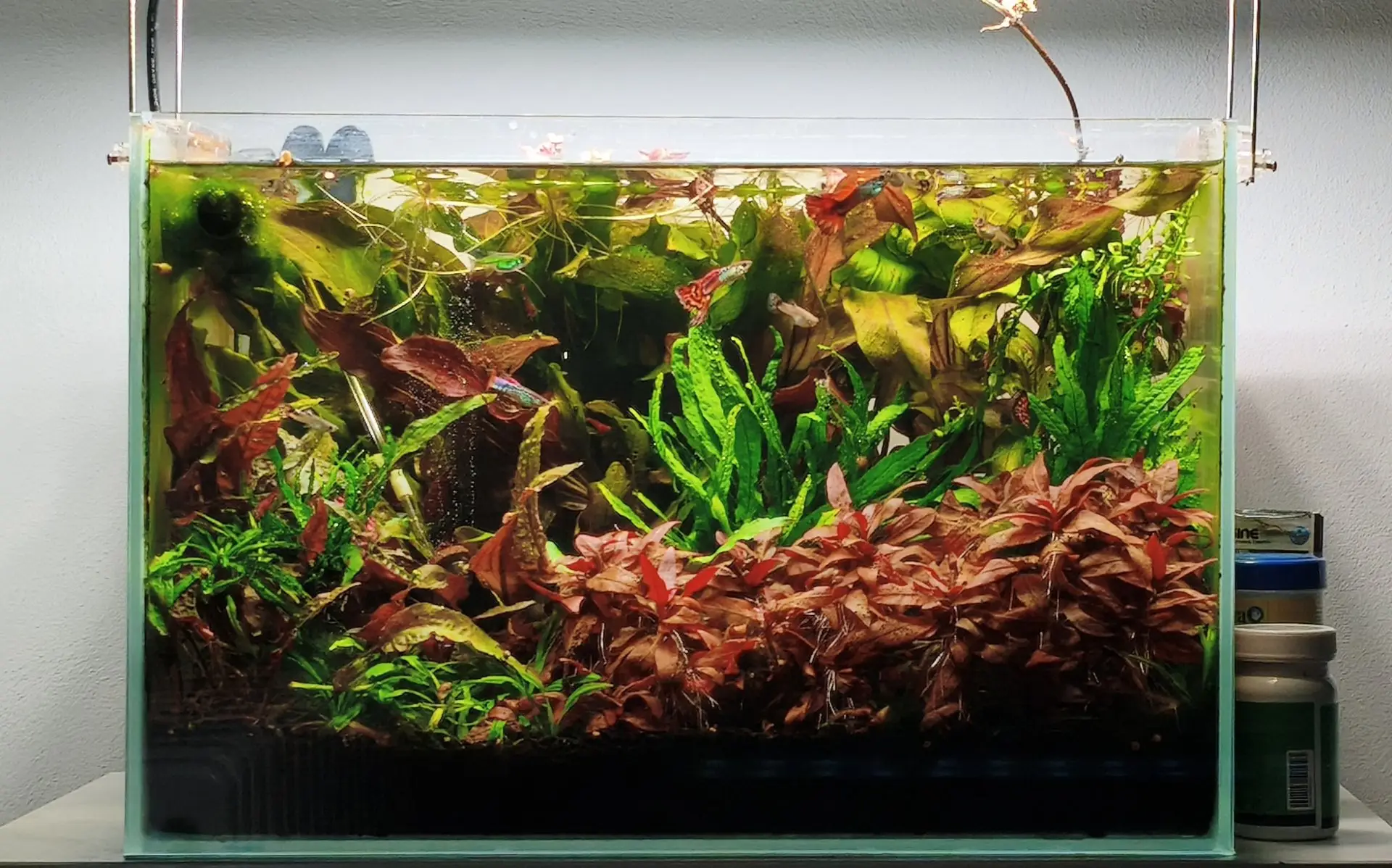 Popis: Moje druhé menšie akvárium. Chcel som miesto pre gupky a zároveň aj high tech akvárium. Veľmi ten high tech nemôžem preháňať hlavne kvôli osadenstvu. Páči sa mi tu experimentovať s rastlinami. Darí sa tu aj krevetám.