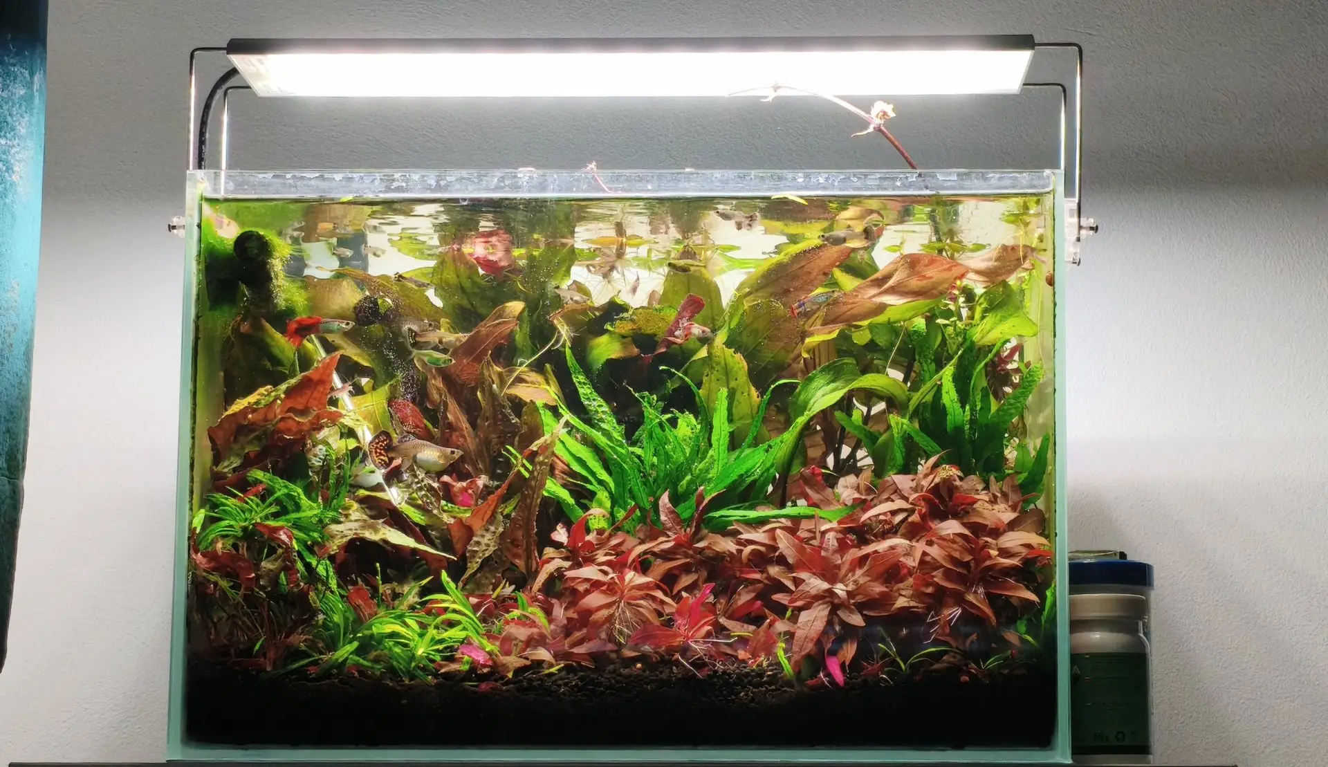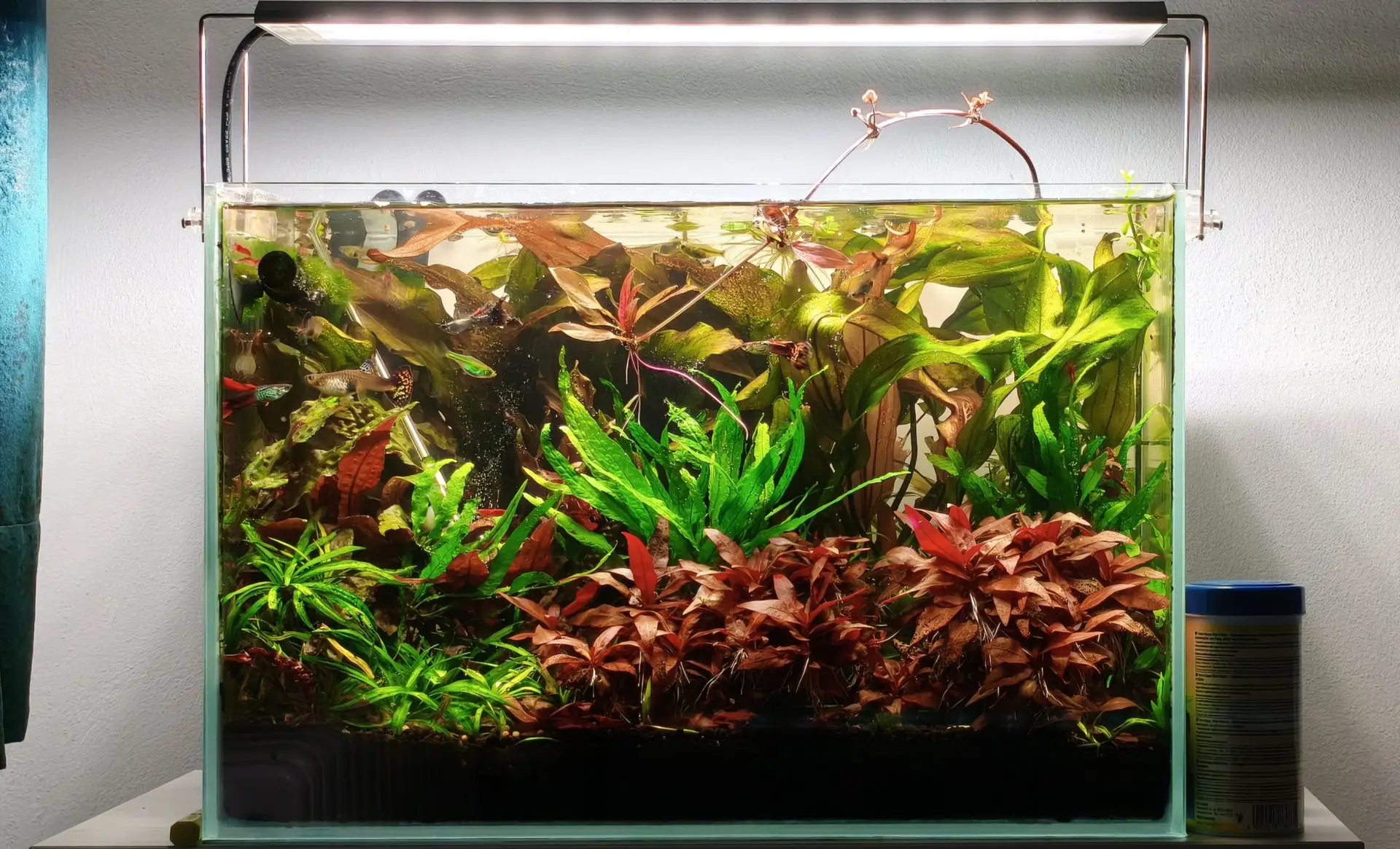 Popis: Moje druhé menšie akvárium. Chcel som miesto pre gupky a zároveň aj high tech akvárium. Veľmi ten high tech nemôžem preháňať hlavne kvôli osadenstvu. Páči sa mi tu experimentovať s rastlinami. Darí sa tu aj krevetám.