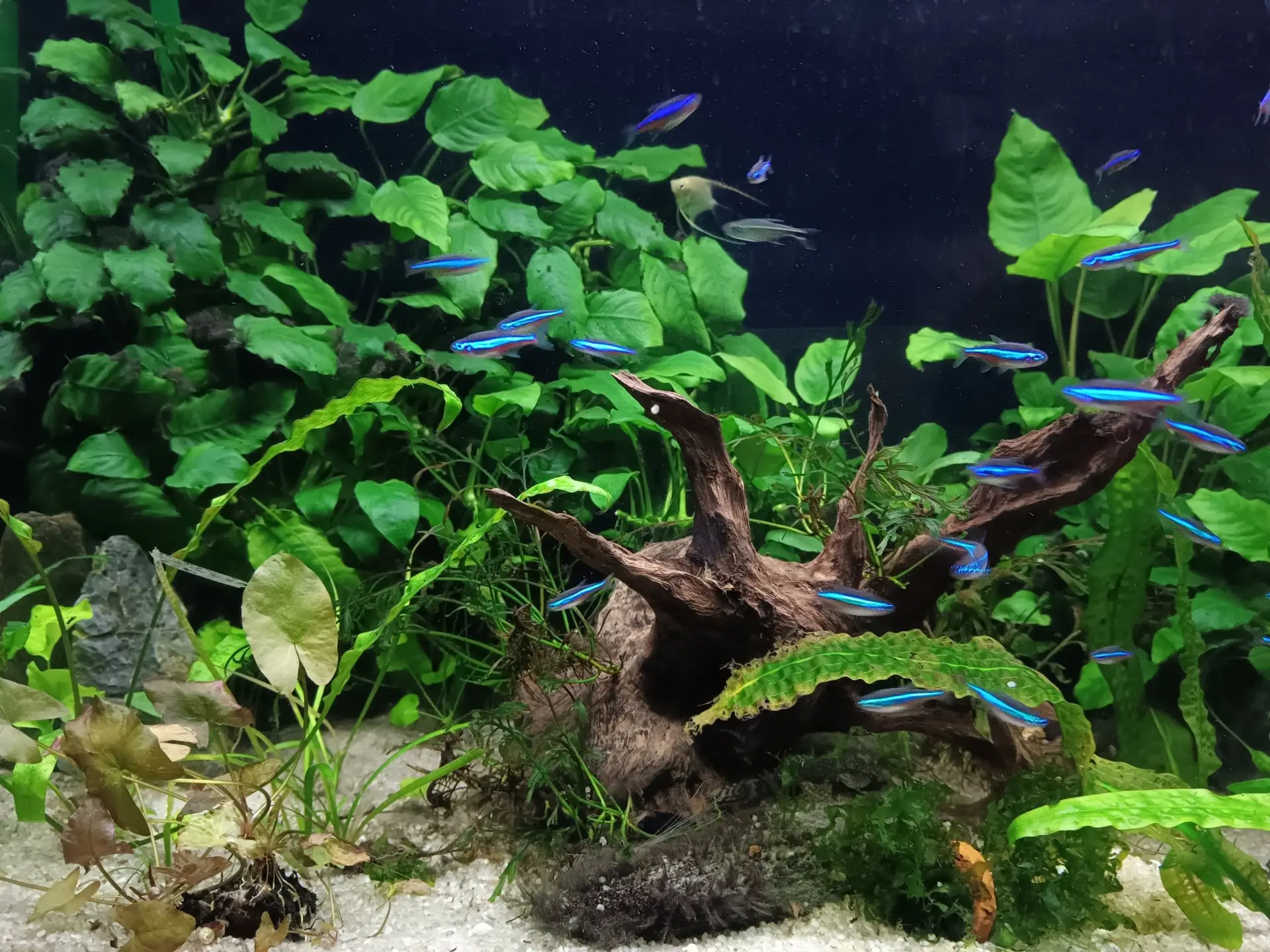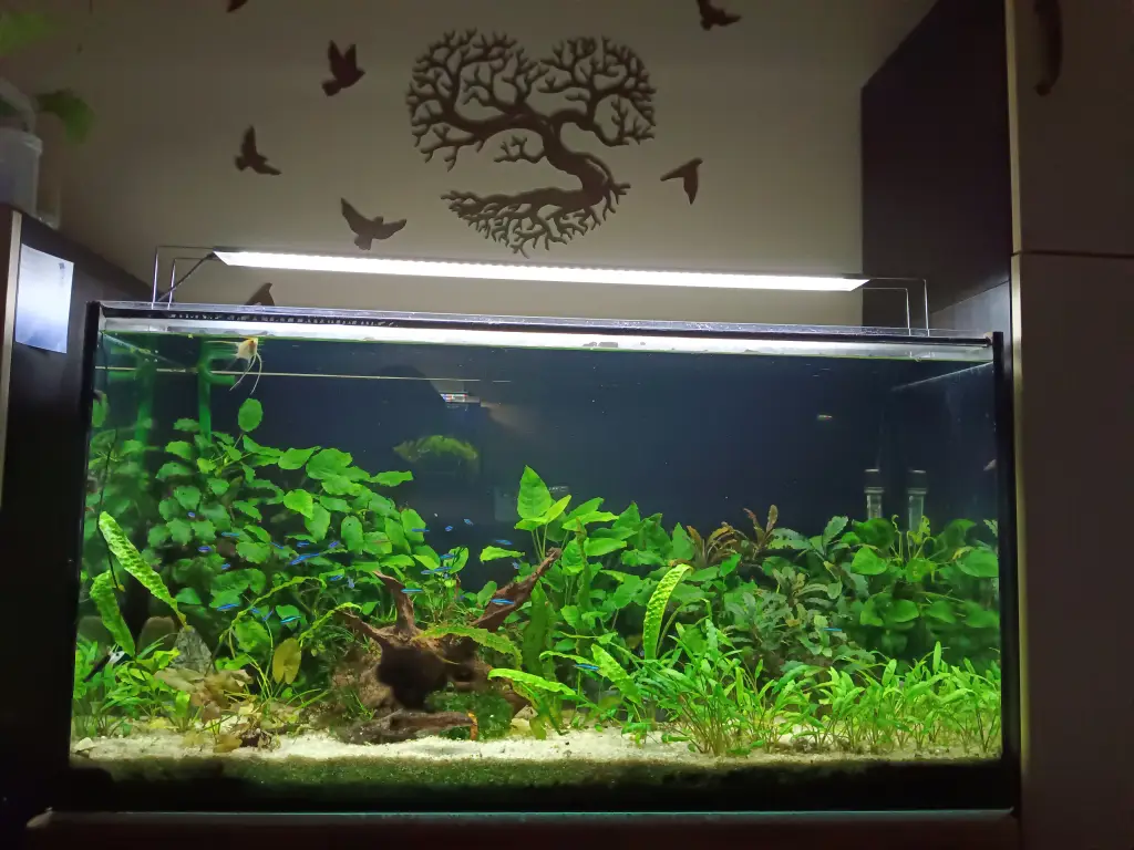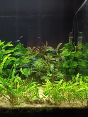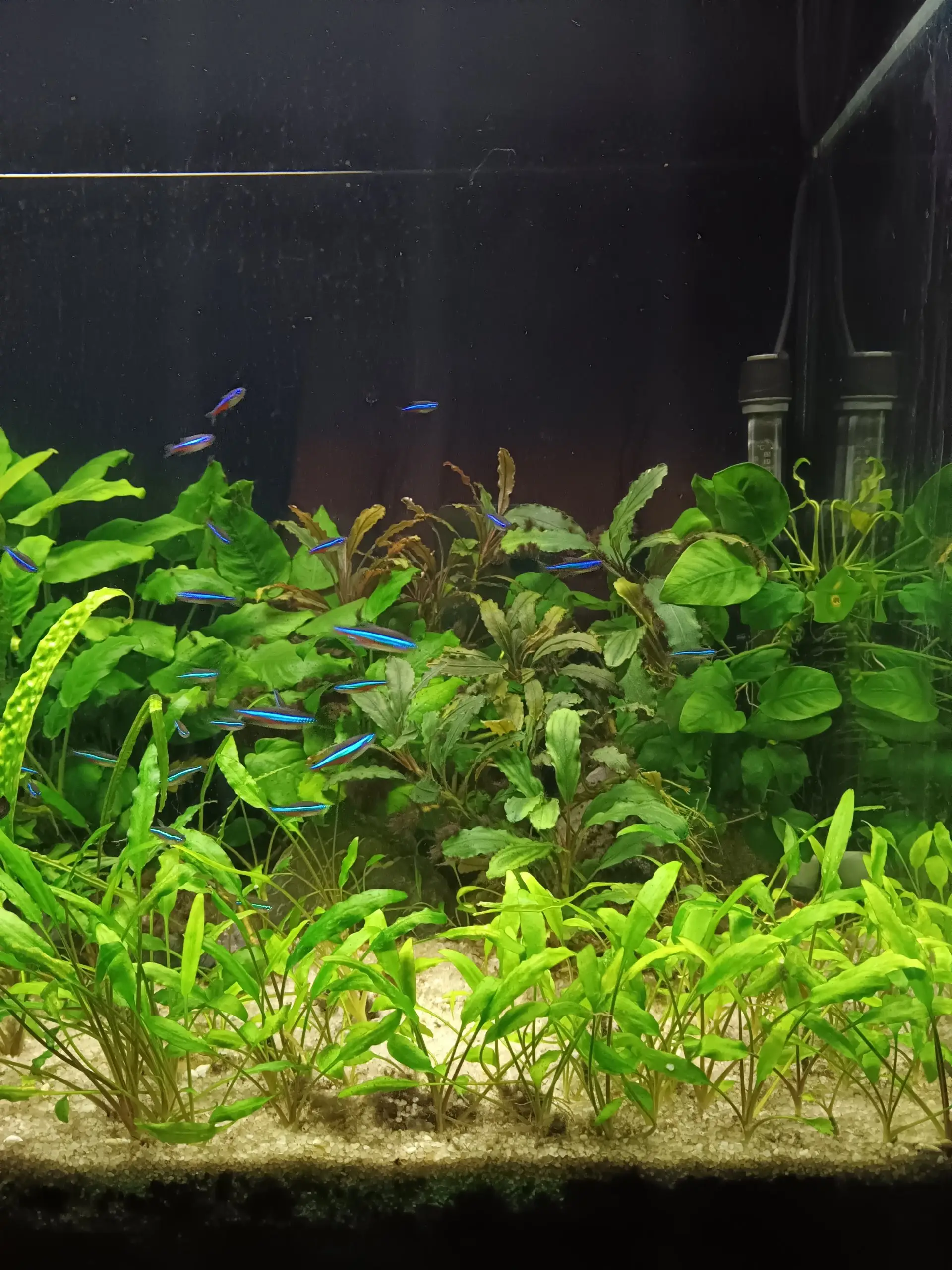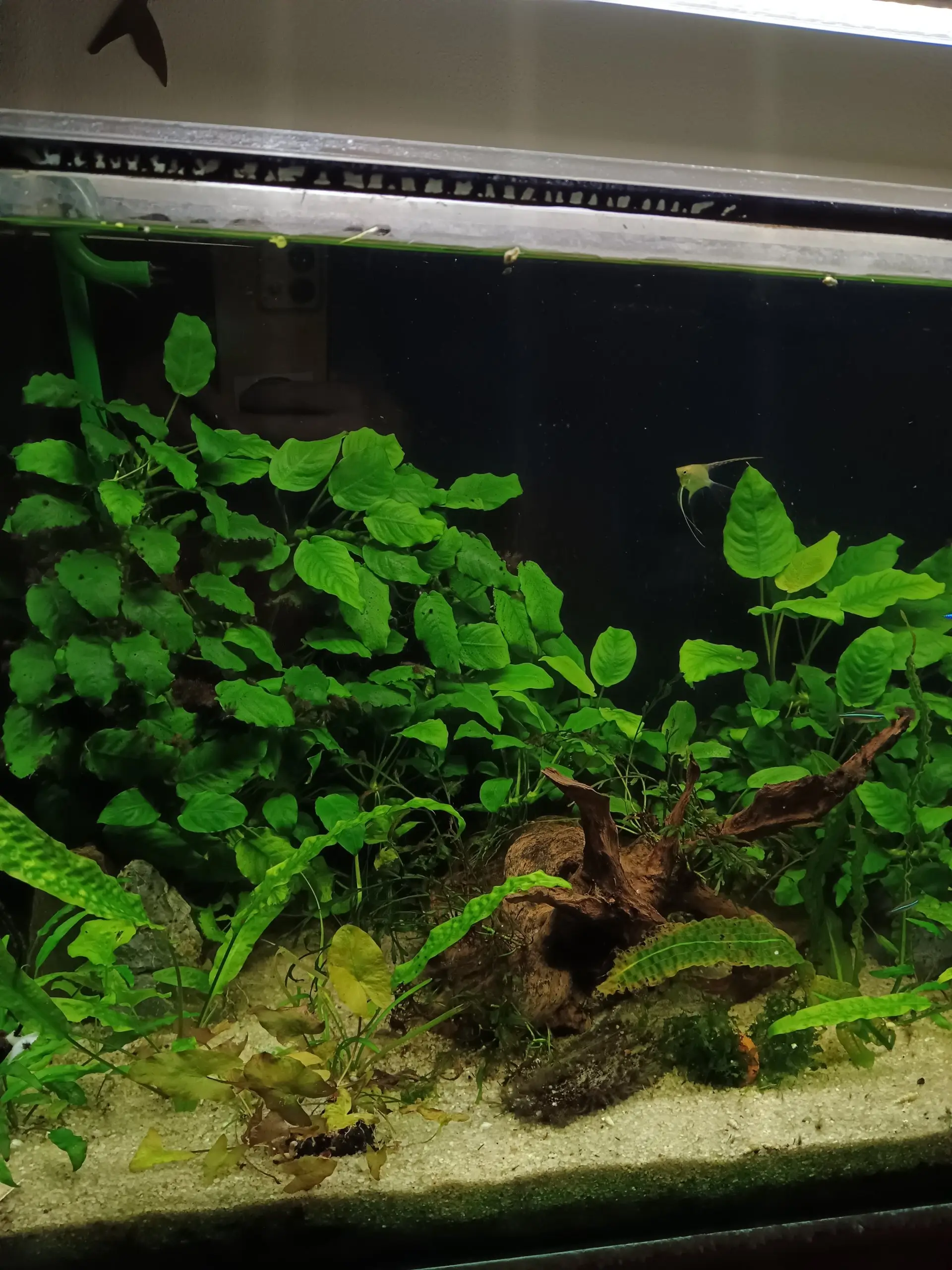 Bohužel poslední rok jsem měla velmi těžký a na akvárium nezbývalo času. Také podle toho vypadalo. Dnes jsem se rozhodla pro změnu, i když jen přesouváním rostlin. Zvažovala jsem nějaké vyšší k zadní štěně, ale nakonec ji nechám pokrýt Anubiasy, kterým se daří. Snad budou rybky znovu spokojené.