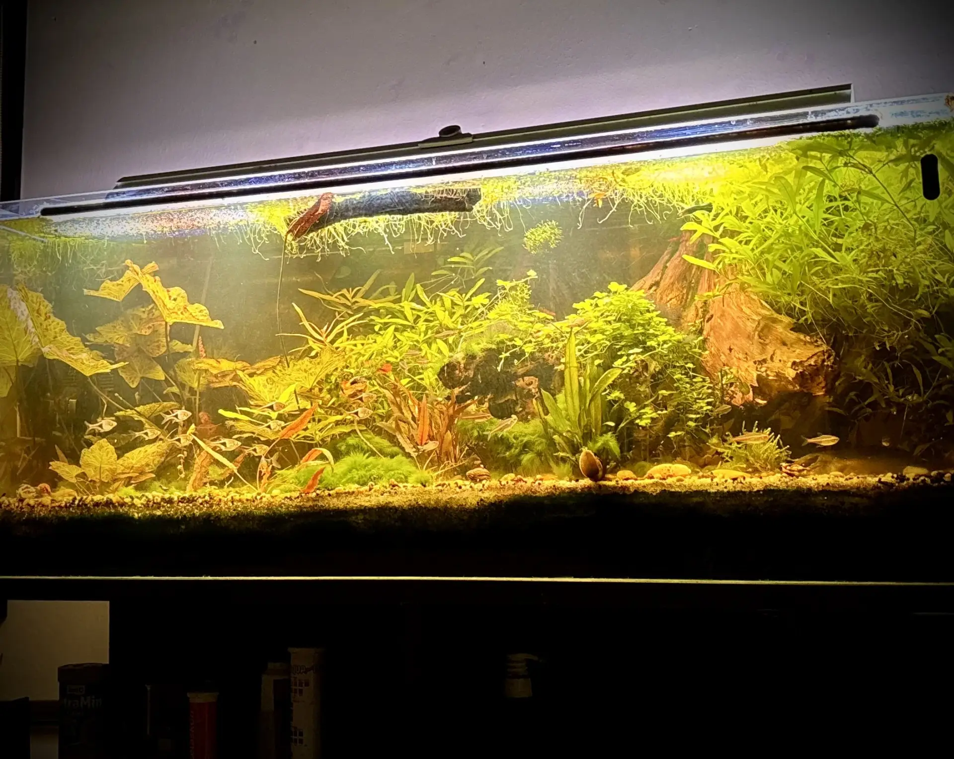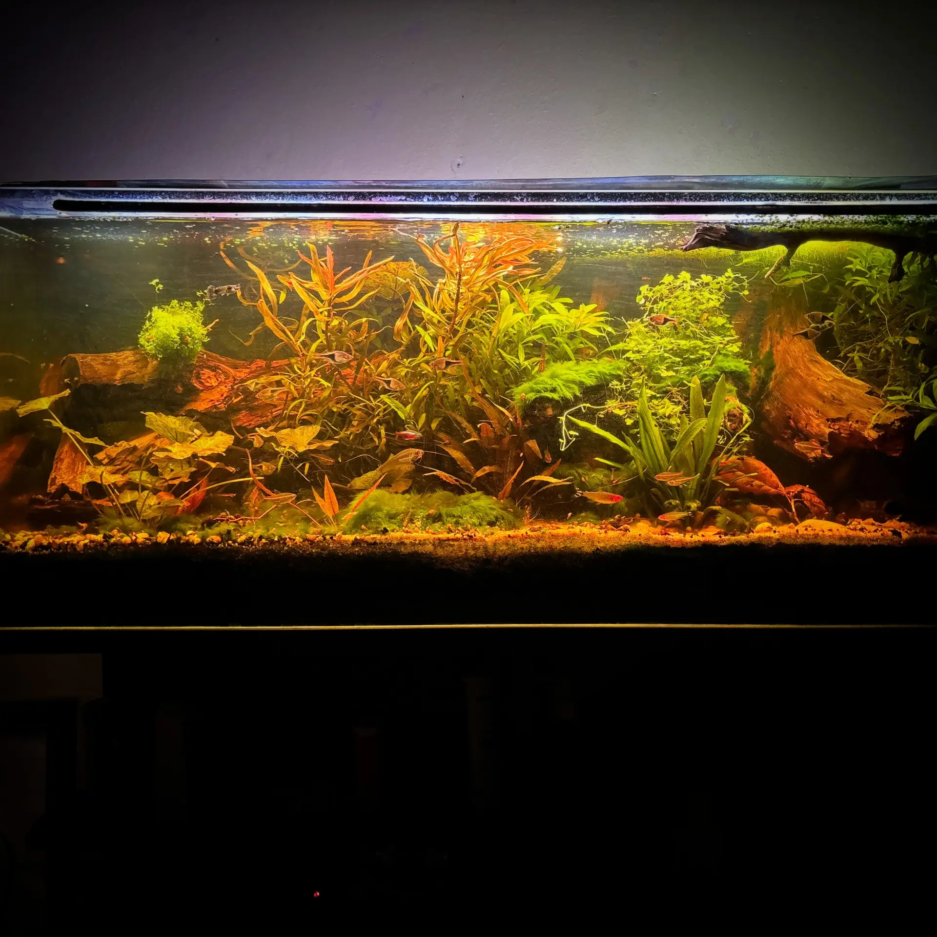Hnojení: Od 7/25 už nehnojím| Tenso cocktail (Sklorex Brno) + mikroprvky (Sklorex) + KNO3 (Fichema) + MgSO4 x 7H2O(Fichema). Dále jsem začal dávat JBL kuličky do dna - dřív jsem používal Bivoje, který byl podle mě lepší. Tablety PlantaStart od Tetry. Několik železných hřebíků pohřbených ve dně jako zdroj Fe.