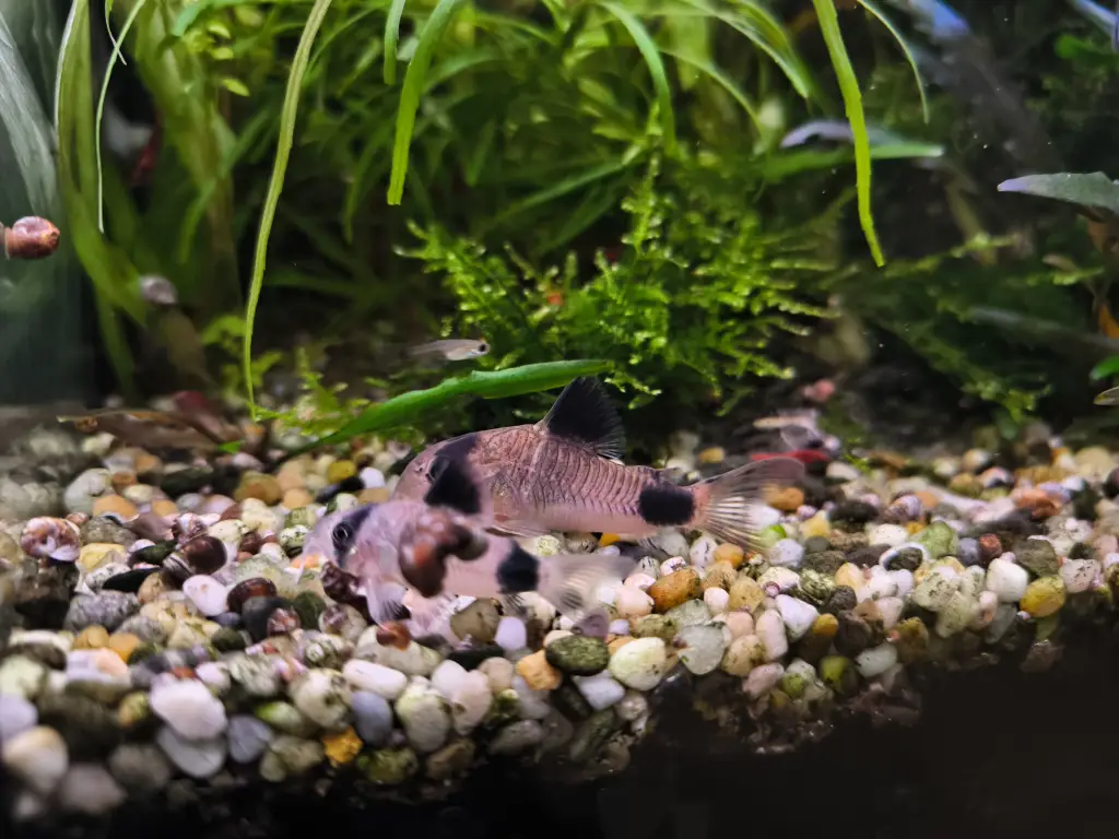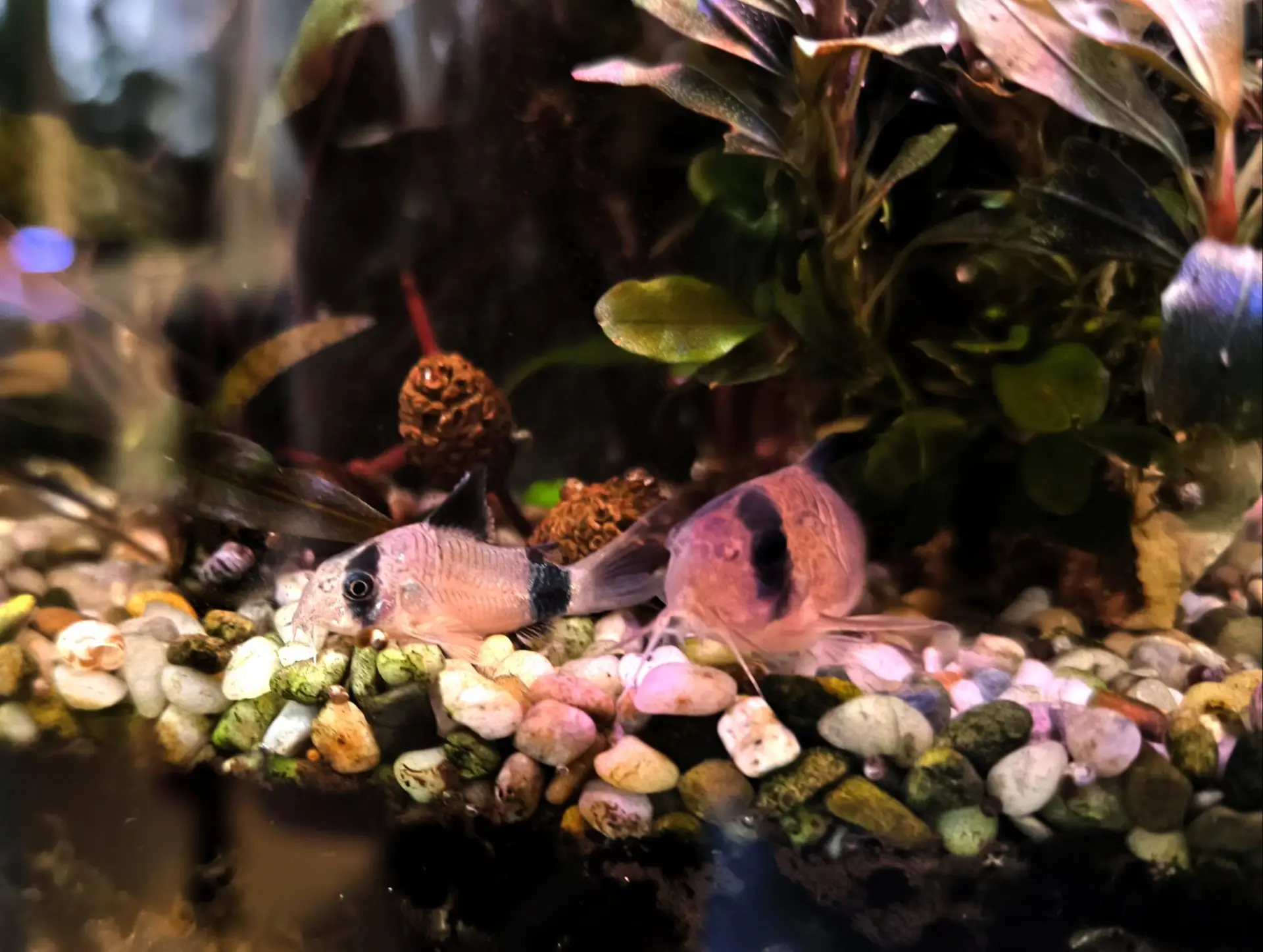 Krmení: Střídání několika druhů suchého krmení (vločky, granule, sušené artemie, nitěnky, atd), několika druhů tablet pro otíky a pandy.