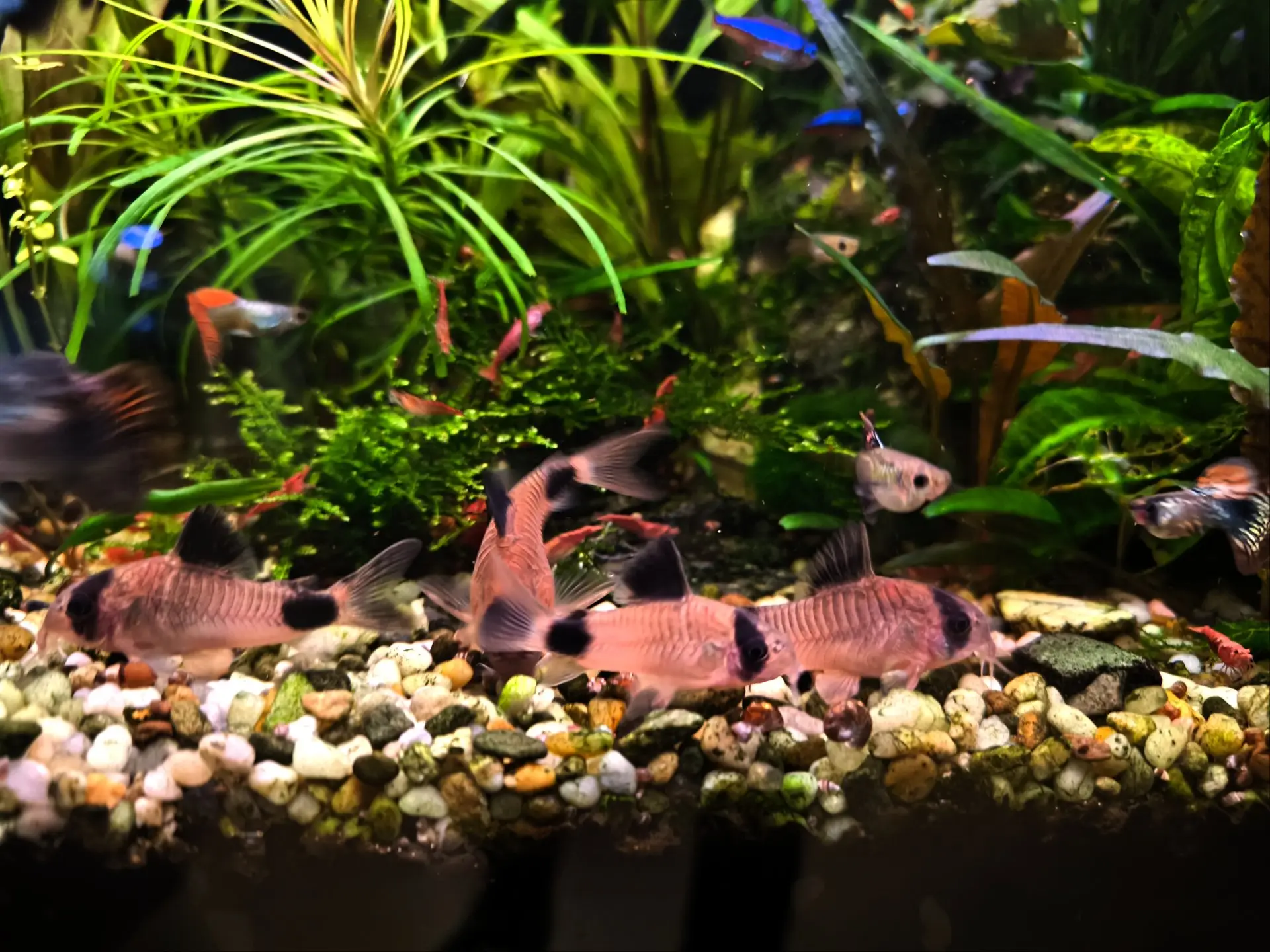 Krmení: Střídání několika druhů suchého krmení (vločky, granule, sušené artemie, nitěnky, atd), několika druhů tablet pro otíky a pandy.