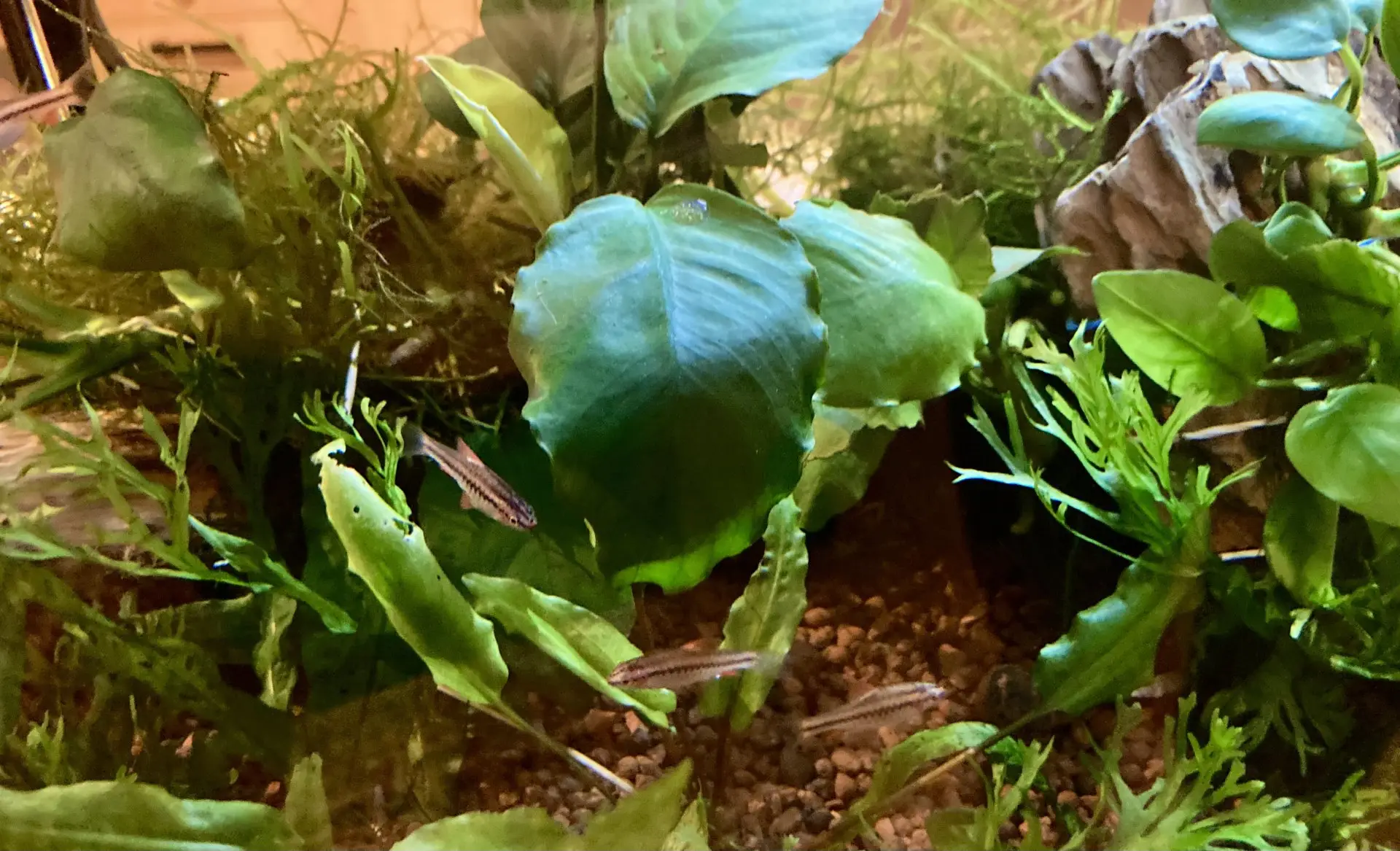| 8 12.2025 | Výměna 90% rostlin. Původnímu osazenstvu rostlin se v novém substrátu nedařilo a nelíbilo, takže změna. Všechny stonkovky šly pryč a přibyl kořen a spousta mechu, Anubiasy a hnědovky. |