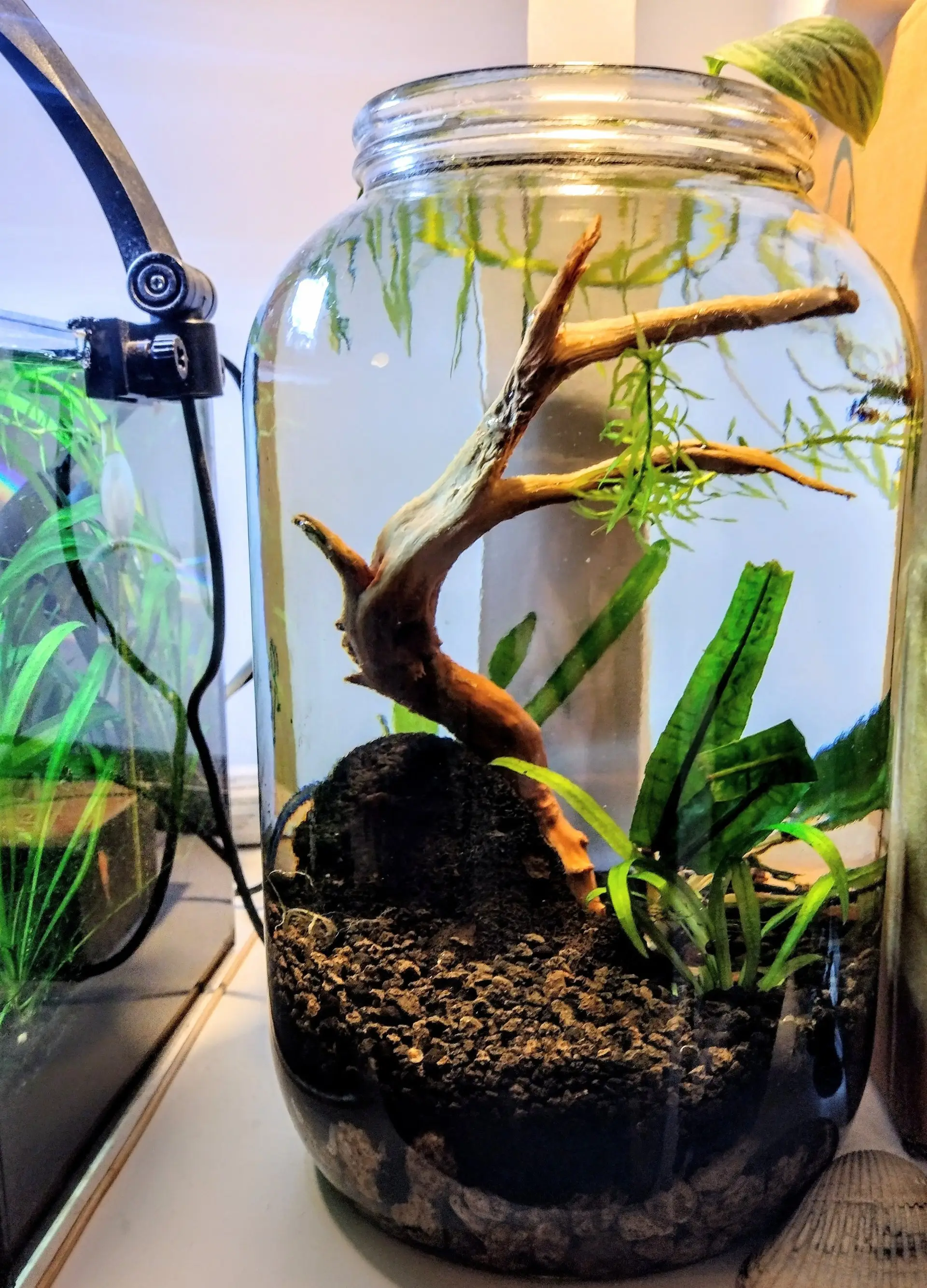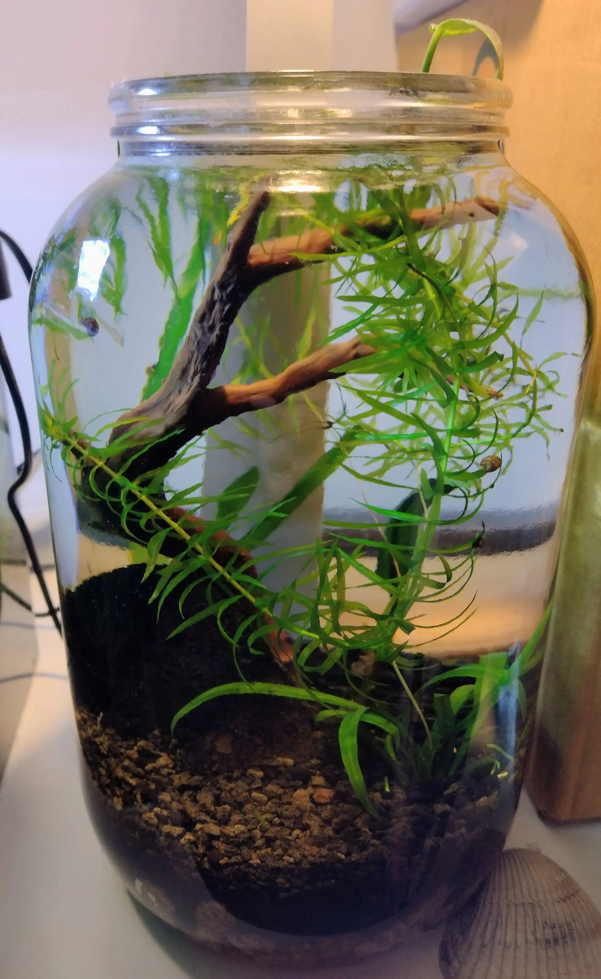 Popis: Do 3L nádoby od okurek jsem umístil nějaké rostliny z jiného akvária. Stejně tak rybičky. Sklenici jsem umístil na parapet. Teď se snažím stínit pokojovou rostlinou.