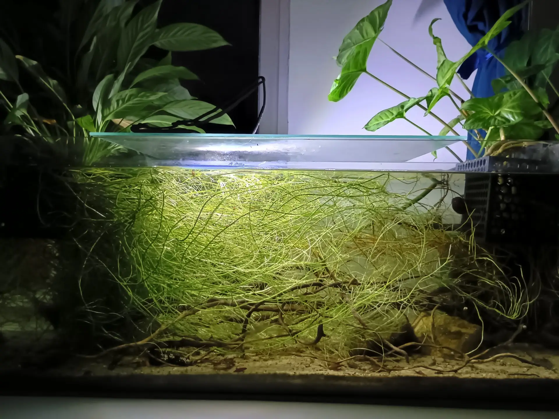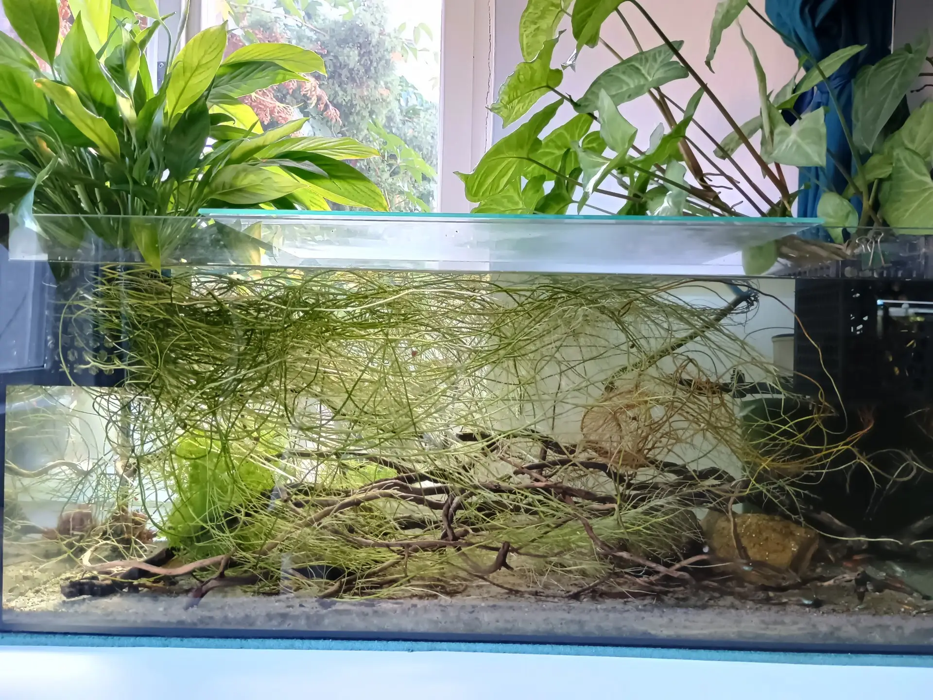 | 5 8.2025 | Zase jsem strávila půl hodiny s mobilem u akva, abych měla 4 fotky rozmazaných oranžových šmouh... no jo. Akva hodně zarůstá, přemýšlím, jestli prostřihovat |