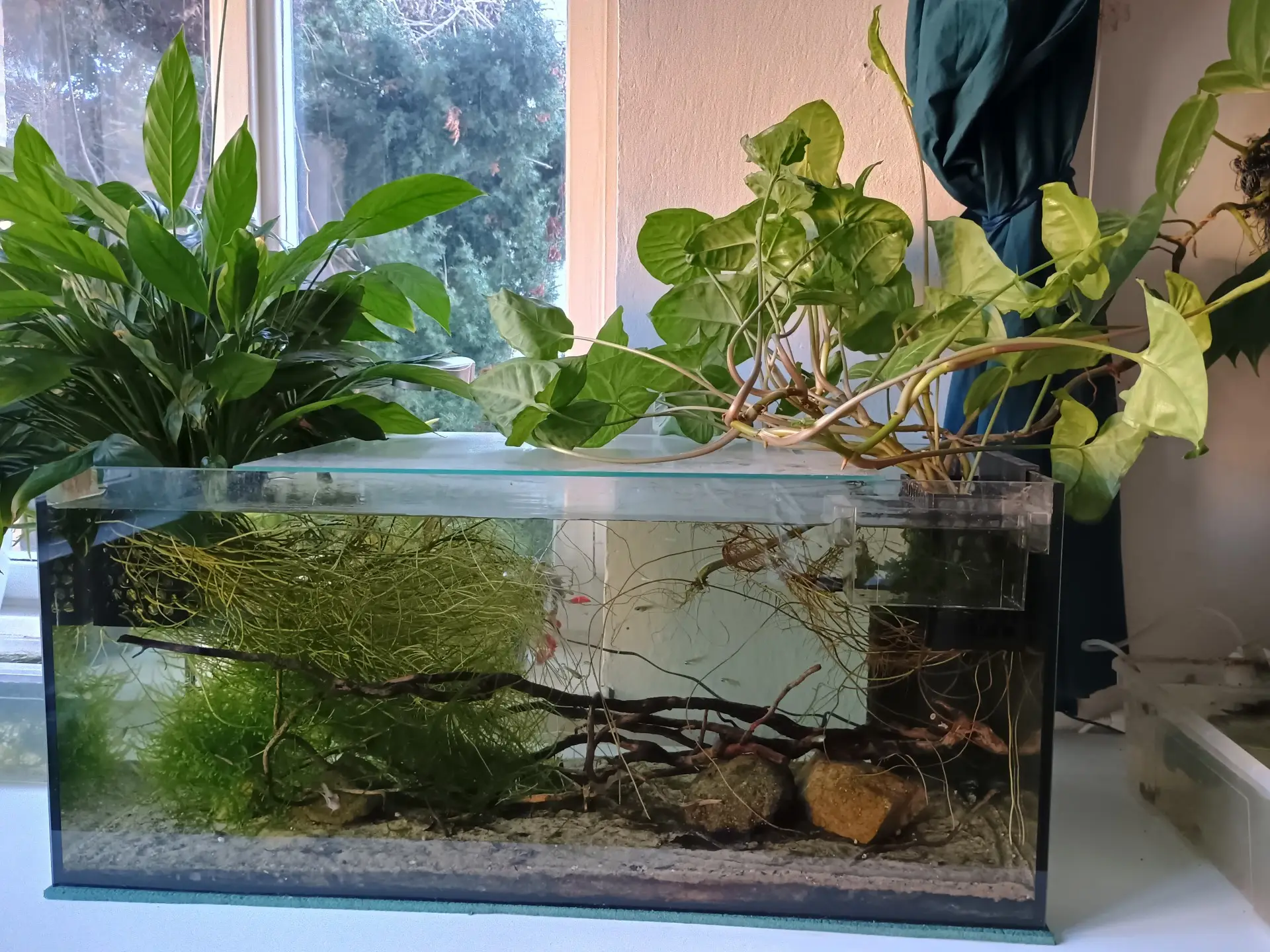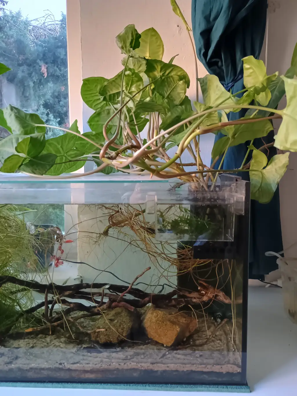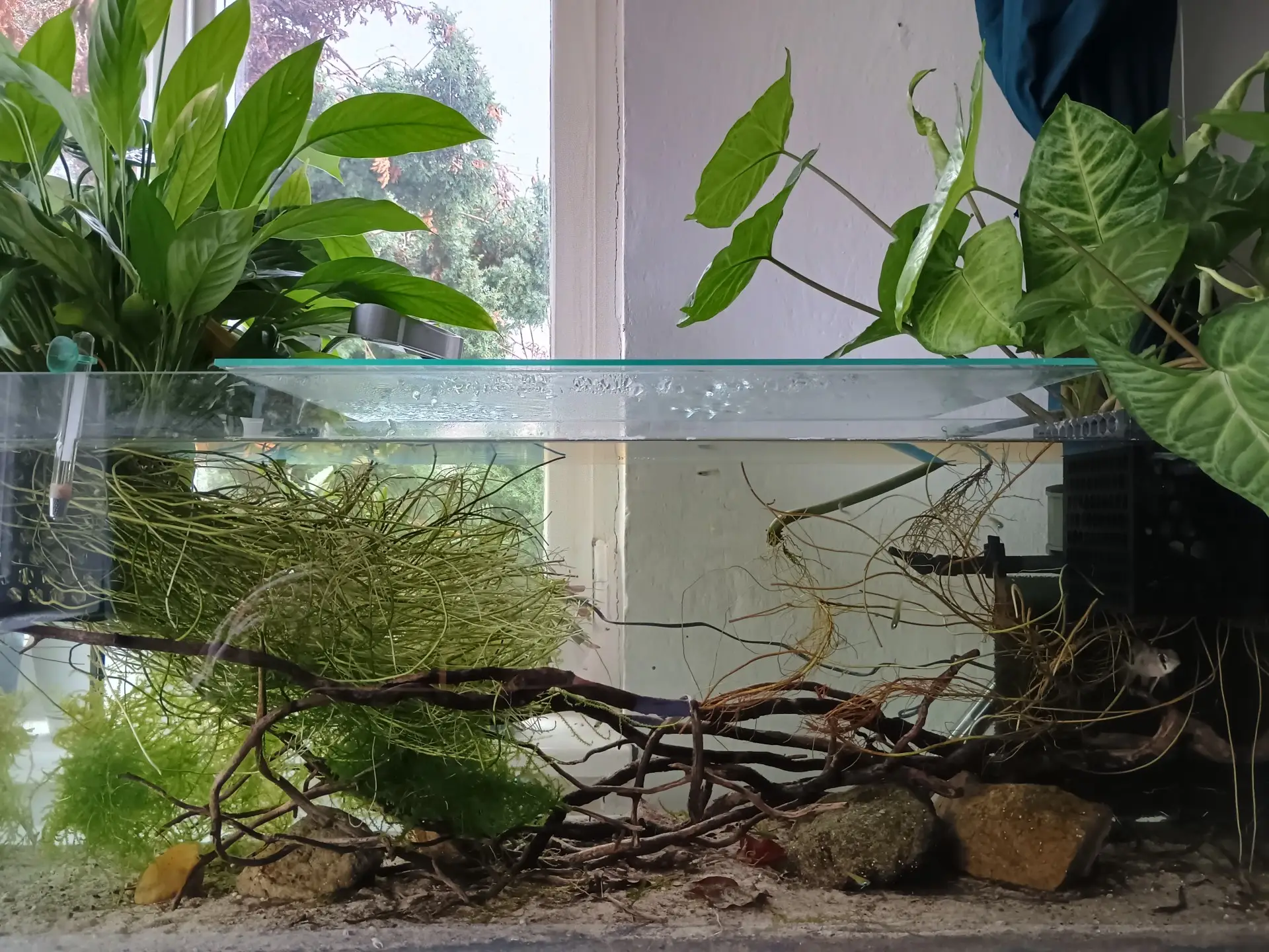 Nejvíc práce mi dalo vytahat a vystříhat kořeny pokojovek z houby filtru. Udělala jsem tu a rozvířila fakt bordýlek, tak uvidím, dalších pár dní udělám alespoň částečné údržby, radši.