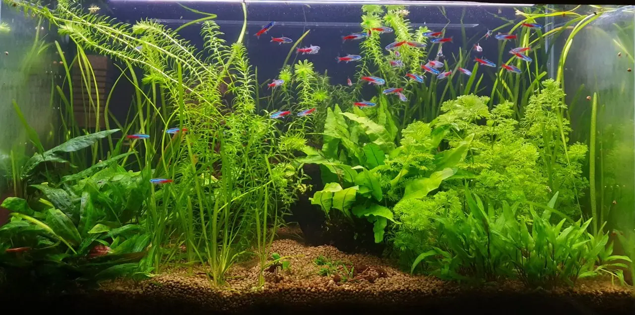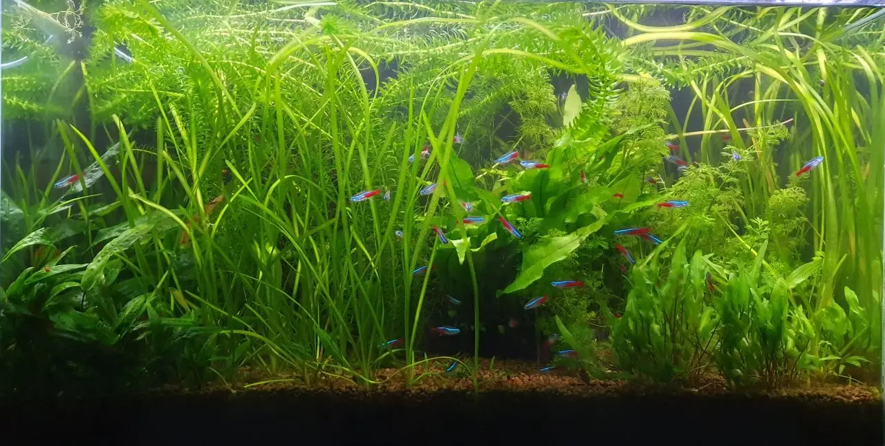 Microsorum, Cr.Affinis, Cr.wendtii green (vpravo). Teď už jsou vidět i ryby. Na fotce
