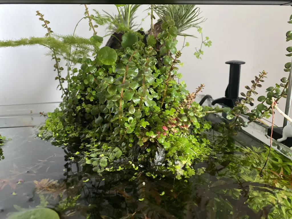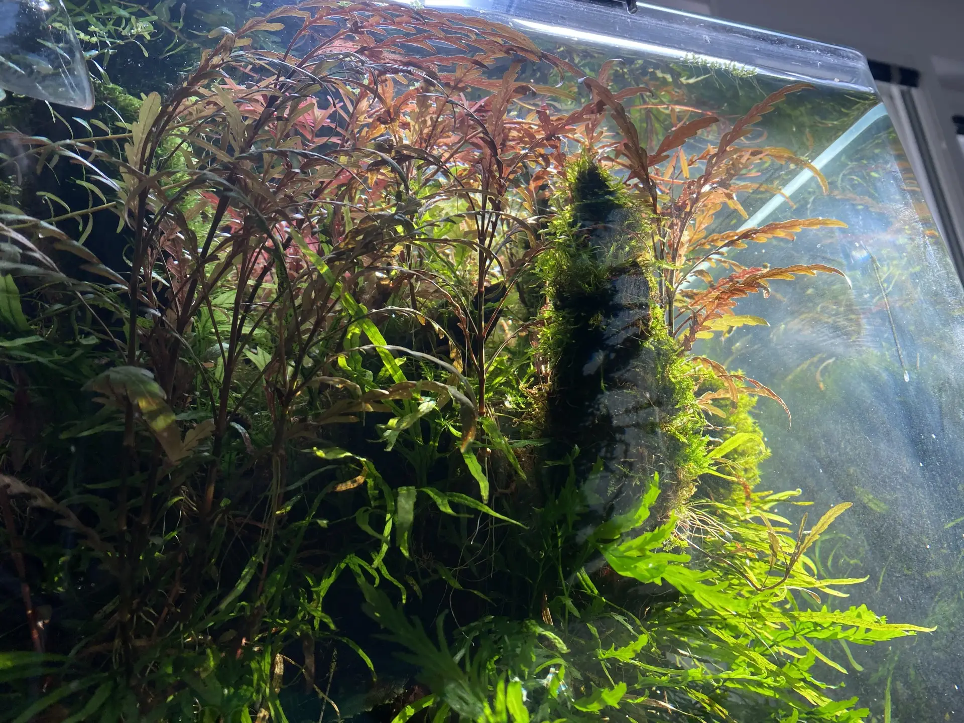 Mělo by se jednat o "útes" pro krevety Caridina (Paracaridina) “Racoon Tiger”, hodně mechů a kořenů. Inspirace ve ztrouchnivělém zarostlém pařezu někde uprostřed lesů. Líbí se mi moc, jak se krevety hemží ...takové mraveniště.