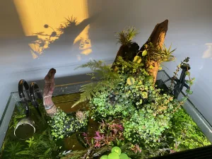 Mělo by se jednat o "útes" pro krevety Caridina (Paracaridina) “Racoon Tiger”, hodně mechů a kořenů. Inspirace ve ztrouchnivělém zarostlém pařezu někde uprostřed lesů. Líbí se mi moc, jak se krevety hemží ...takové mraveniště.