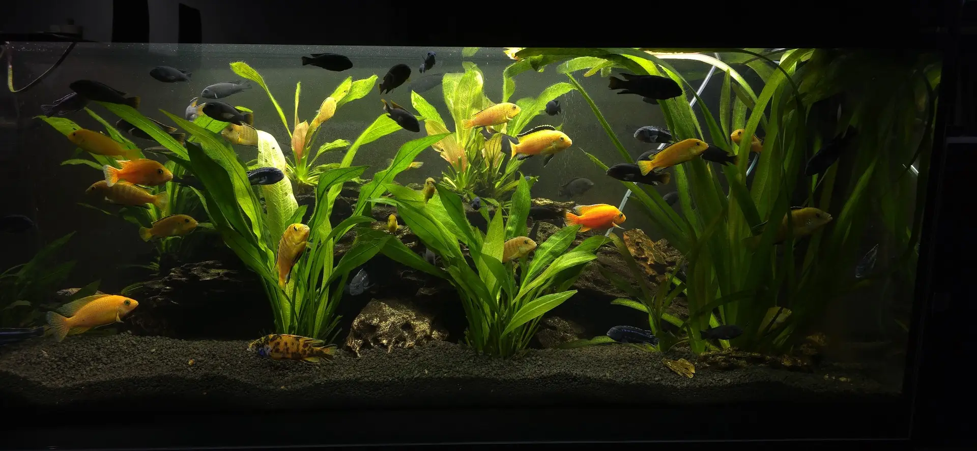 Popis: Zrušeno původní akva 200 l společenské a nahrazeno novým dvojnásobným obsahem. Změněn biotop na Malawi.