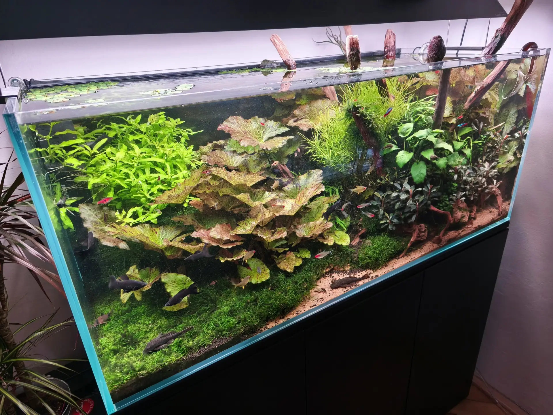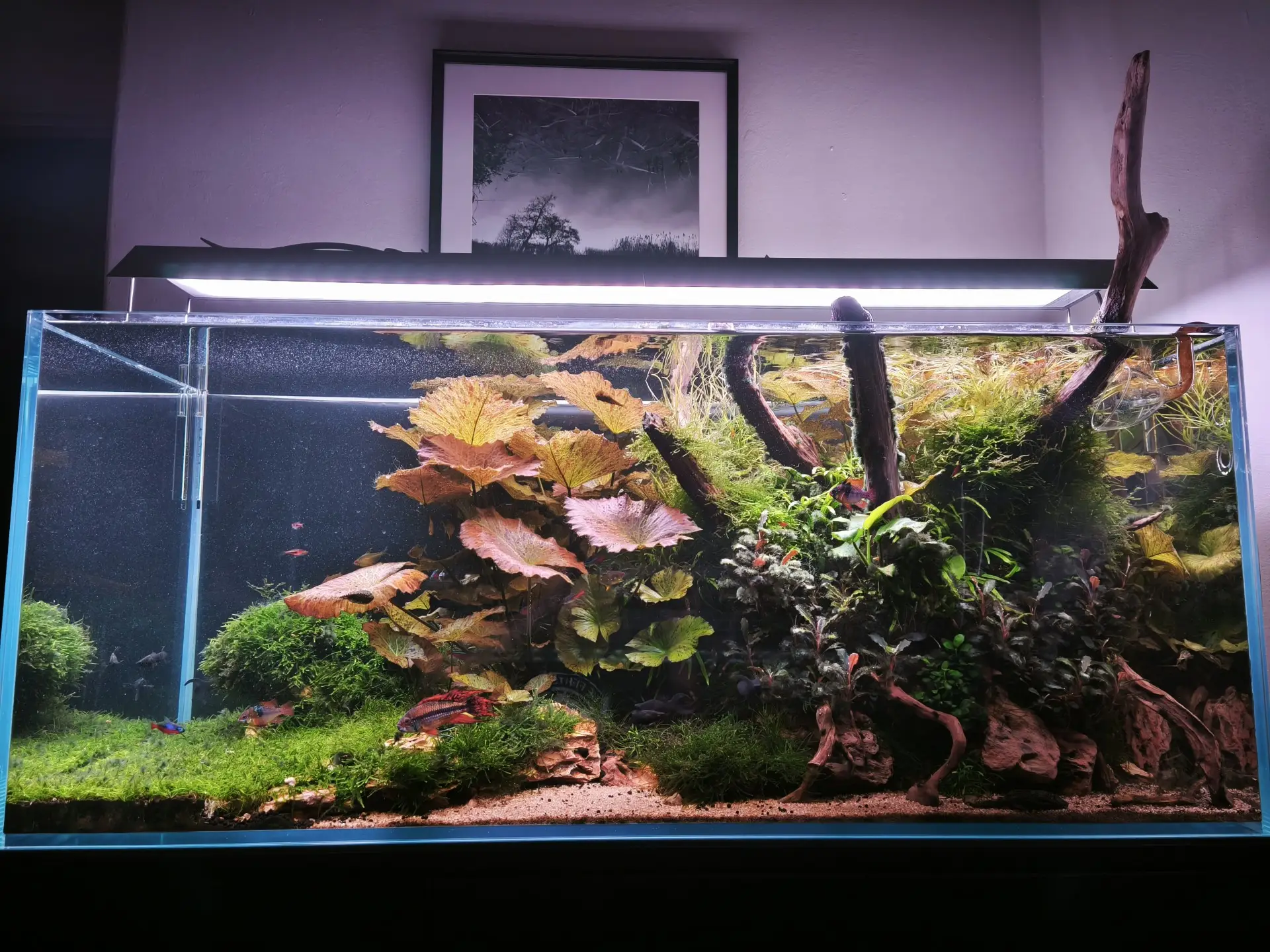 Popis: Po patnácti letech jsem se hlavně kvůli svému malému synovi vrátil k akvaristice a rovnou si splnil dávný sen. Akvárium, které pojme větší hejno neonek. Moje dosavadní největší akvárko byla padesátka a měl jsem v něm 15 červených neonek. Svého času jsem udržoval prezentaci na www.akvarko.cz/… s názvem Kouzlo červeného neonu. Tady je větší dvojka :-)