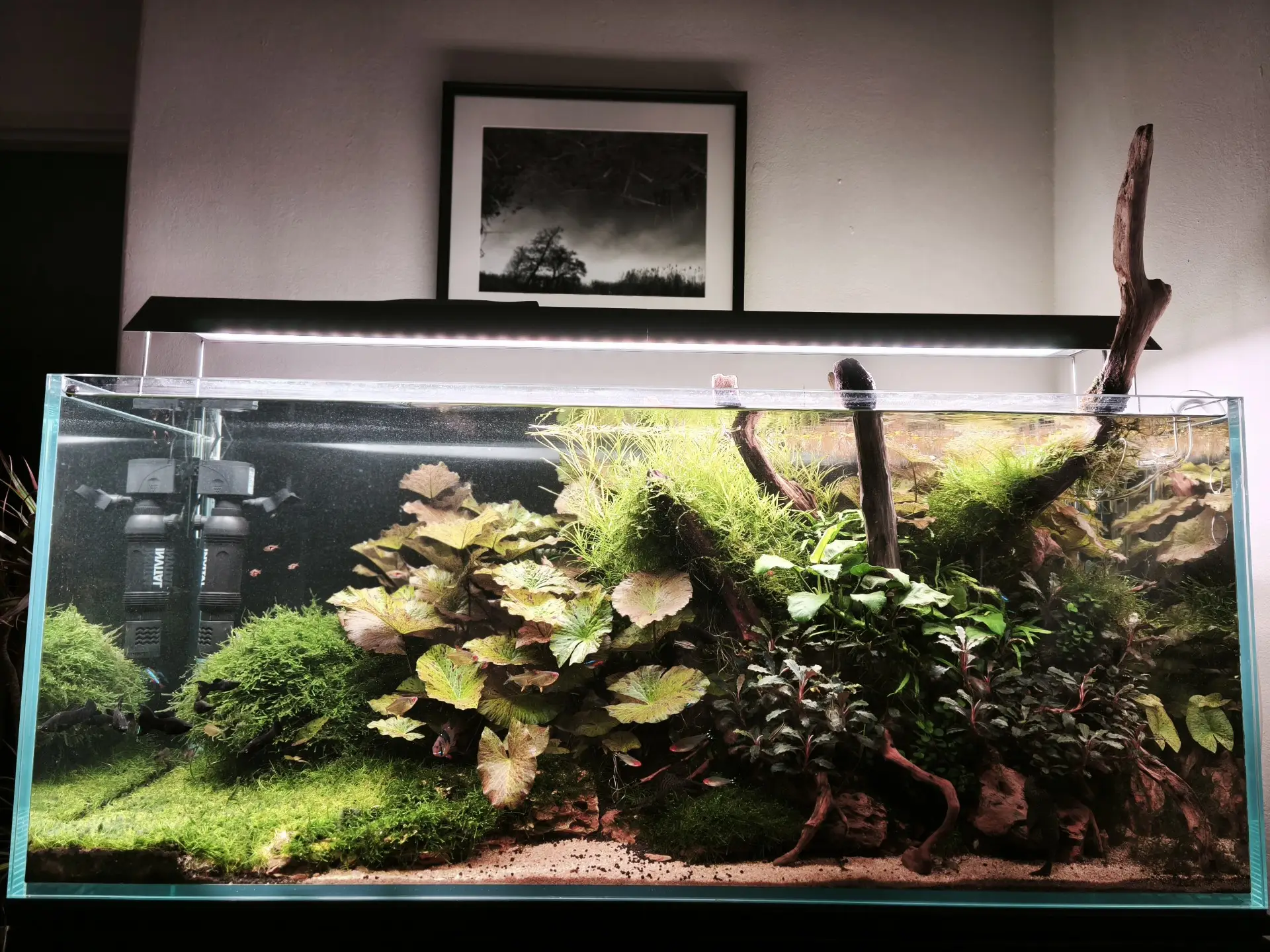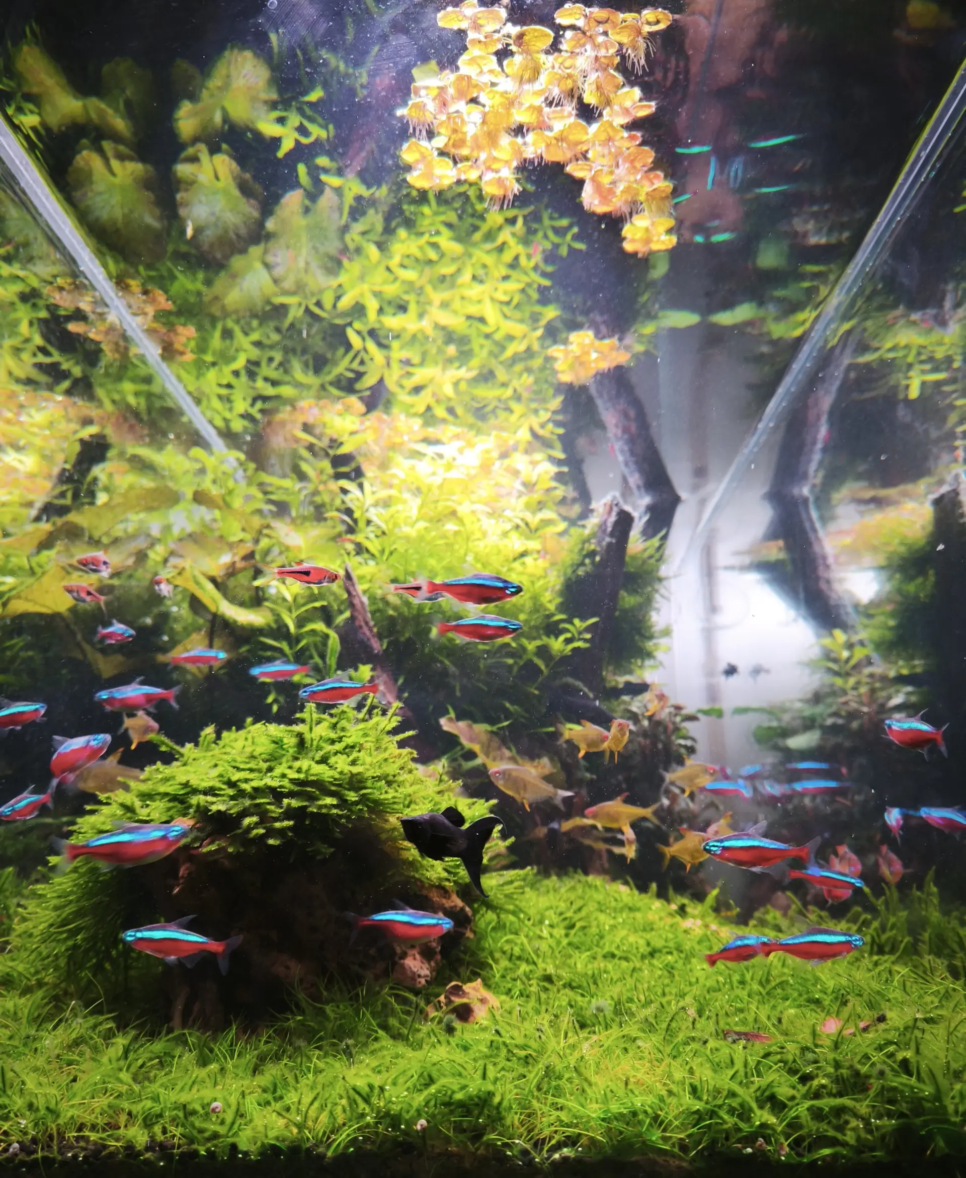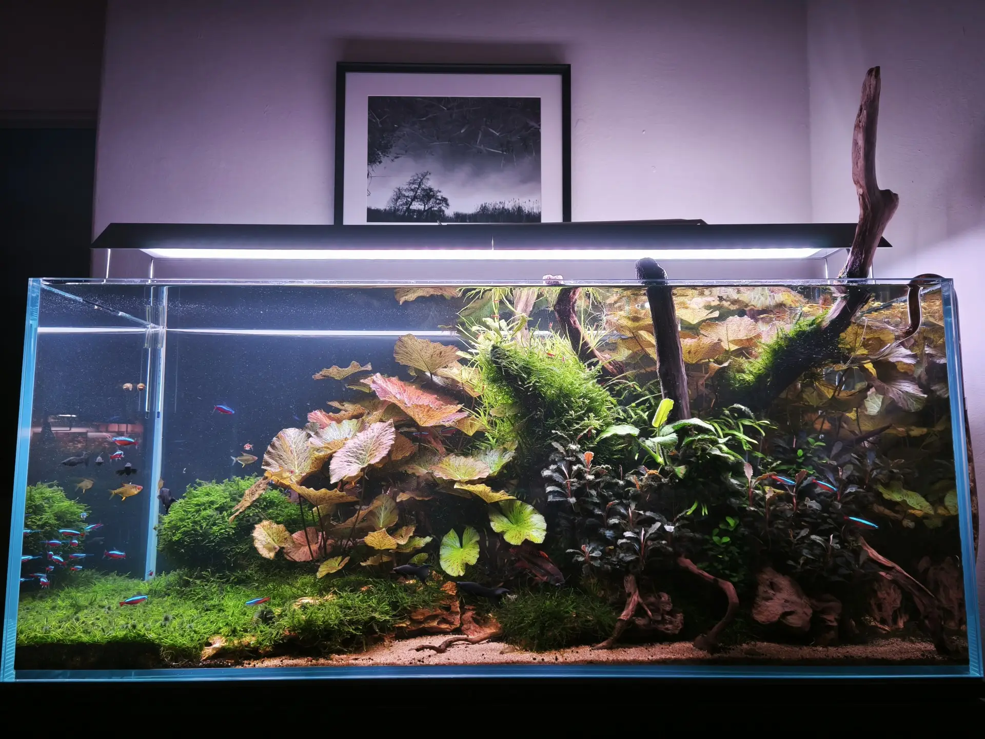 Popis: Po patnácti letech jsem se hlavně kvůli svému malému synovi vrátil k akvaristice a rovnou si splnil dávný sen. Akvárium, které pojme větší hejno neonek. Moje dosavadní největší akvárko byla padesátka a měl jsem v něm 15 červených neonek. Svého času jsem udržoval prezentaci na www.akvarko.cz/… s názvem Kouzlo červeného neonu. Tady je větší dvojka :-)