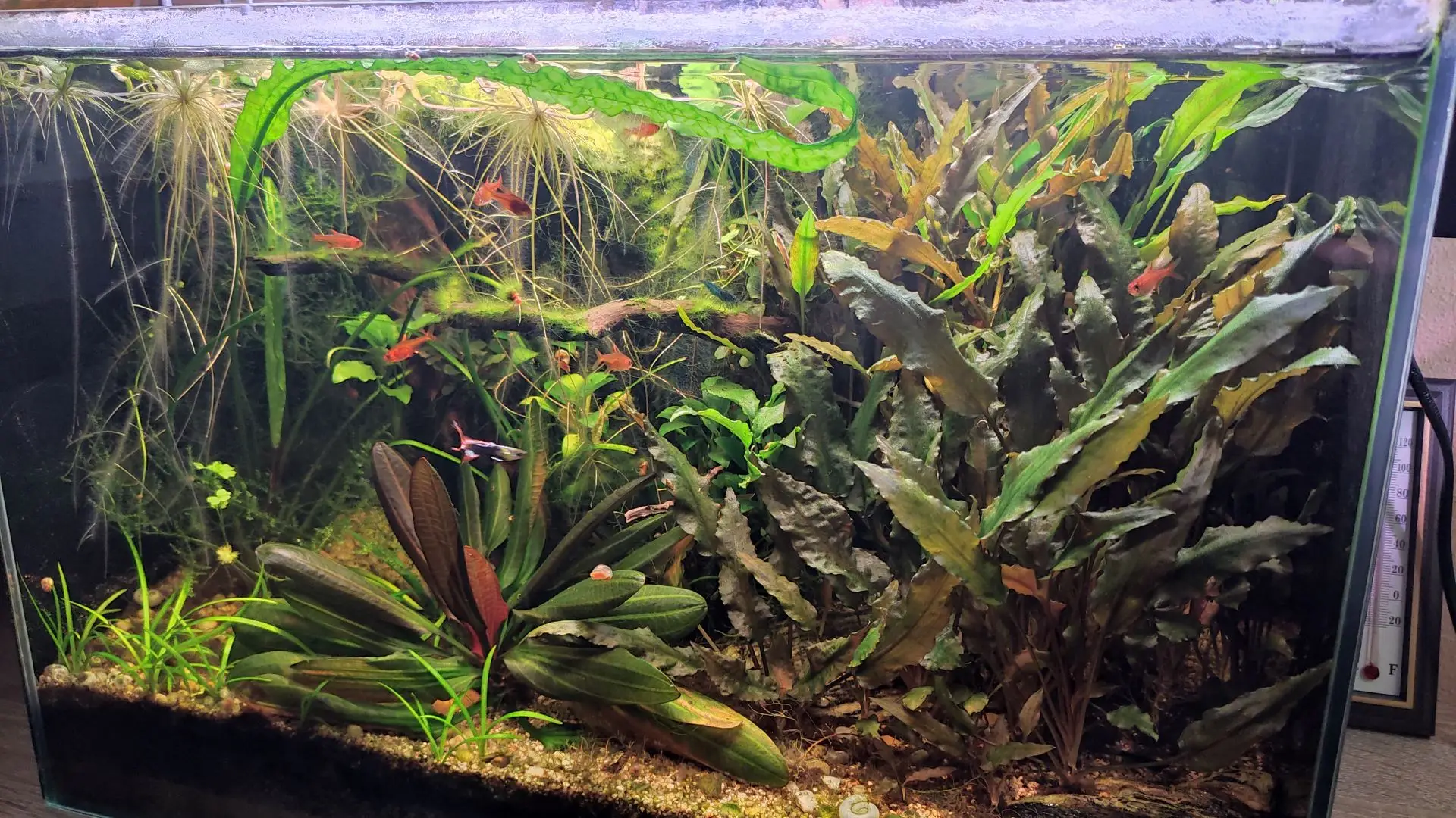 Popis: Plne osadené rastlinami (echinodor, kryptokoryny, sagitaria, anubias, bucephalandra, hydrocotyle atd.) Ryby: Tetry Ohnive, Razbory kubotai, otici, jeden Stukovec + krevetky a slimaci