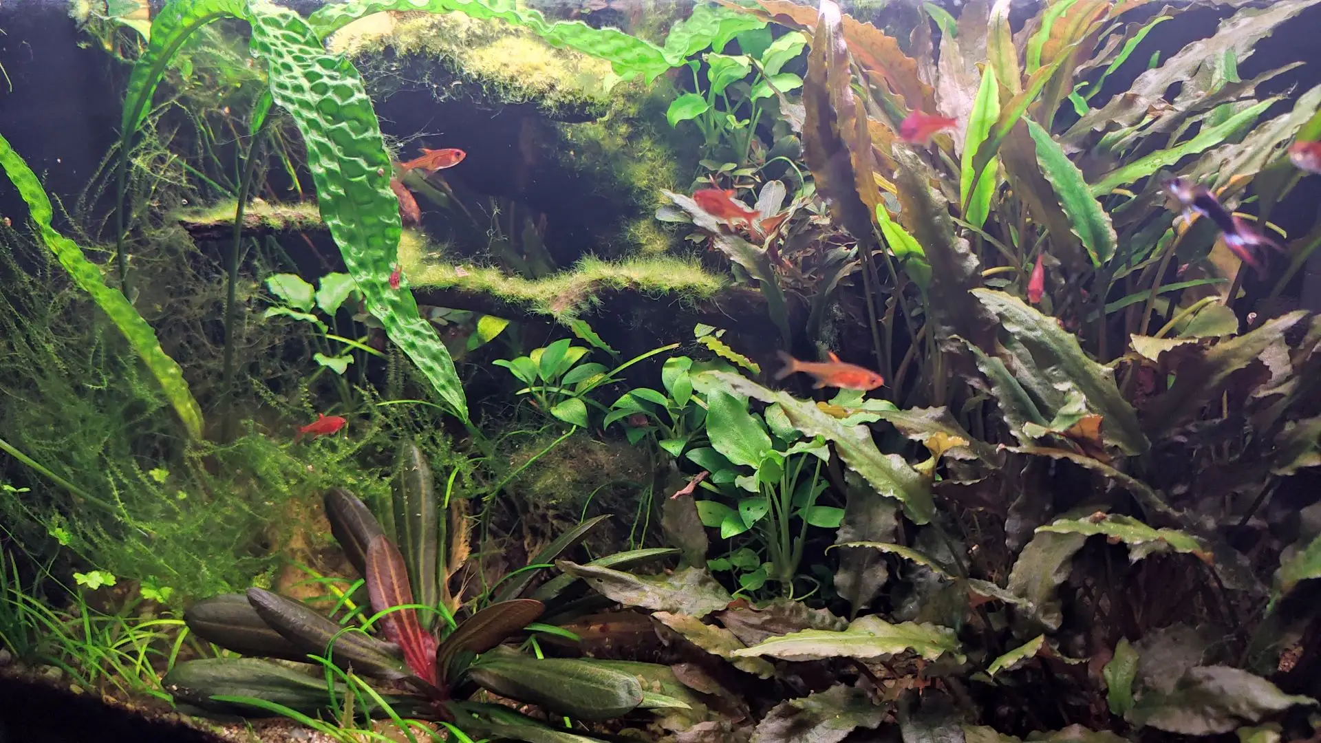 Popis: Plne osadené rastlinami (echinodor, kryptokoryny, sagitaria, anubias, bucephalandra, hydrocotyle atd.) Ryby: Tetry Ohnive, Razbory kubotai, otici, jeden Stukovec + krevetky a slimaci