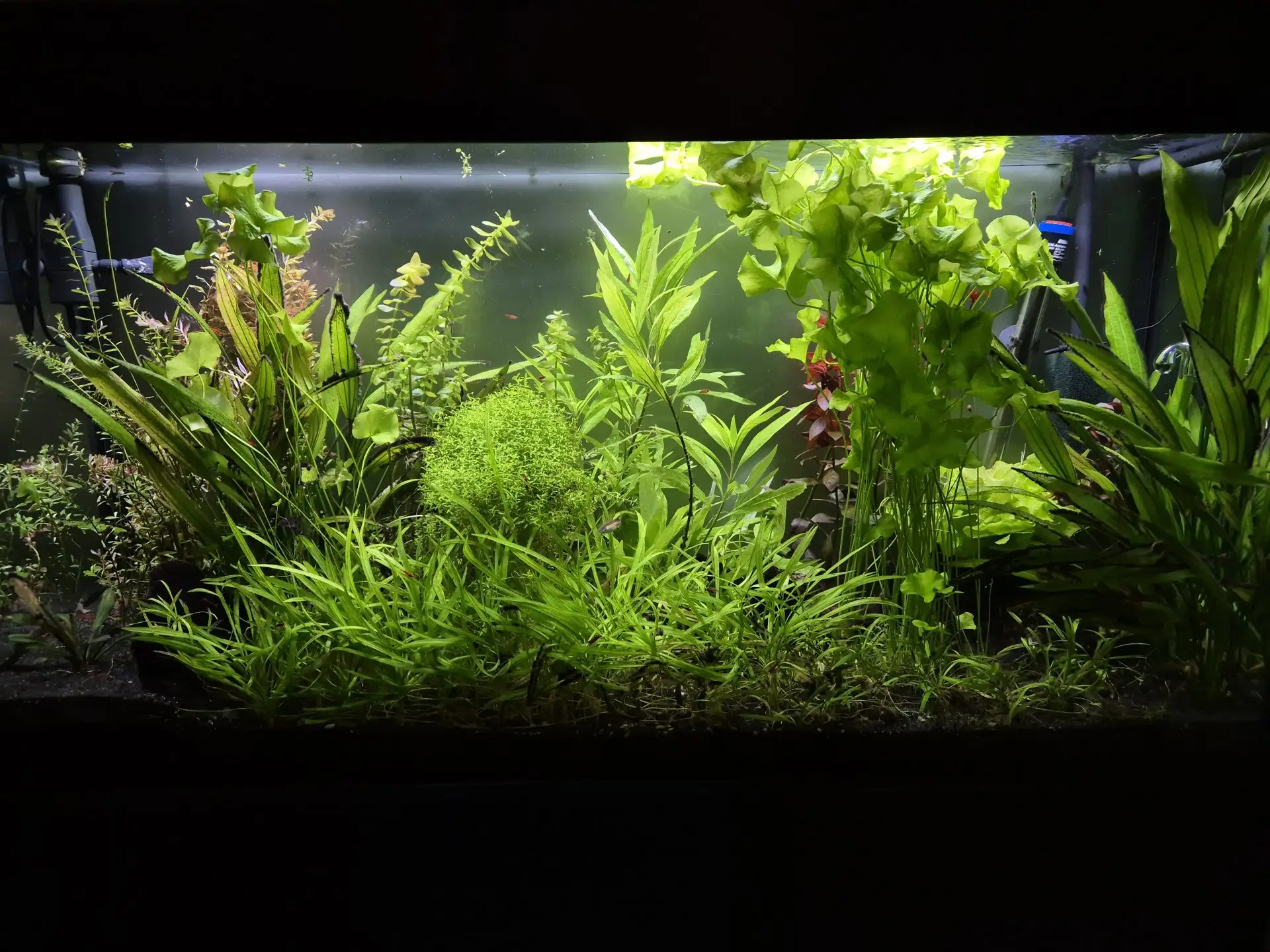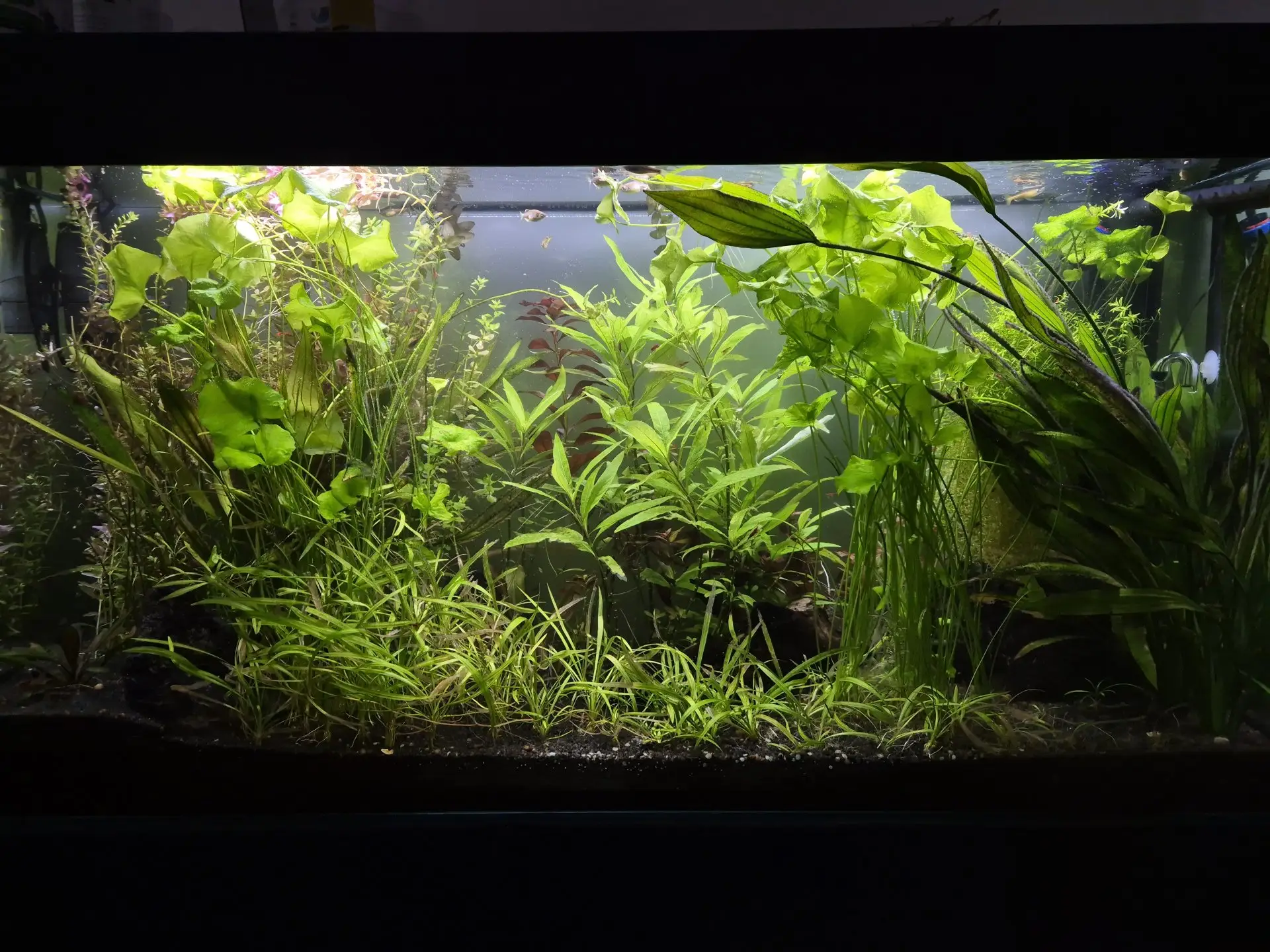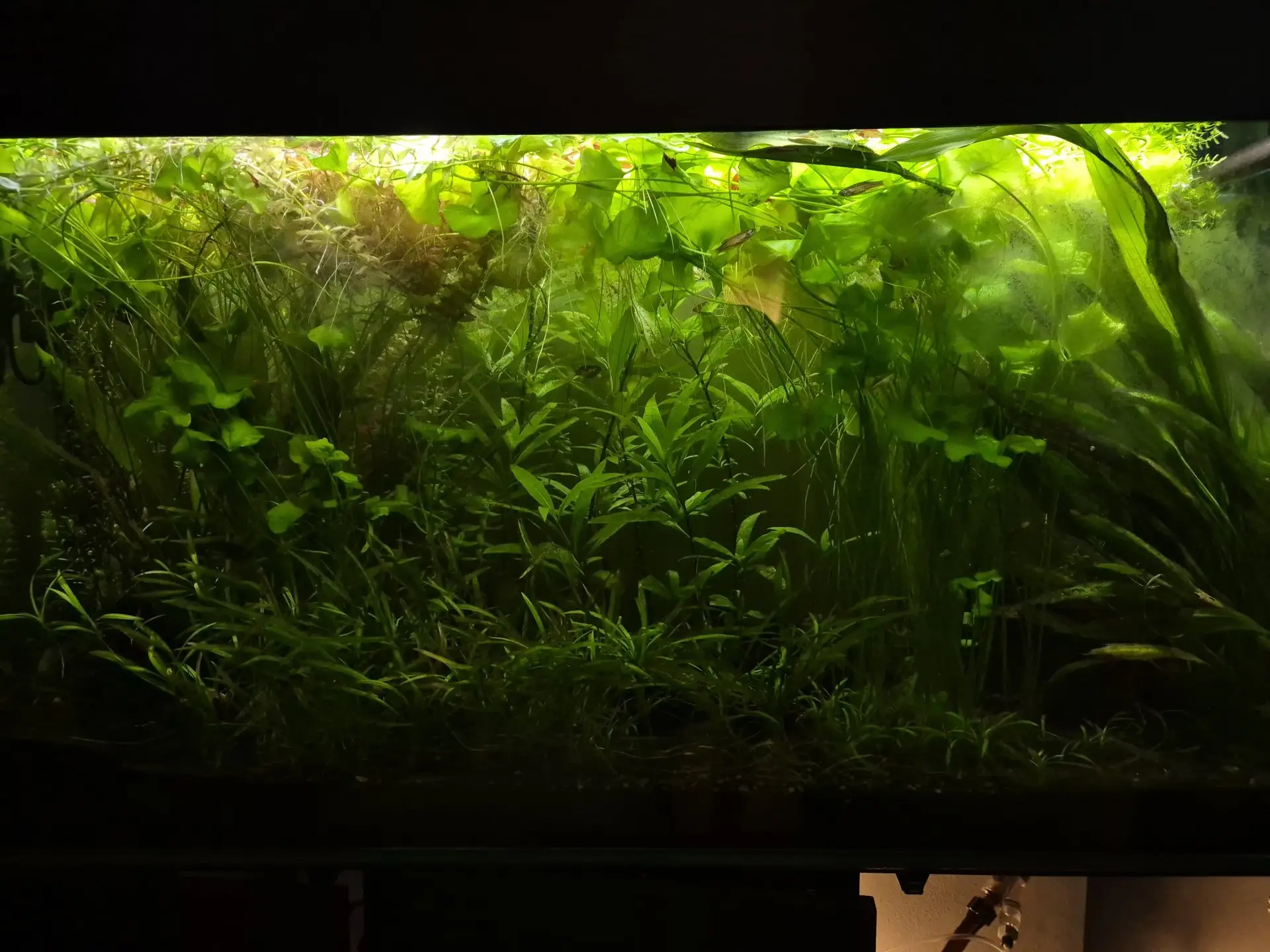 | 12 6.2025 | Po dlouhé době záznam. Spíše shrnutí, už poměrně dlouhou dobu je situace výrazně lepší. Méňě řas, ty co jsou tak na ústupu, rostliny rostou jako divé. Krevety se dál množí. Spokojenost Hnojení, přechod z profito na už komplet invital tedy na FEROX, KALI spíš do počtu, NO3 + PO4, vše jednotlivě. Feroxu 5 ml za den, KALI 1 ml, Nitro 2 ml, PO4 2 ml. CO2 opět jsem se vrátil zpět pouze k denním dávkování COčka z předtím nonstop a to z důvodů přechody na in-line atomizér oproti vnitřnímu difuzoru, ten měl myslím problém to roznést po celé nádrži, když je takto zakomponováno na vývodu z filtru tak i dle rychlejší reakce dropcheckeru po ranním zapnutí jde poznat že rychlost nasycení zvládne za cca 1-2 hodin po zapnutí. Je to už tak měsíc dva a zatím vše ok, takže u toho zústanu. Zároveň jsem teď měnil vodu až po 3 týdnech, kdy na skle ani nebylo řasy až tak moc, takže ok, ale už bylo vidět že vata ve filtru byla kaput a zpomalený průtok. Měněno 50%. Rostliny obzvlášť rotaly s leknínem poměrně rychle zarostou celou hladinu a je tam pak tma, takže docela razantní prostřihy a i tak nemají problém zase dorůst. Ostatní květenstvo roste taky hezky, jde vidět že např. kleiner bar v rohu ve stínu se tedy téměř zastavil růstem, před dlouhou dobou jsem vedle něj do hlíny píchnul nějaké ty tableto hnojiva, ale, řekl bych že mu chybí světlo, protože dřív rašil jeden list za druhým, ale to nevadí. Hygro corymbosa moc pěkná není, ale začíná se zlepšovat poslední týdny. (Chvíli jsem hnojil feroxem asi 8 ml a pak jsem snížil na 5 ml, takže to se chvíli líbilo černé řasy, a mám pocit že krevety mají docela hlad a žerou i tu černou řasu, ale až tak hladově že to vytrhávají z listů, které jsou pak děravé - spekulace). Teď už se to neděje tak kdo ví. Ludwigii mám strach stříhat tak ji vždy jen ohnu stonek a narvu zpět do substrátu a zatím prostě roste dál, stonek pak sice odhnije, ale nějak to funguje. Později přidám nové foto. |