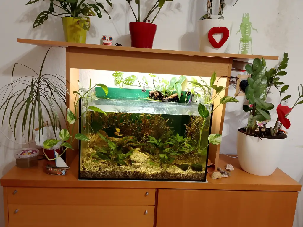 Filtrace: nooo ty pokojovky za sklem by jako vedlejší efekt mohli využít rybí ee jako hnojivo a tím kvalitě vody pomoct ne? Poháněno čerpadlem Sunsun HJ-111, 200 l/h, u vstupu spíš pro pocit plastová drátěnka