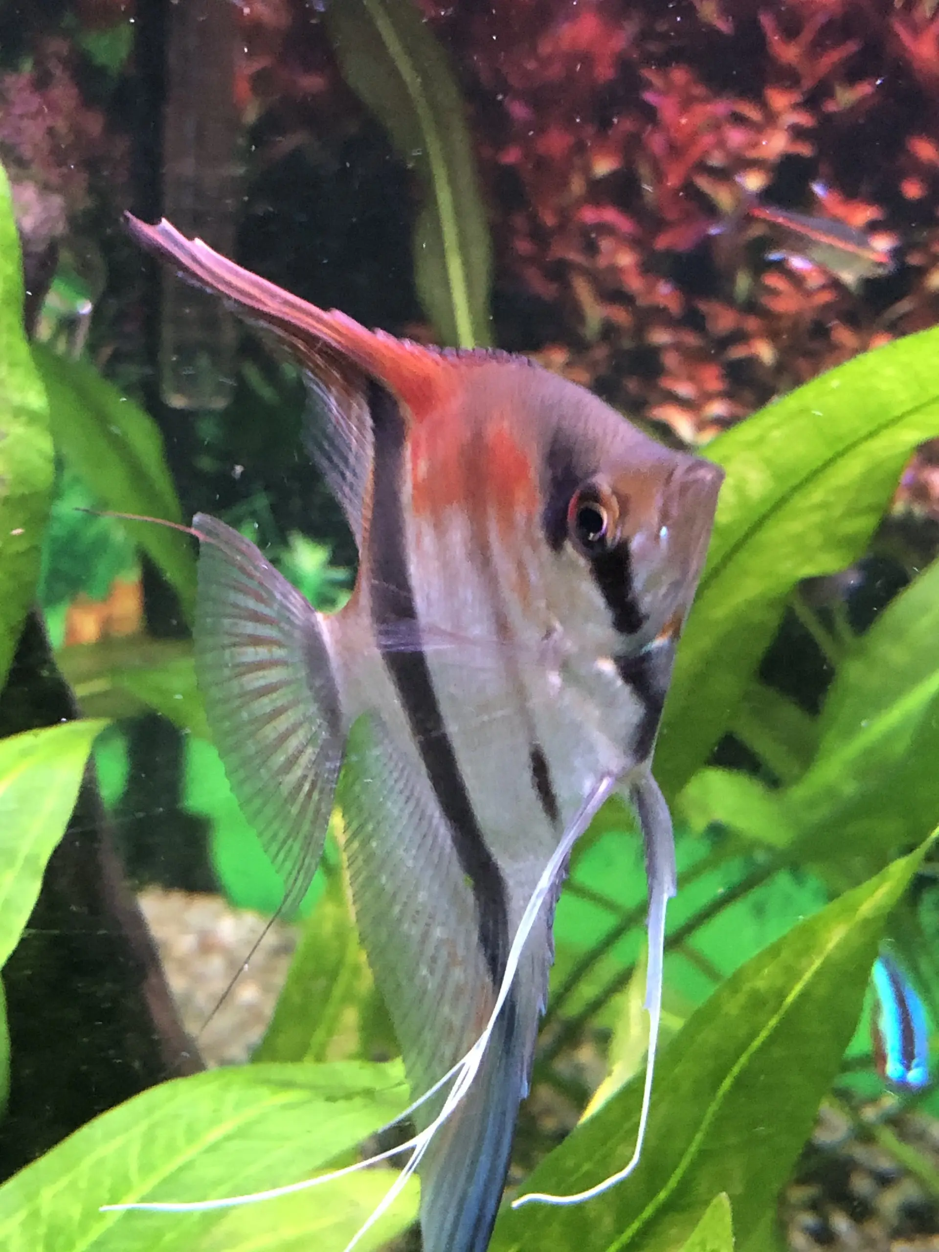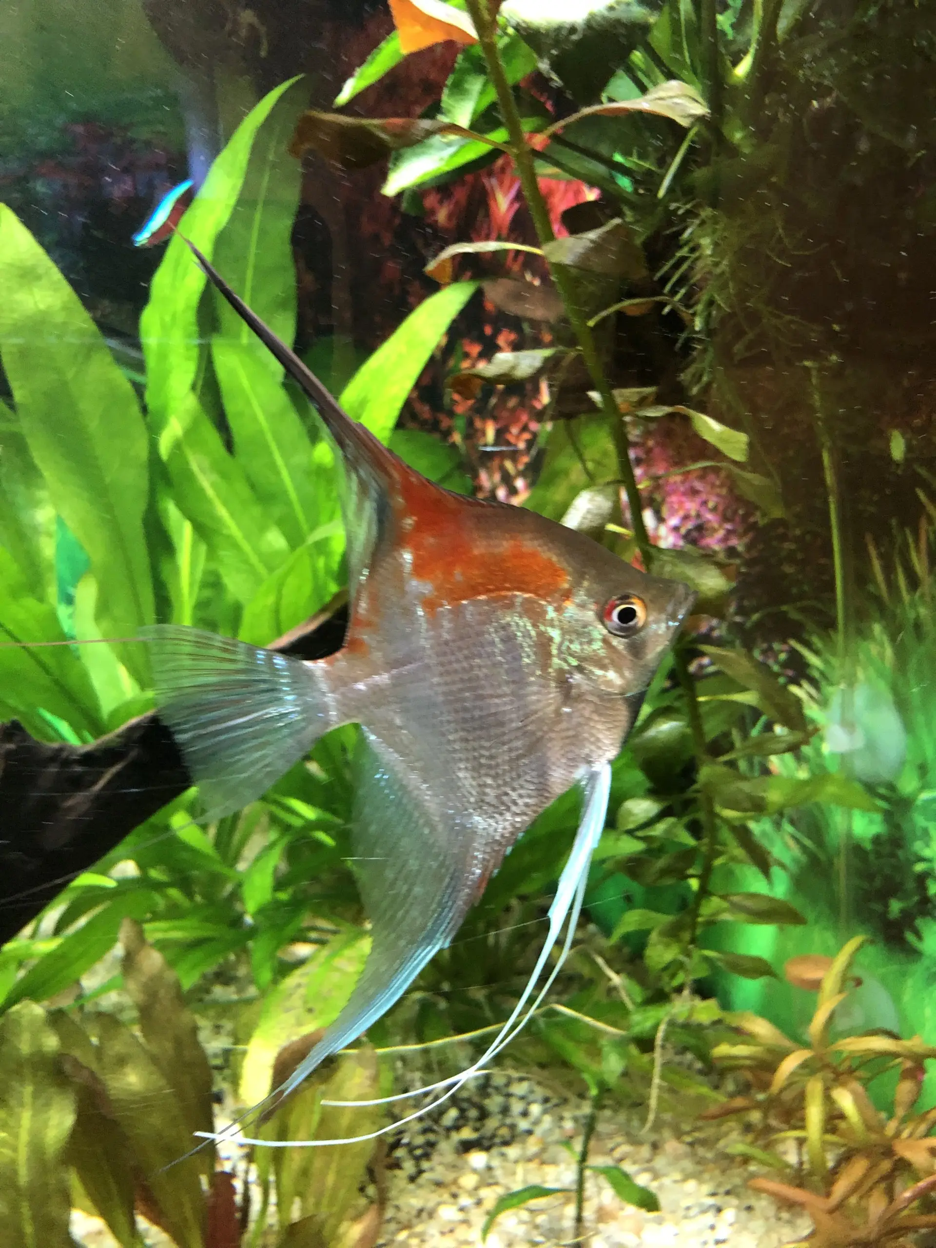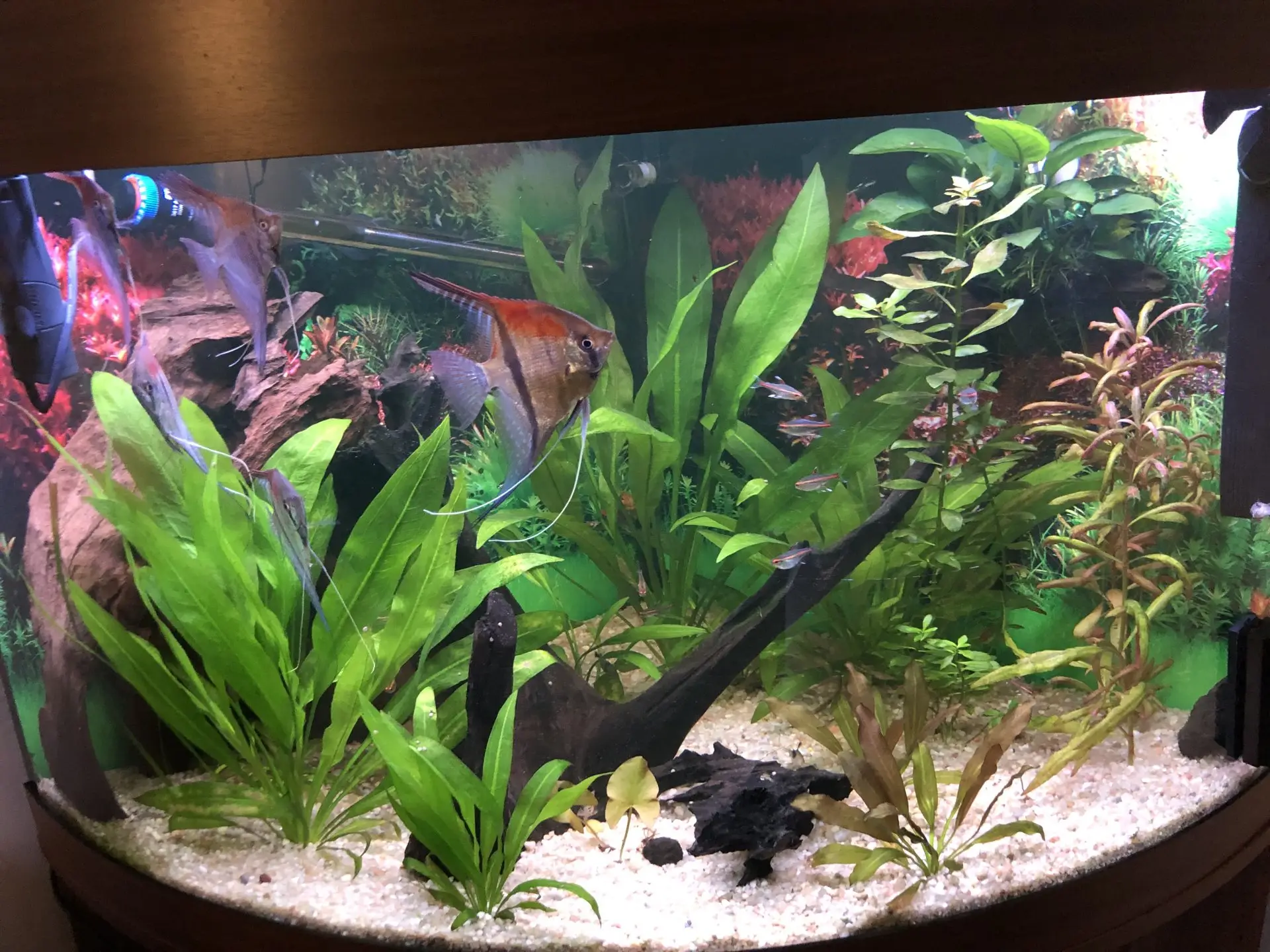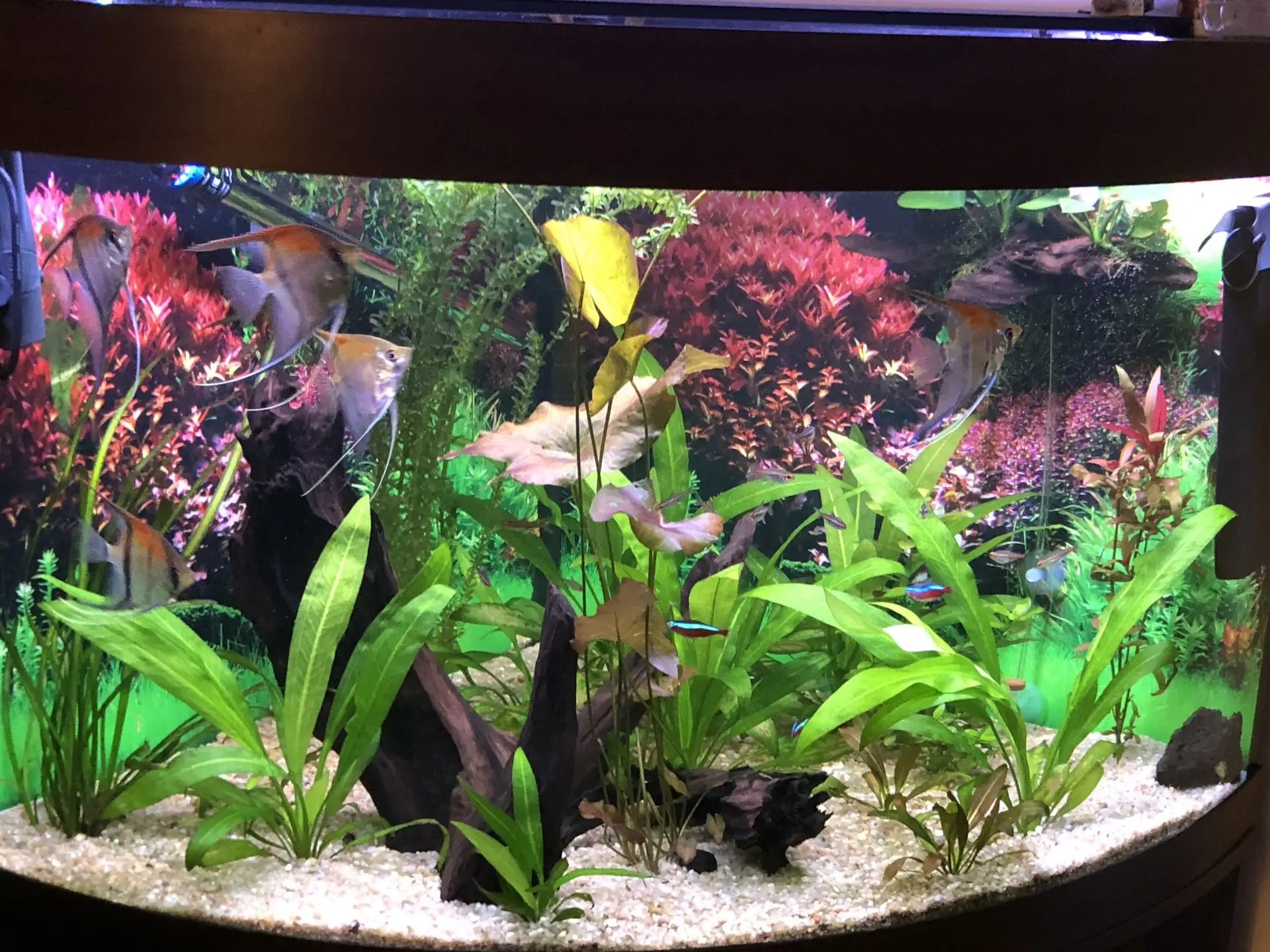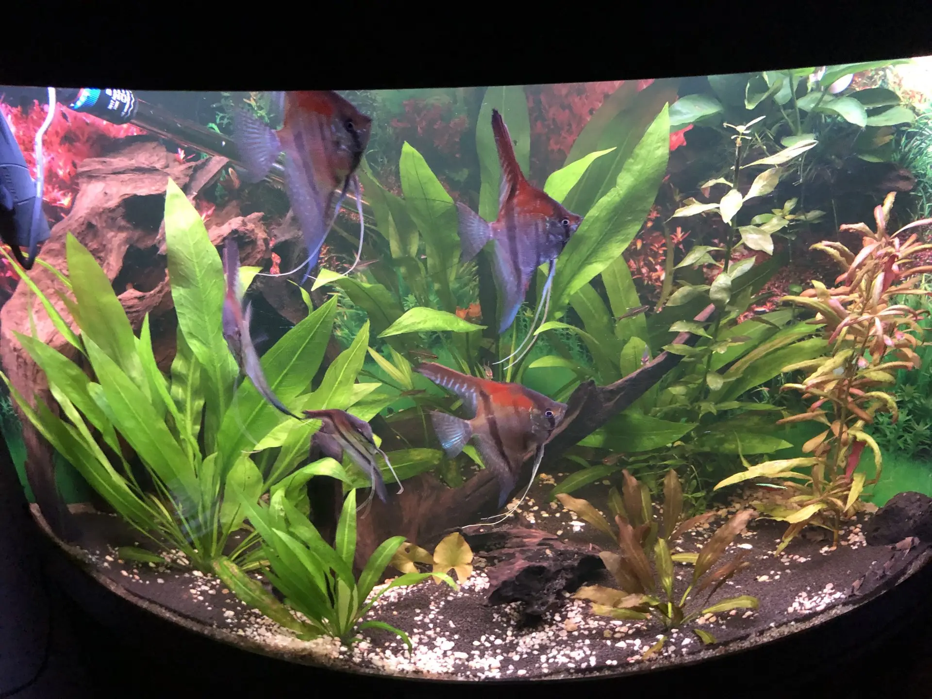 Dnes provedena údržba. Na dno jsem při té příležitosti nasypal / rozsypal jemný černý písek, za účelem a snahou, aby skaláry byly v tmavším prostředí a ukazovaly více pruhy. Snad to zabere.