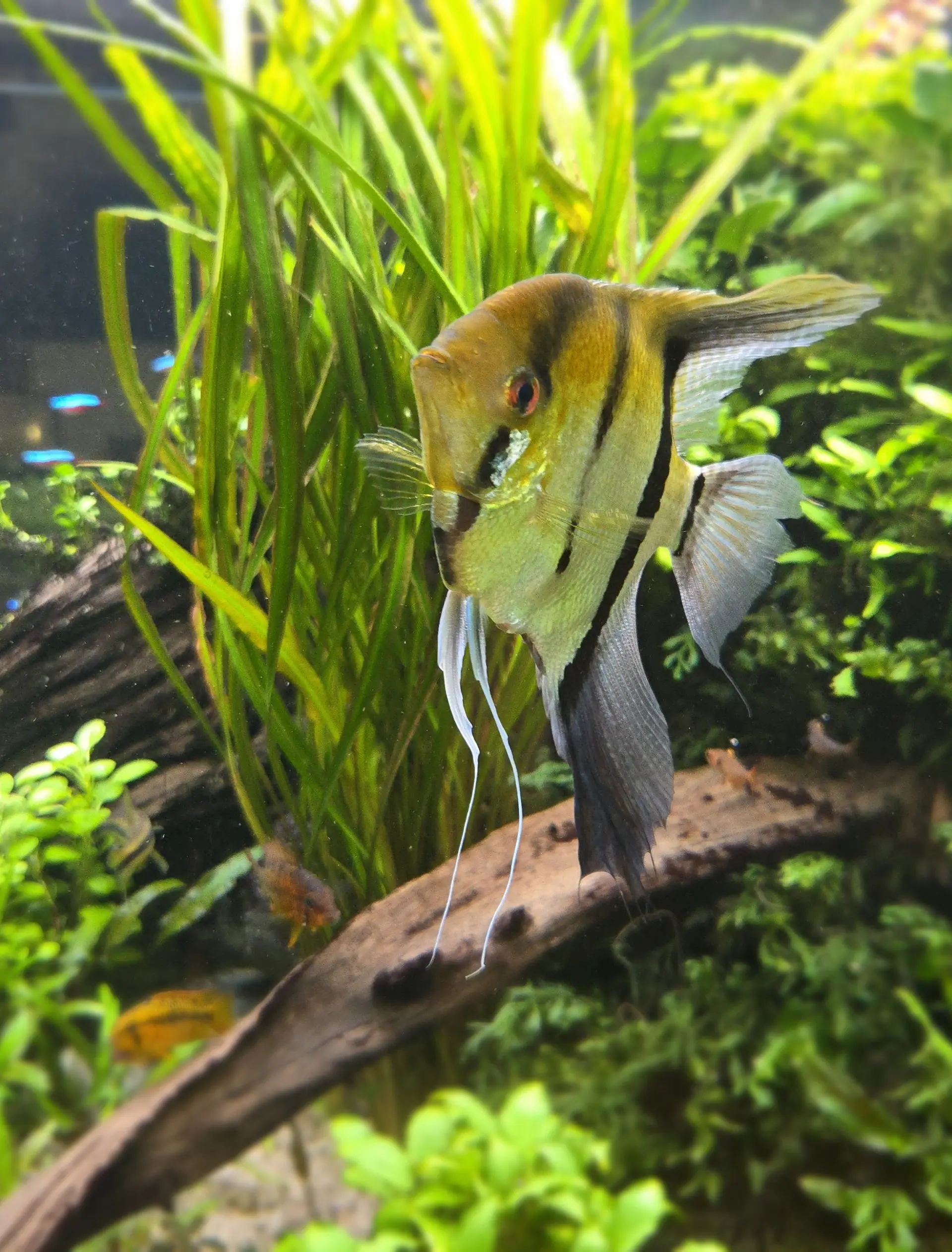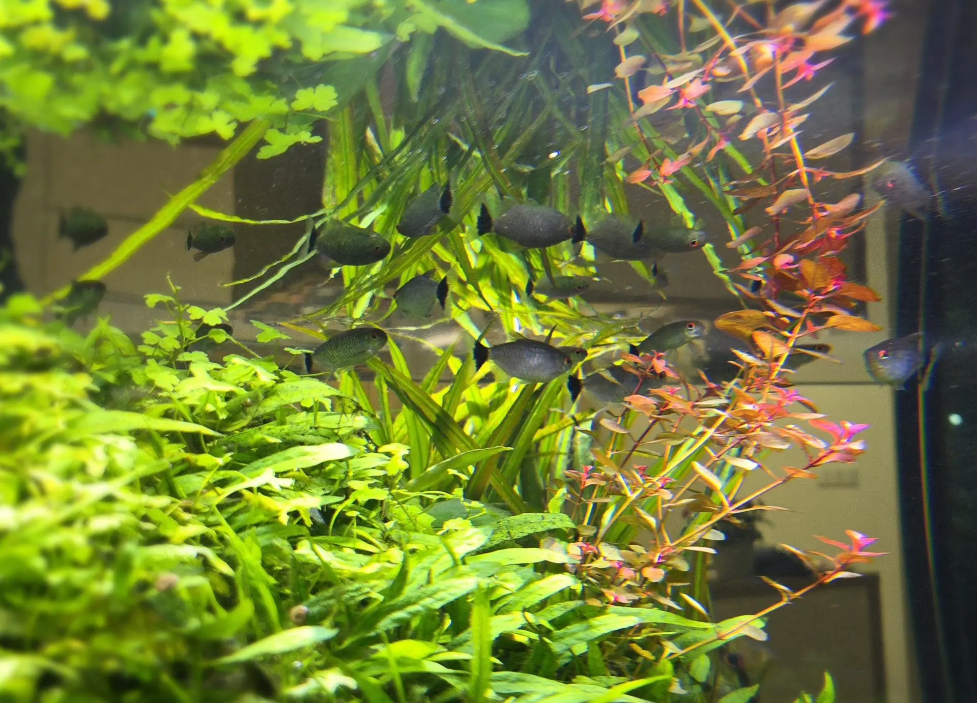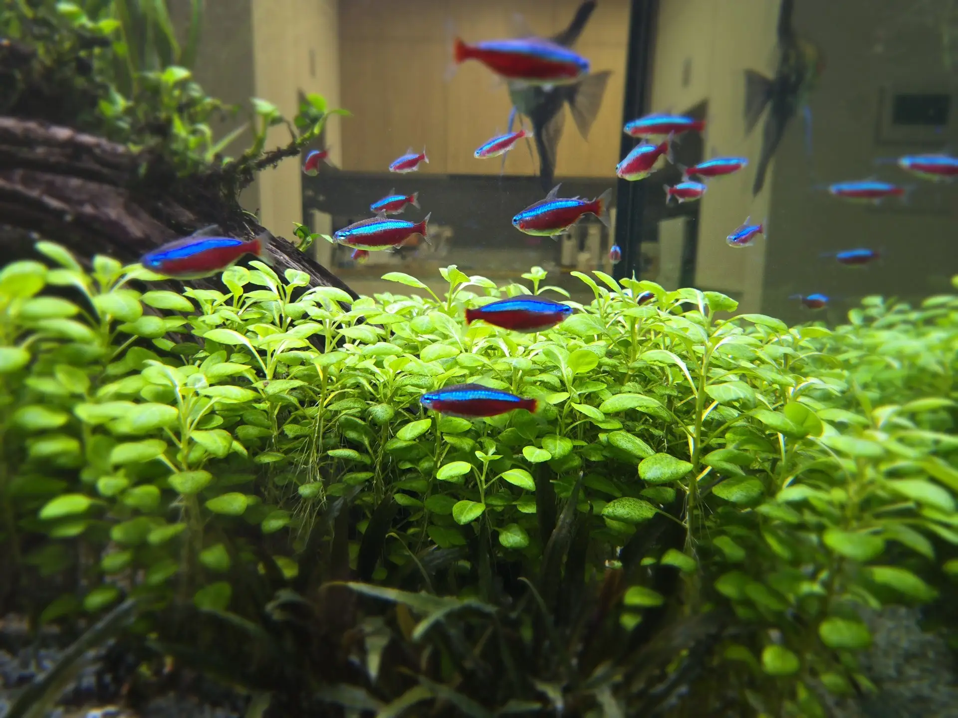 Dekorace: Velký centrální útes z kořenů a kamenů dominantně osázený Microsoriem, aby se rybky cítily i přes umístění v prostoru dobře