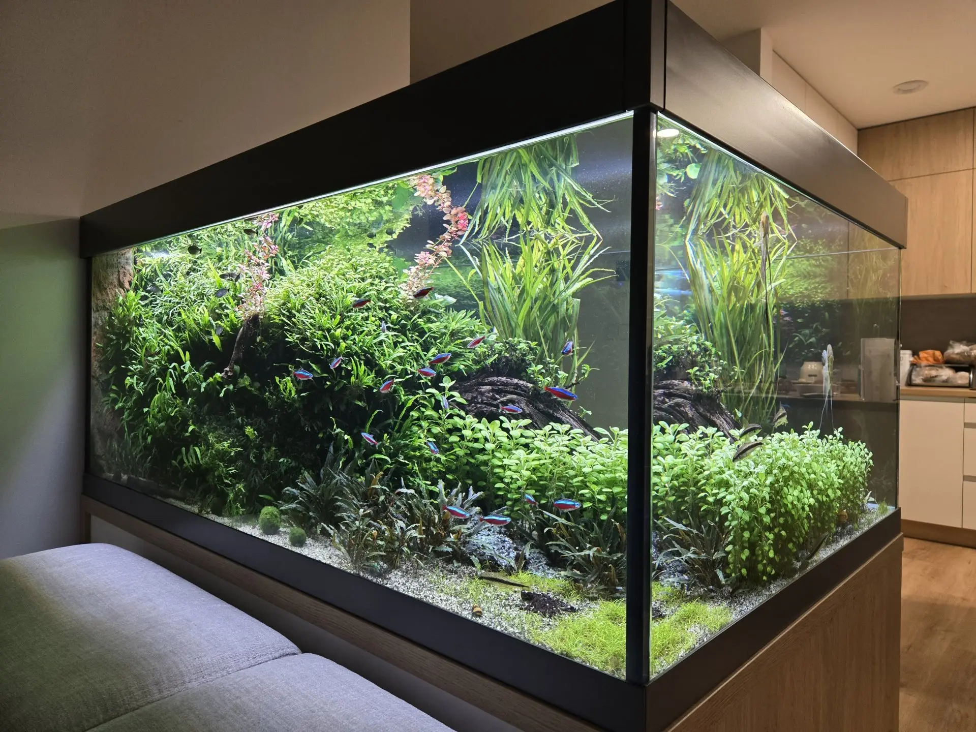 Popis: Do nového domu jsem si jako radost pořídil nové velké akvárium, po zkušenostech s předchozím rohovým 350l akváriem jsem se rozhodl pro 900l, které tvoří předěl mezi kuchyní a obývacím pokojem. Moje představa byla vytvořit velký svět pro malé rybky. Snažím se taky vyhovět představě mé ženy, aby dominantou našeho nového domu nebyla žumpa